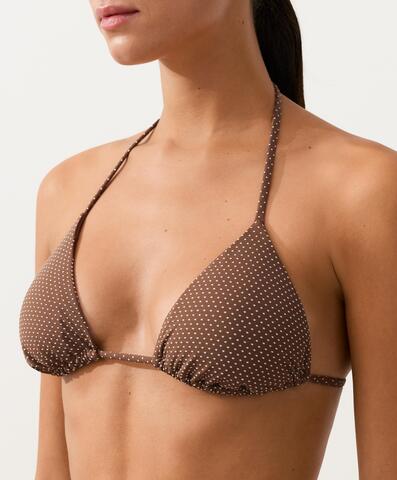 Топ бикини с треугольными чашками и принтом в мелкий горошек, без косточек и со съемными вкладышами. Тонкие регулируемые бретели и завязки на спине.