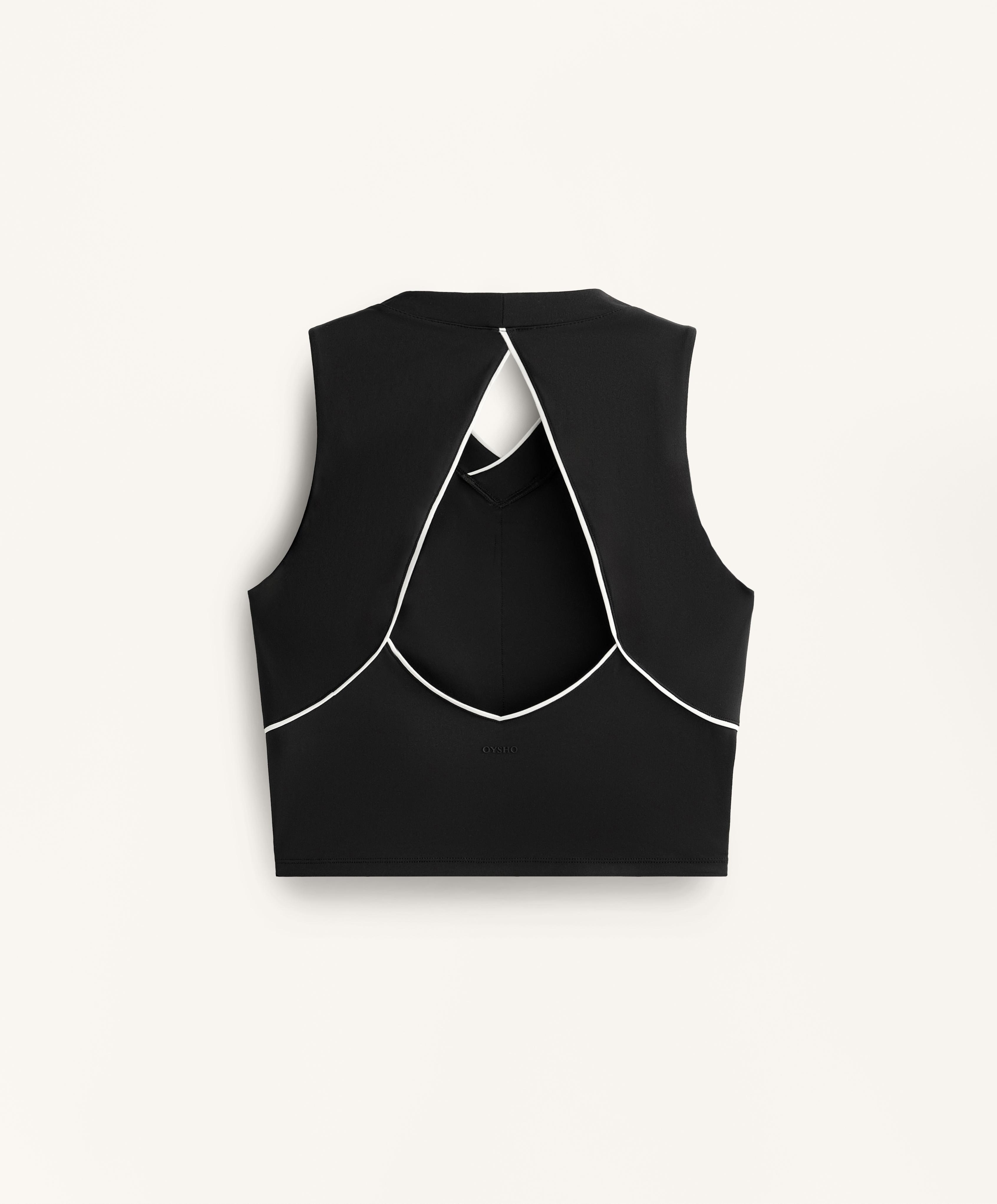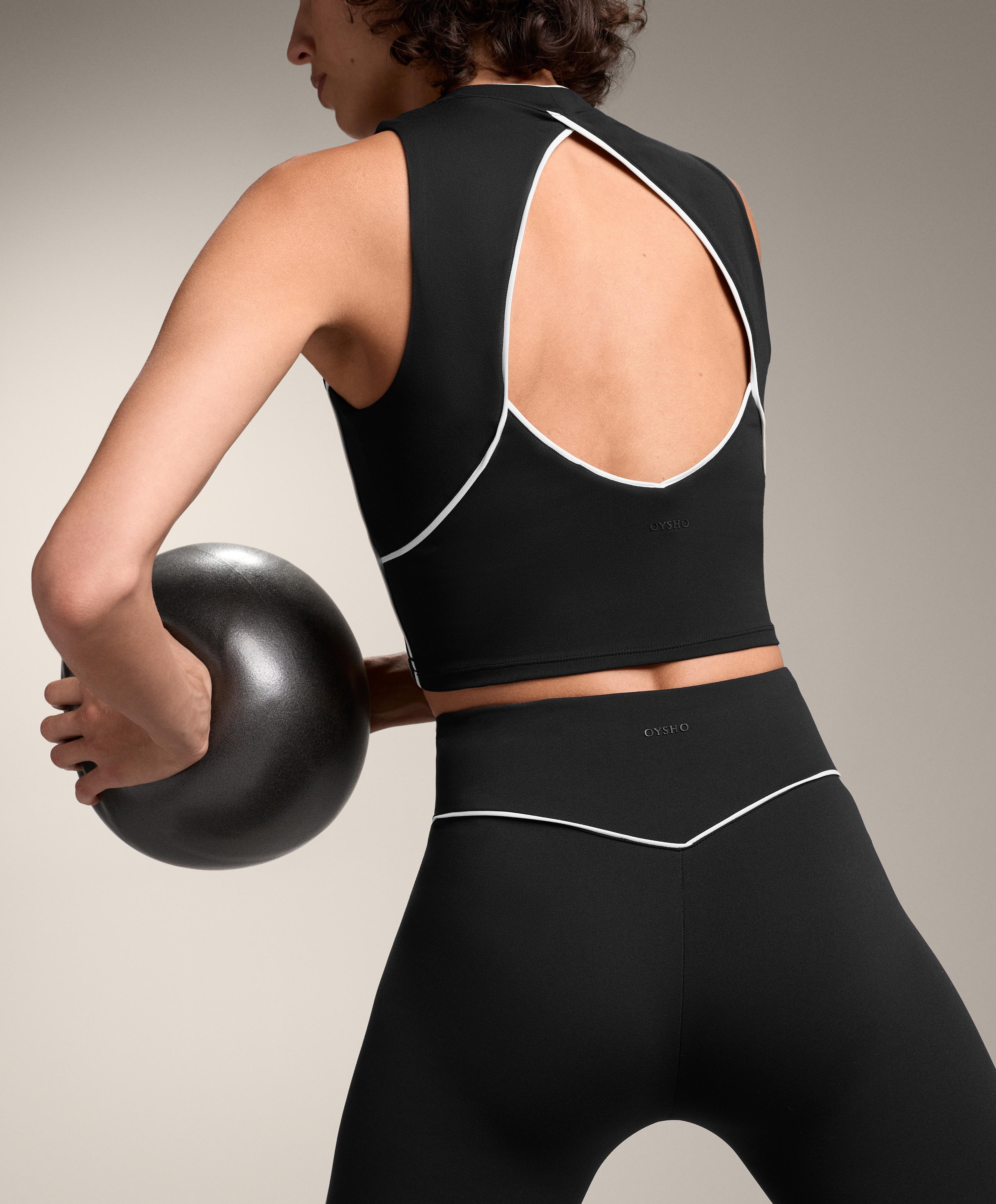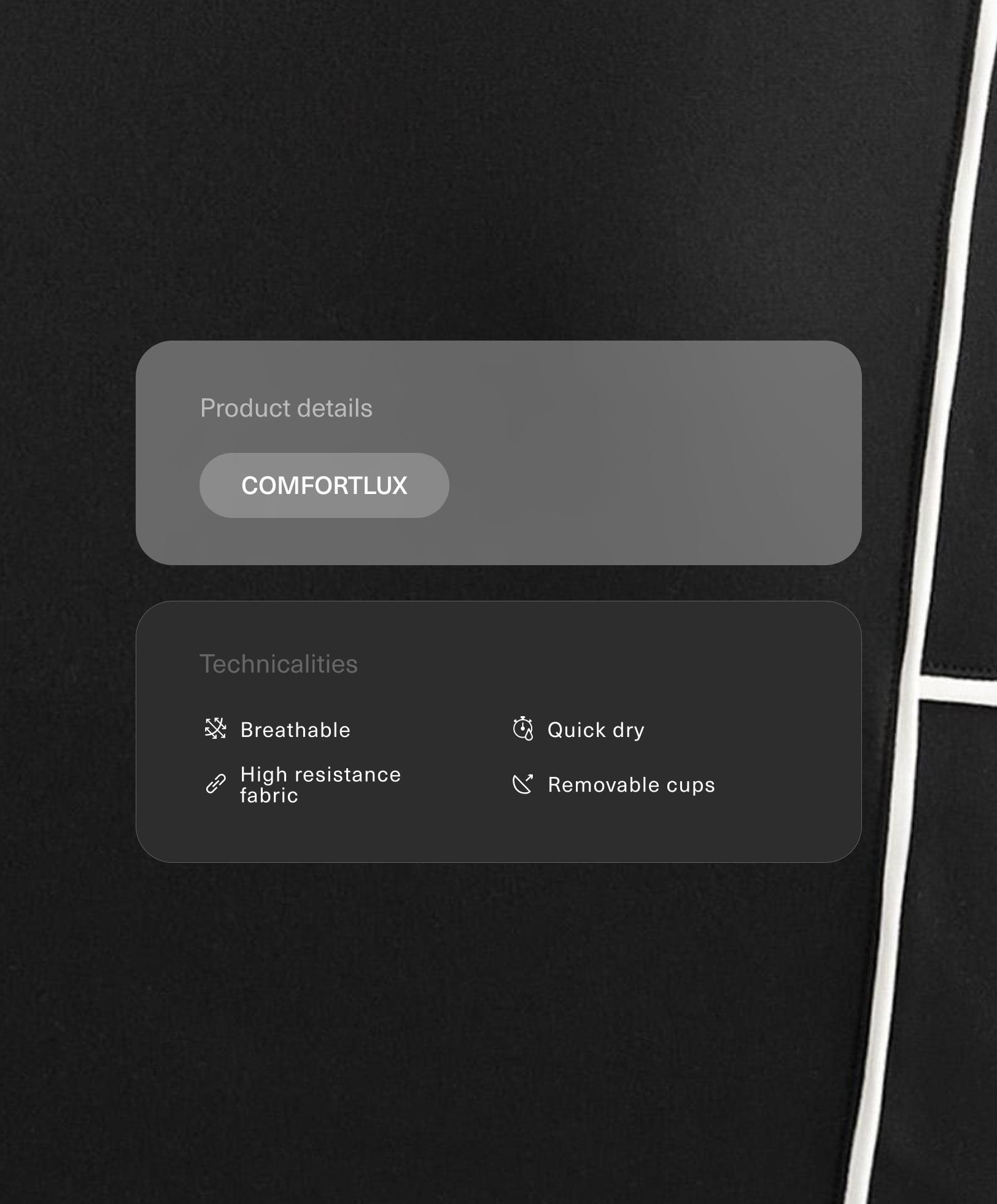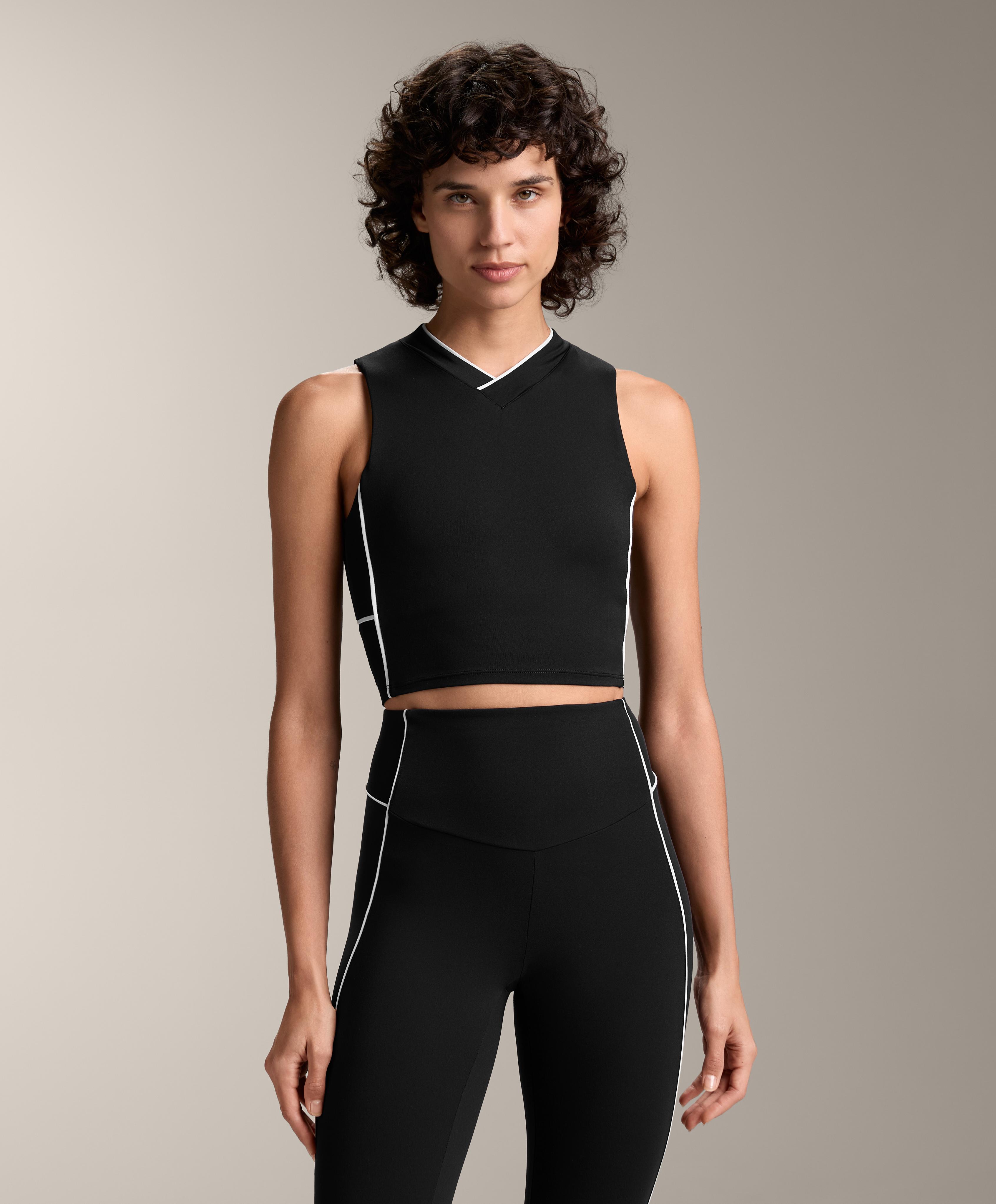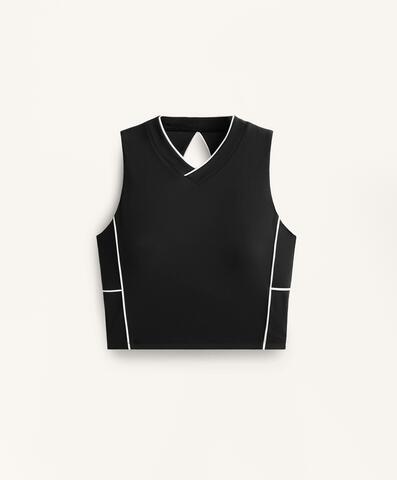 Майка Comfortlux со встроенным бюстгальтером и съемными чашечками со слегка уплотненными чашками. Декоративная отделка кантом. V-образный вырез и открытая спинка. Дышащая, высокопрочная и быстросохнущая ткань.