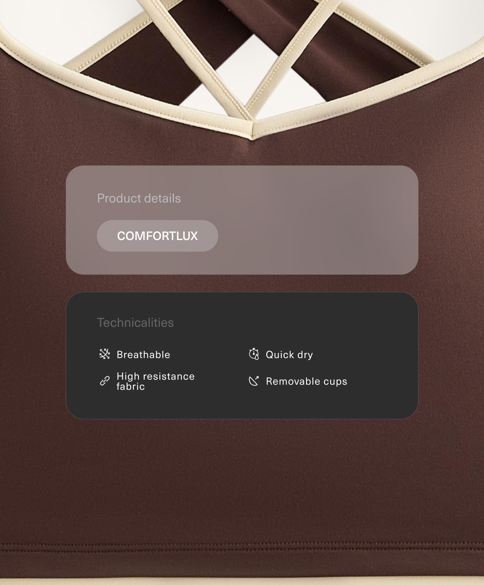 Топ Comfortlux со встроенным бюстгальтером и съемными чашками с легкой подкладкой. Контрастная окантовка и перекрестная спинка. Дышащая, высокопрочная и быстросохнущая ткань.