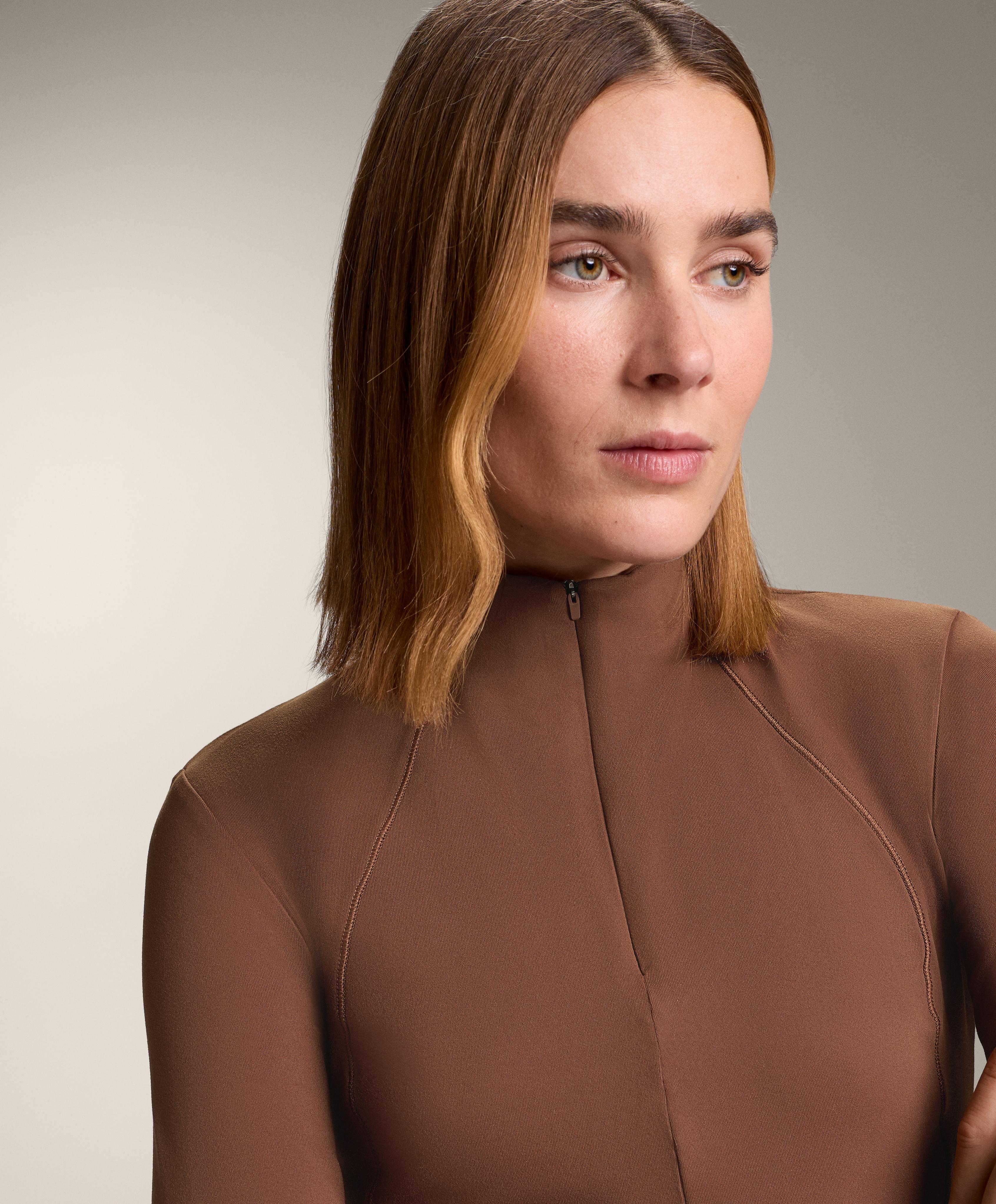 Майка Evermove с длинными рукавами, встроенным бюстгальтером и съемными чашечками со слегка уплотненными чашками. Застежка-молния спереди до уровня груди. Дышащая и очень прочная ткань.
