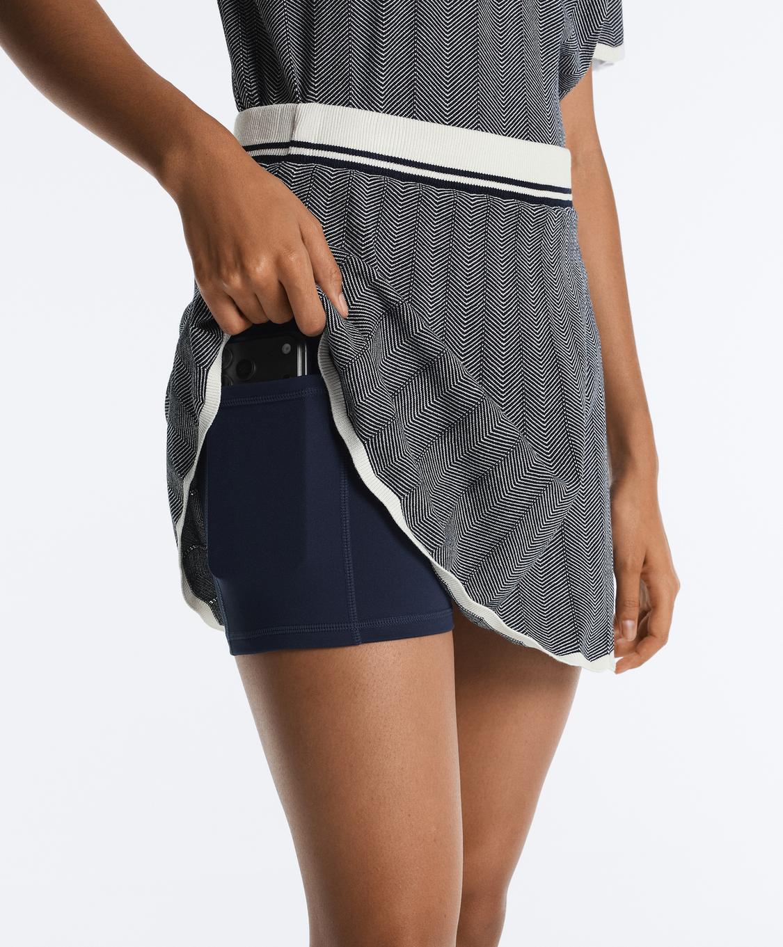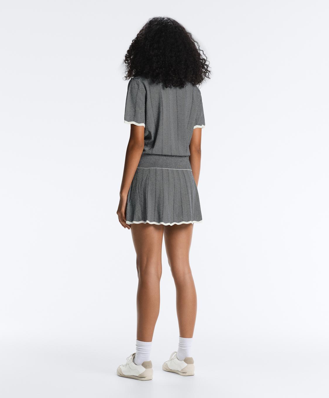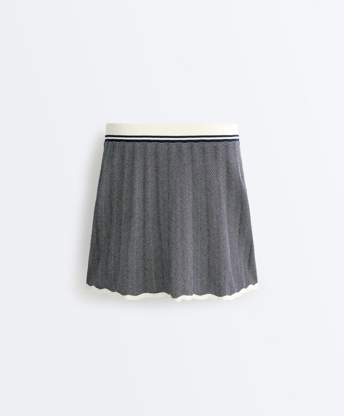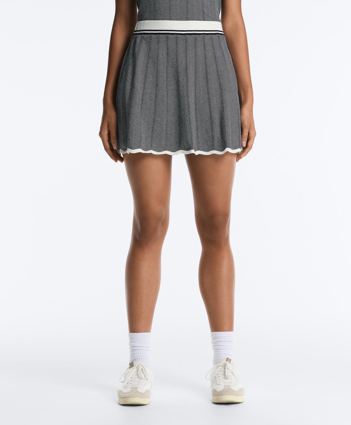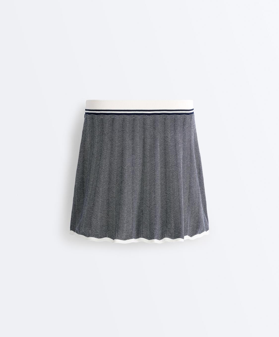 Плиссированная трикотажная короткая юбка с внутренними шортами и регулируемым эластичным поясом. Узор «елочка» и контрастные детали на поясе и подоле.