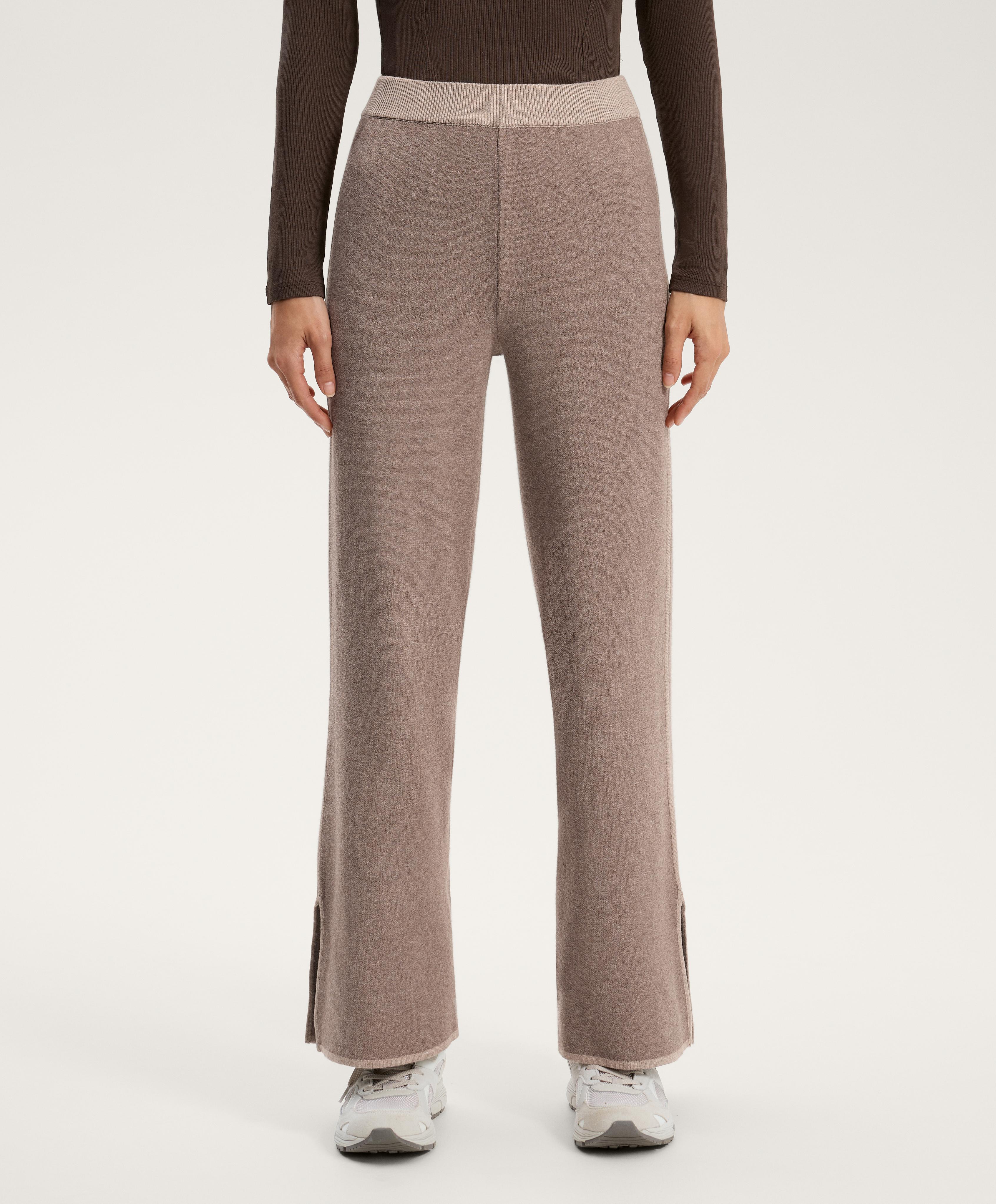 Прямые трикотажные брюки. С контрастной окантовкой на поясе и по бокам. Регулируемый эластичный пояс и боковой разрез внизу.