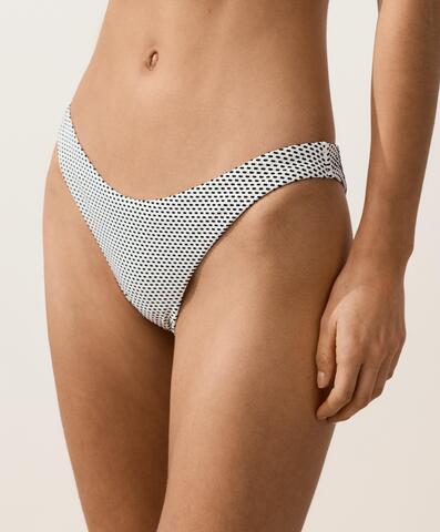 Трусики-бикини средней степени закрытости с U-образным вырезом. Жаккардовая ткань с принтом в горошек.