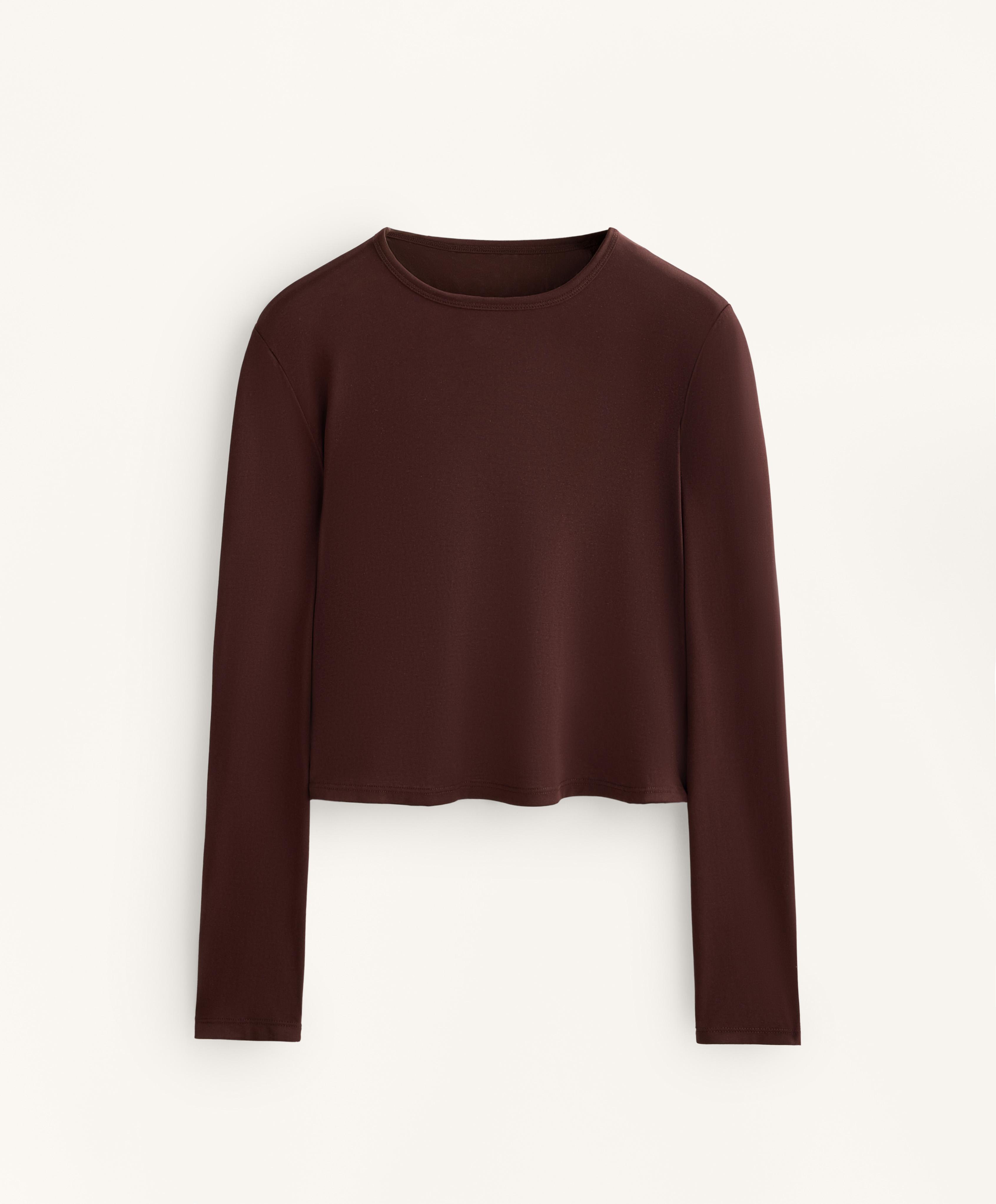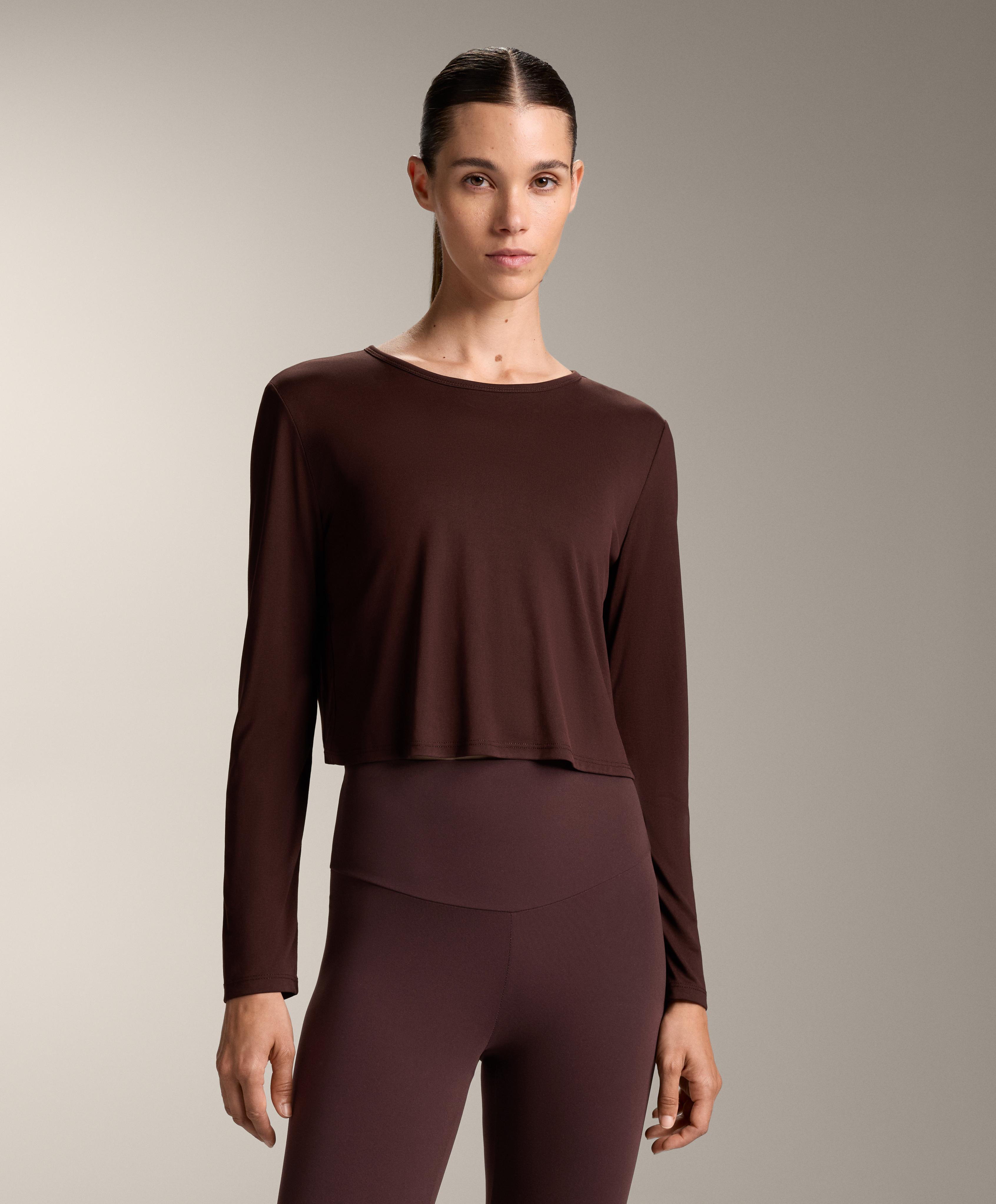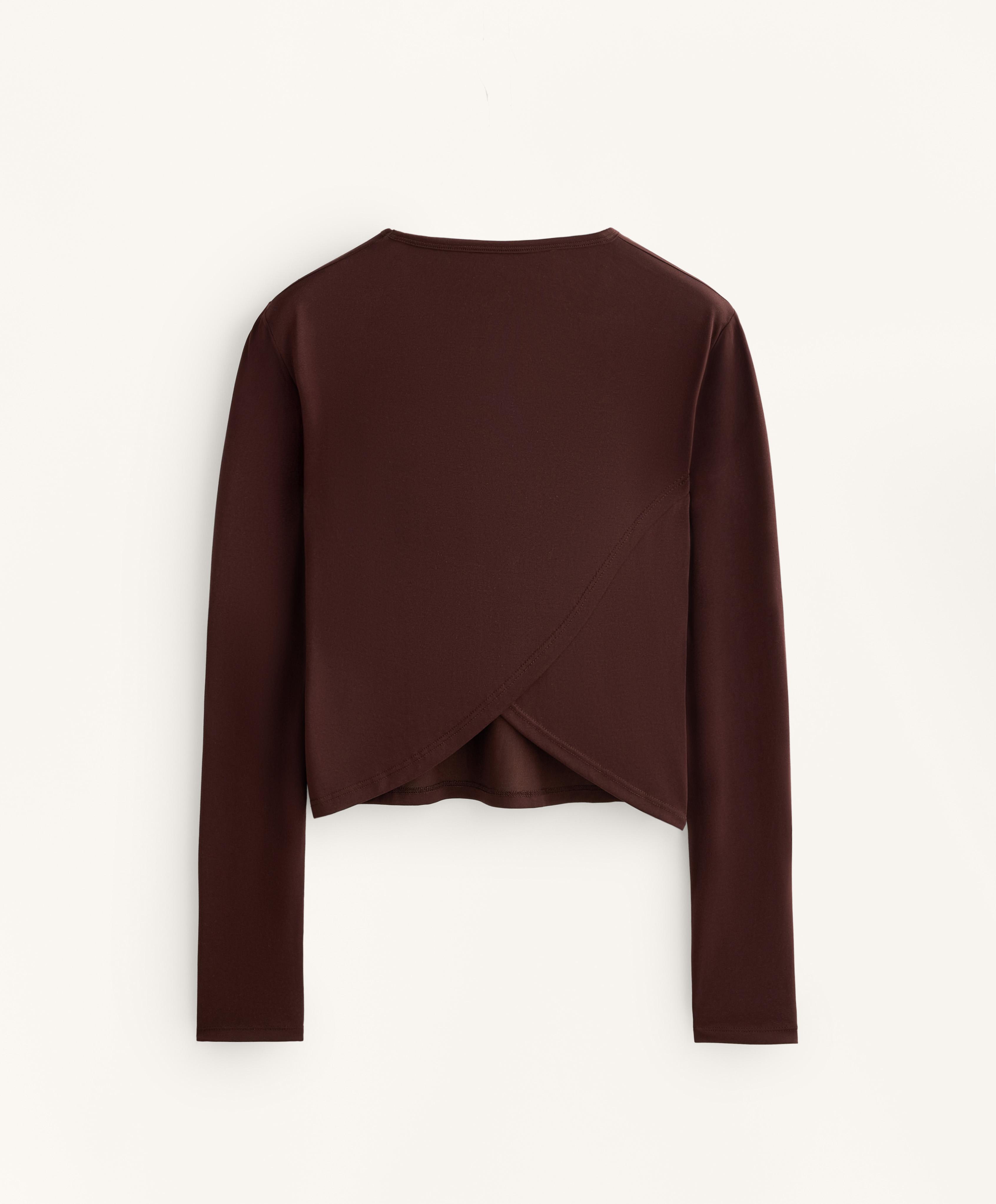 Укороченная футболка с длинными рукавами, перекрестной спинкой и круглым вырезом. Материал: модал.