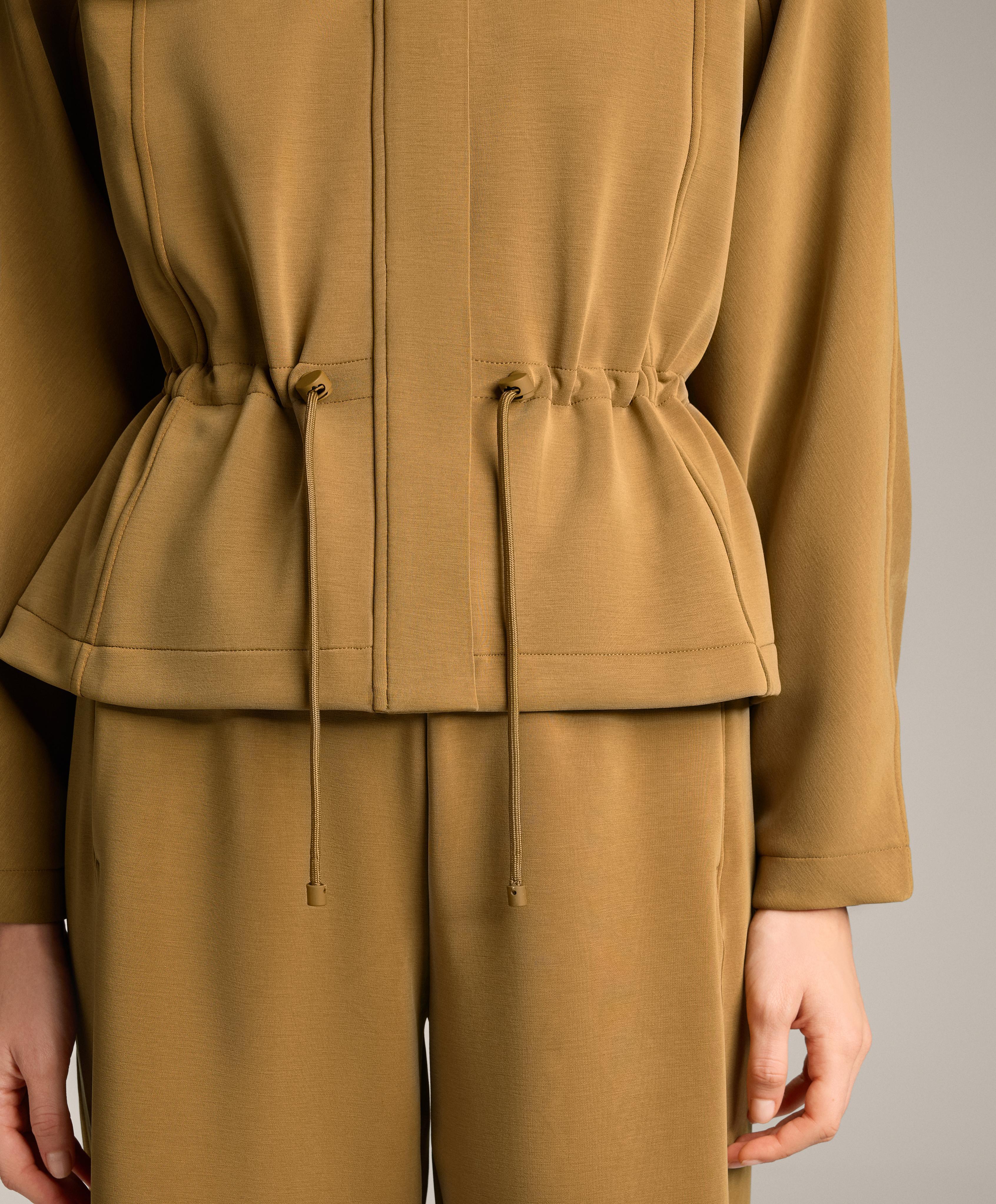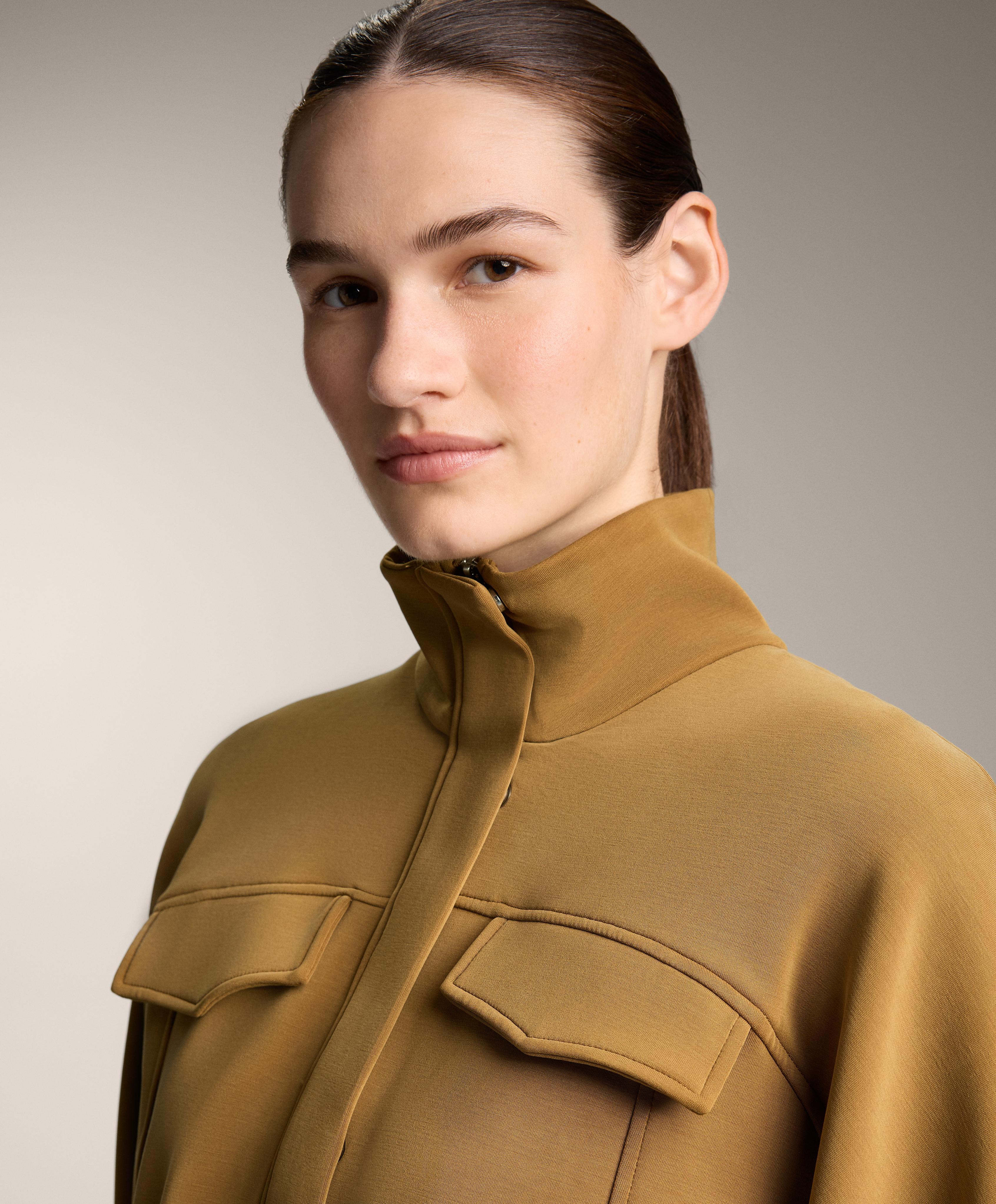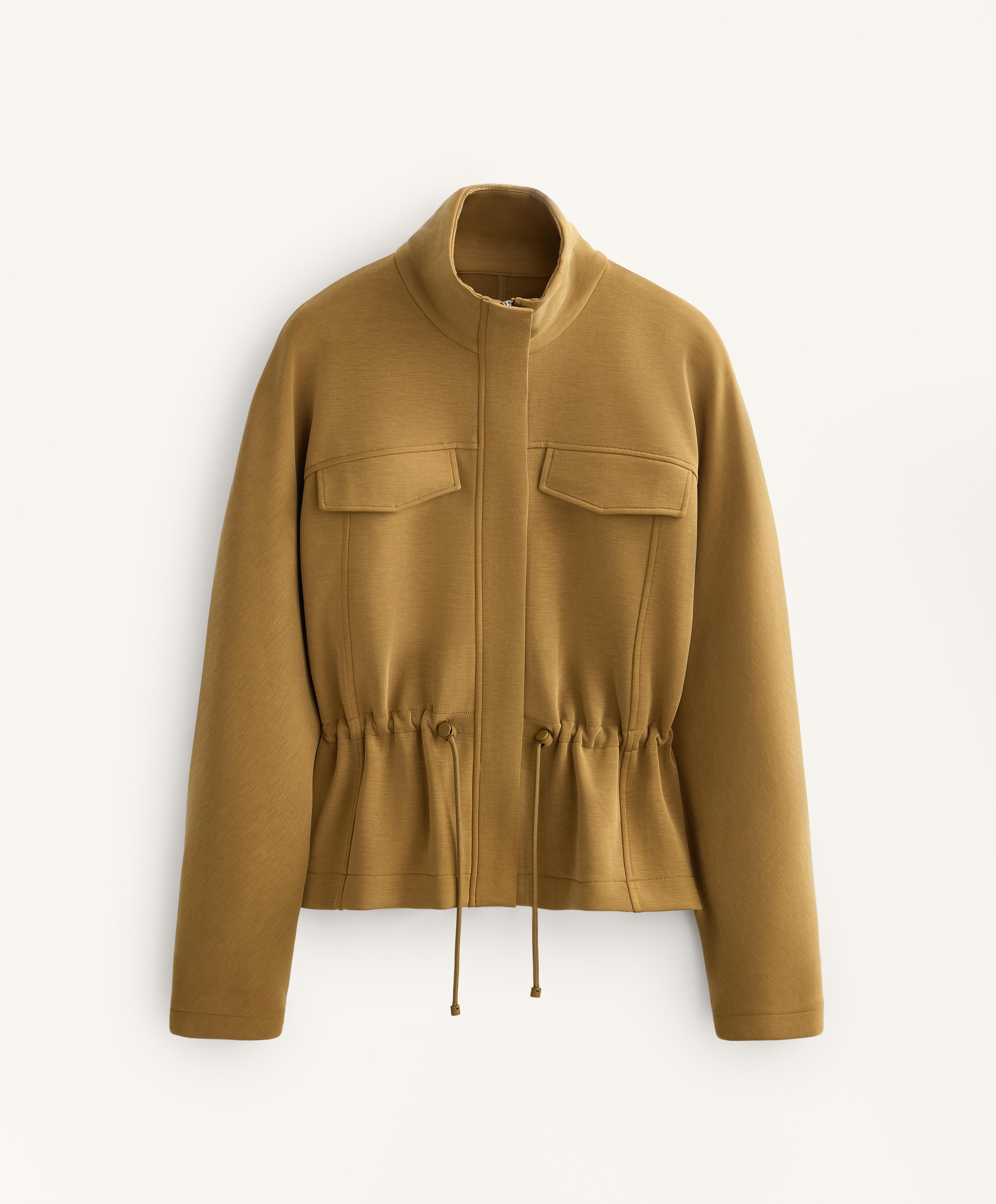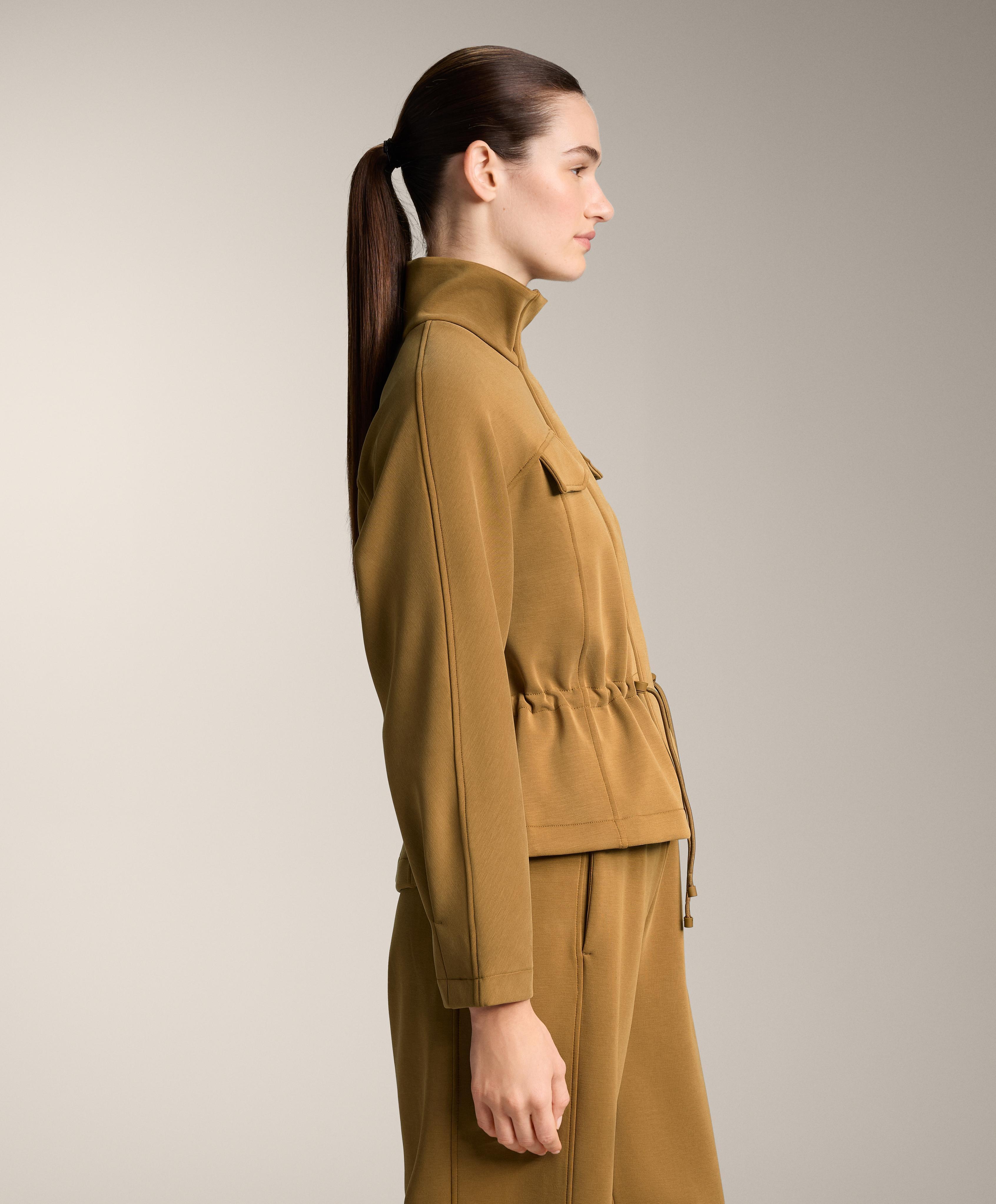 Укороченная куртка с высоким воротником и регулируемым шнурком на талии. Нагрудные передние карманы и застежка-молния спереди. Дышащая ткань из модала, с начесом с изнаночной стороны.