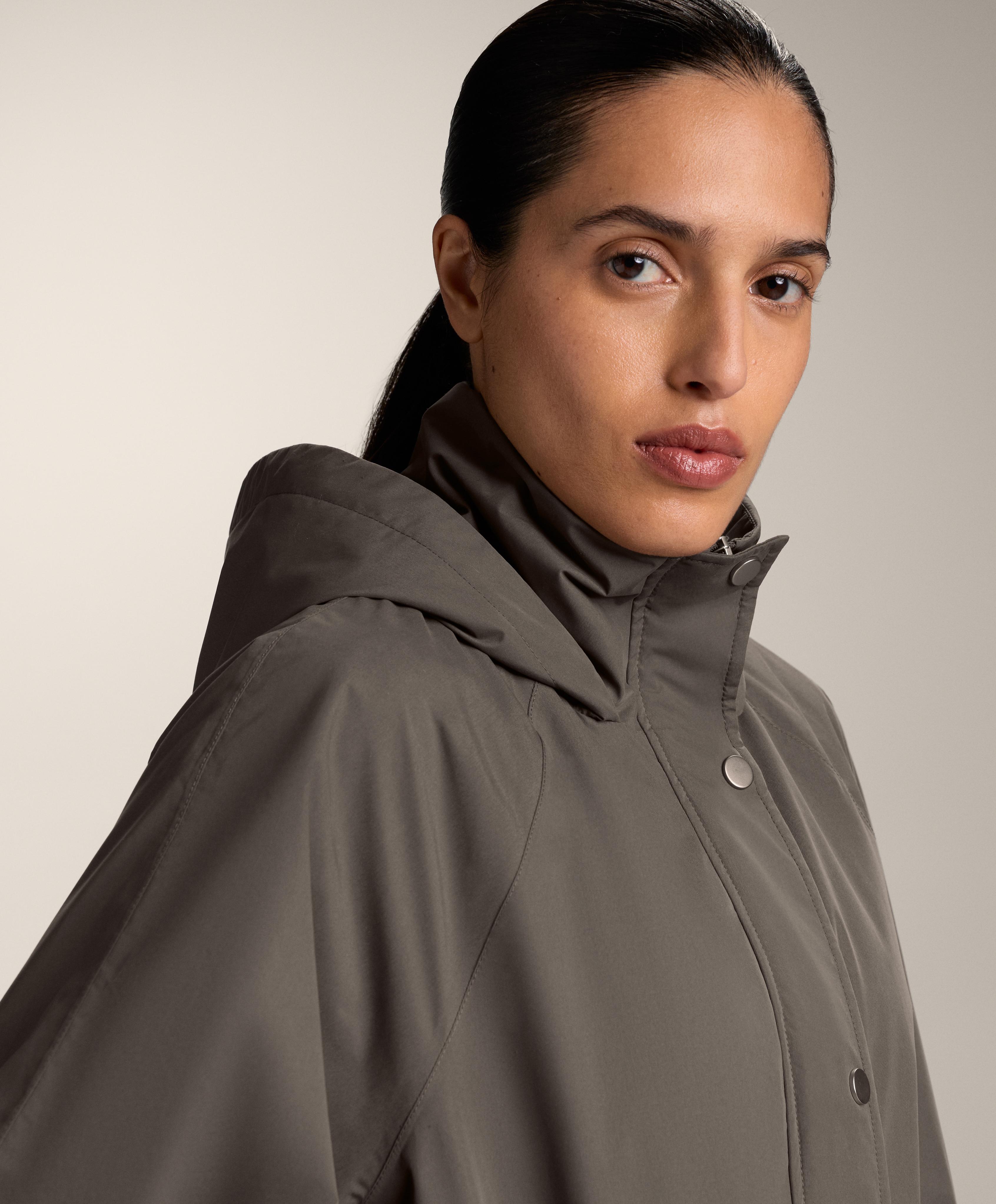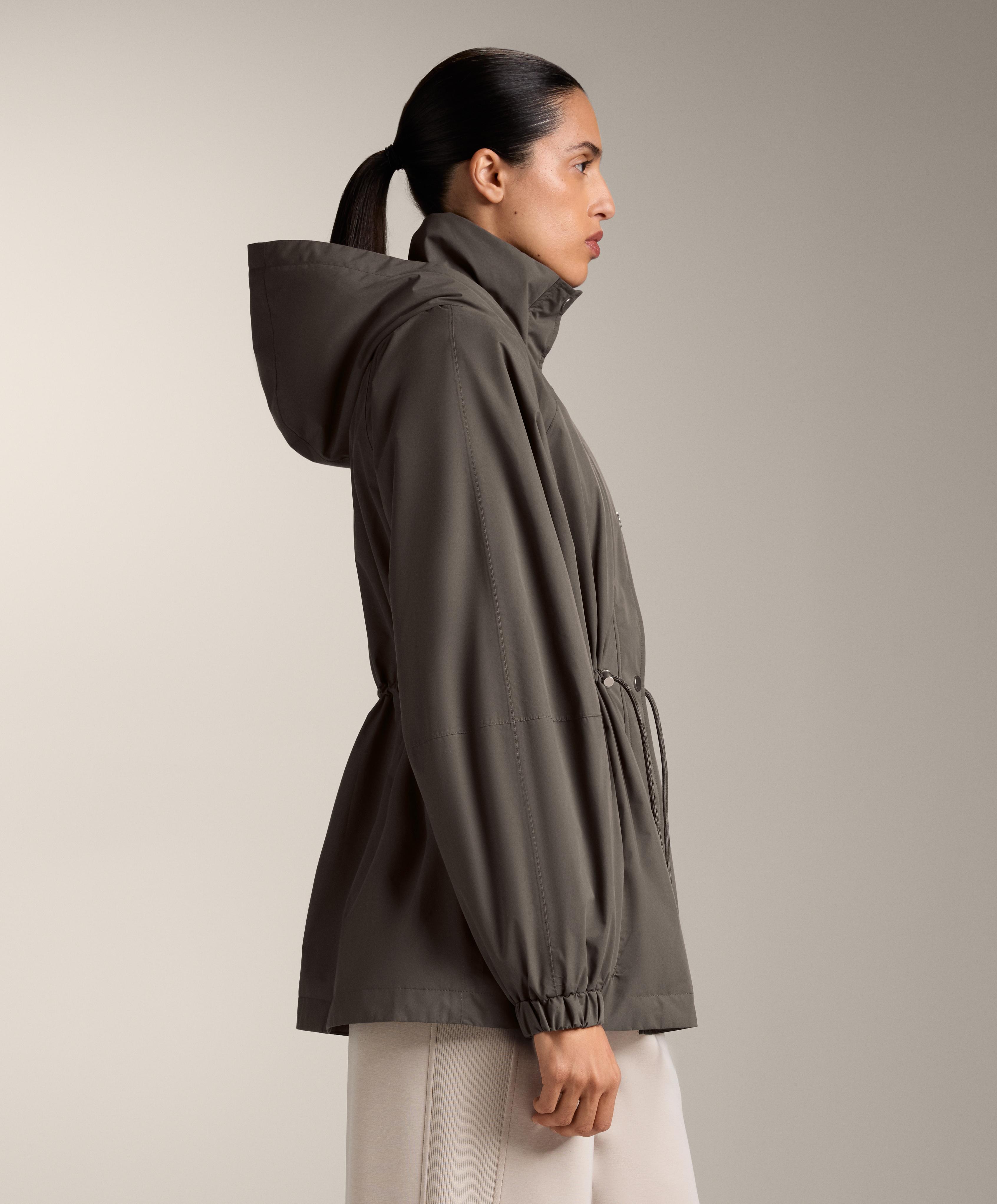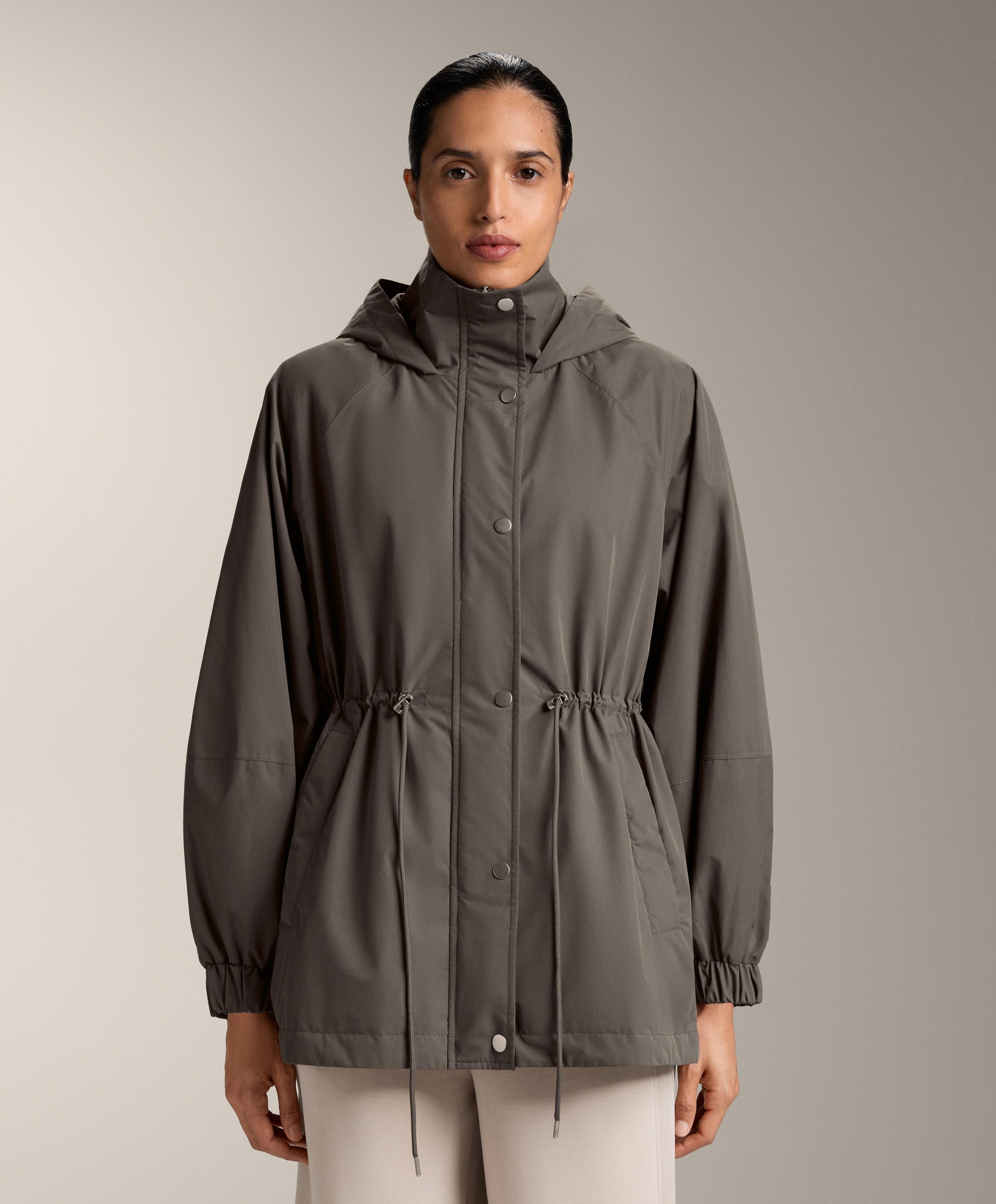 Застежка спереди на кнопки и регулировка на кулиске по талии. Высокий воротник с капюшоном. Боковые карманы с начесом внутри. Водонепроницаемая и ветрозащитная ткань с термозапаянными швами.