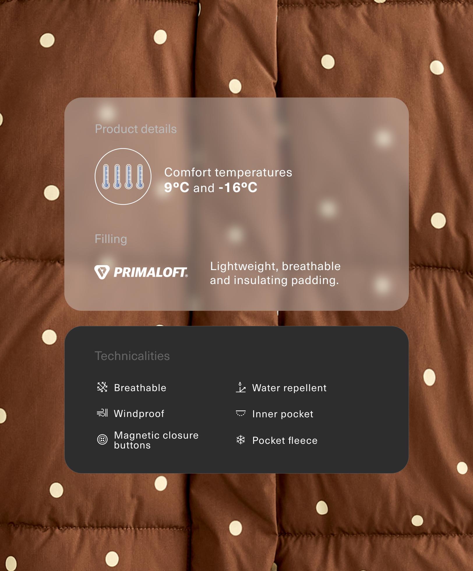 Утепленная куртка с водоотталкивающей технологией Primaloft®. Высокий воротник, застежка-молния спереди и магнитная застежка. Боковые карманы с подкладкой из флиса и внутренний карман. Ветрозащитная, водоотталкивающая и дышащая ткань. Детали с принтом.