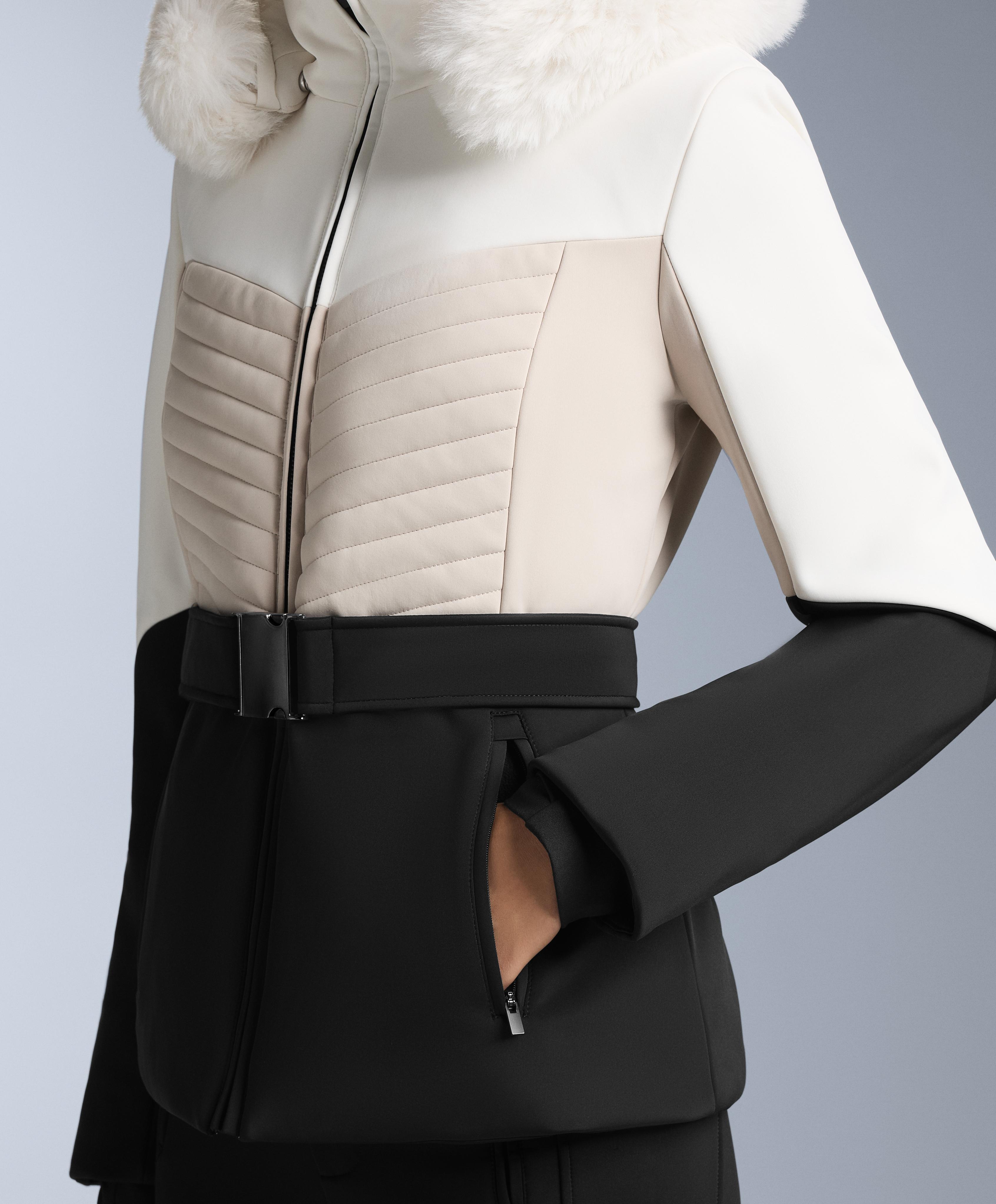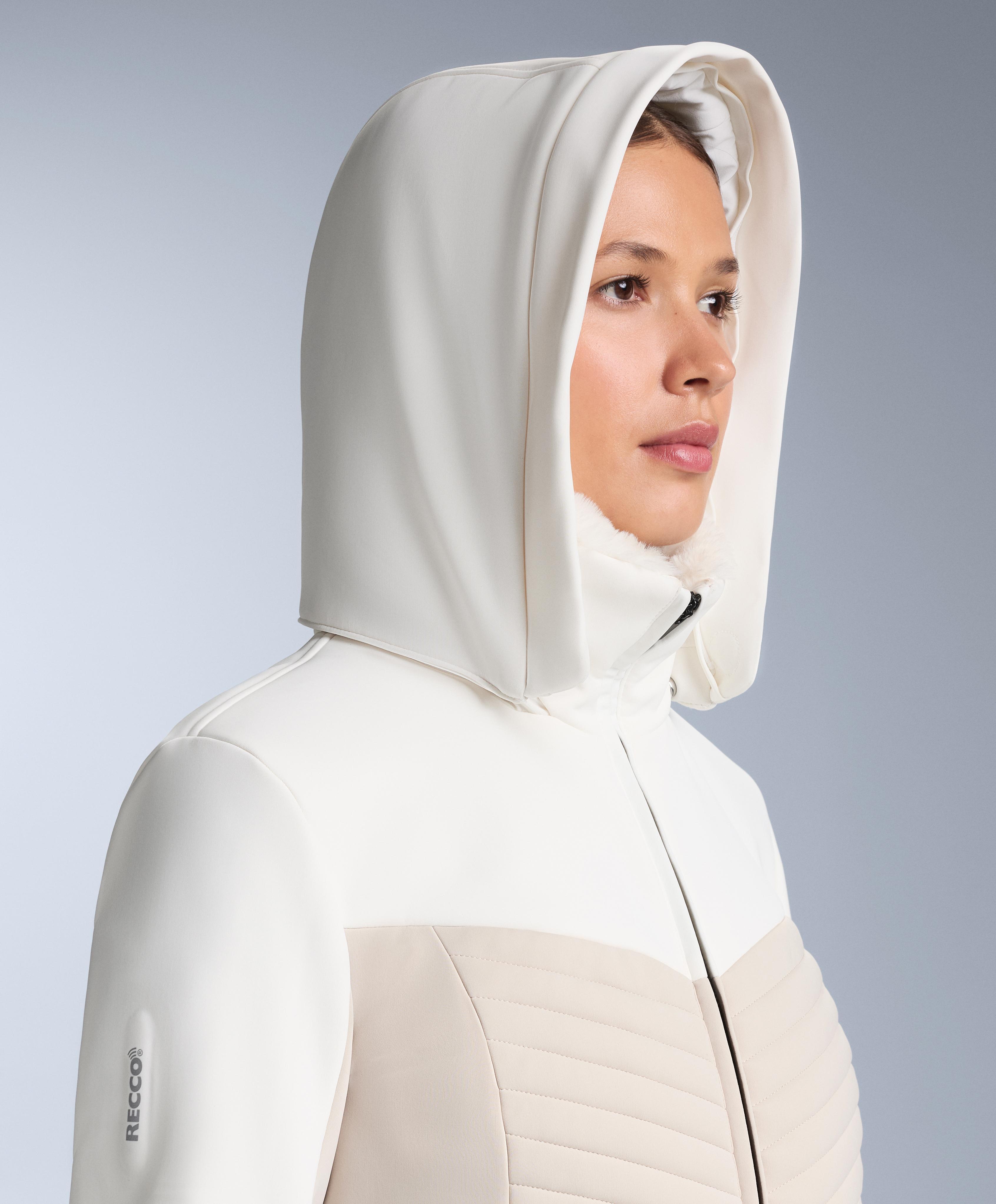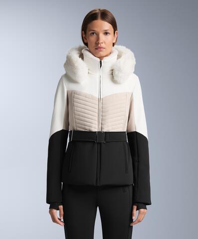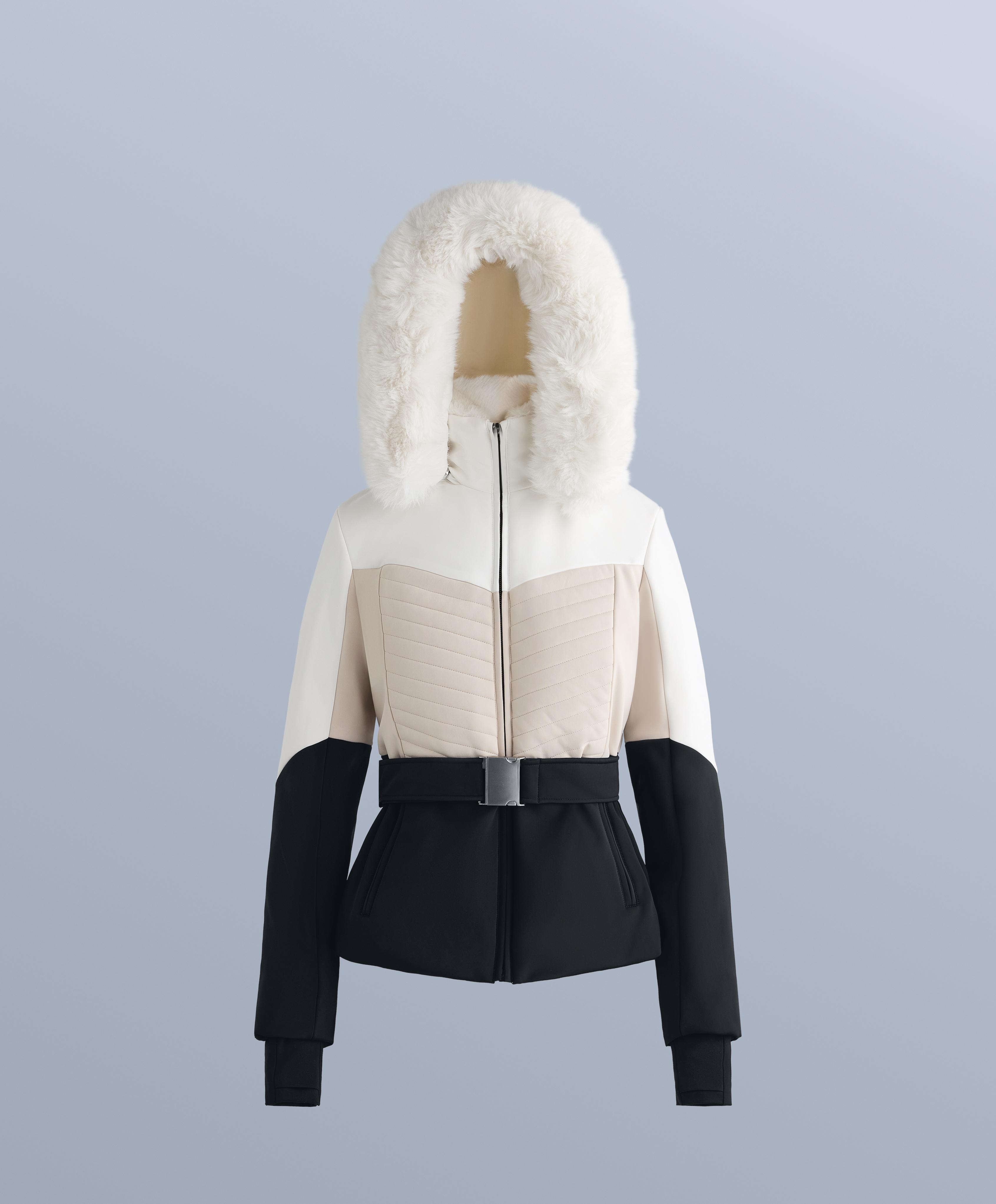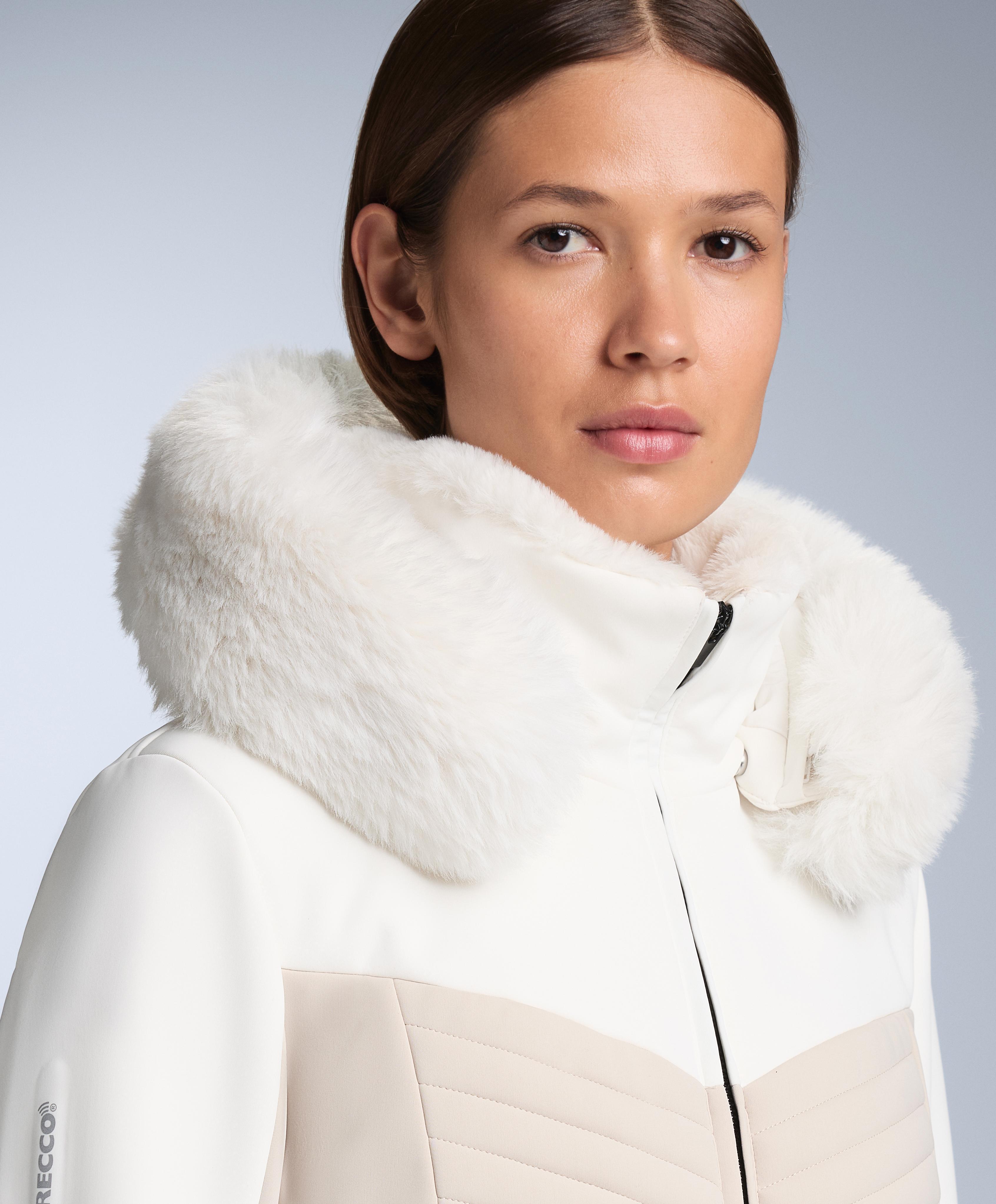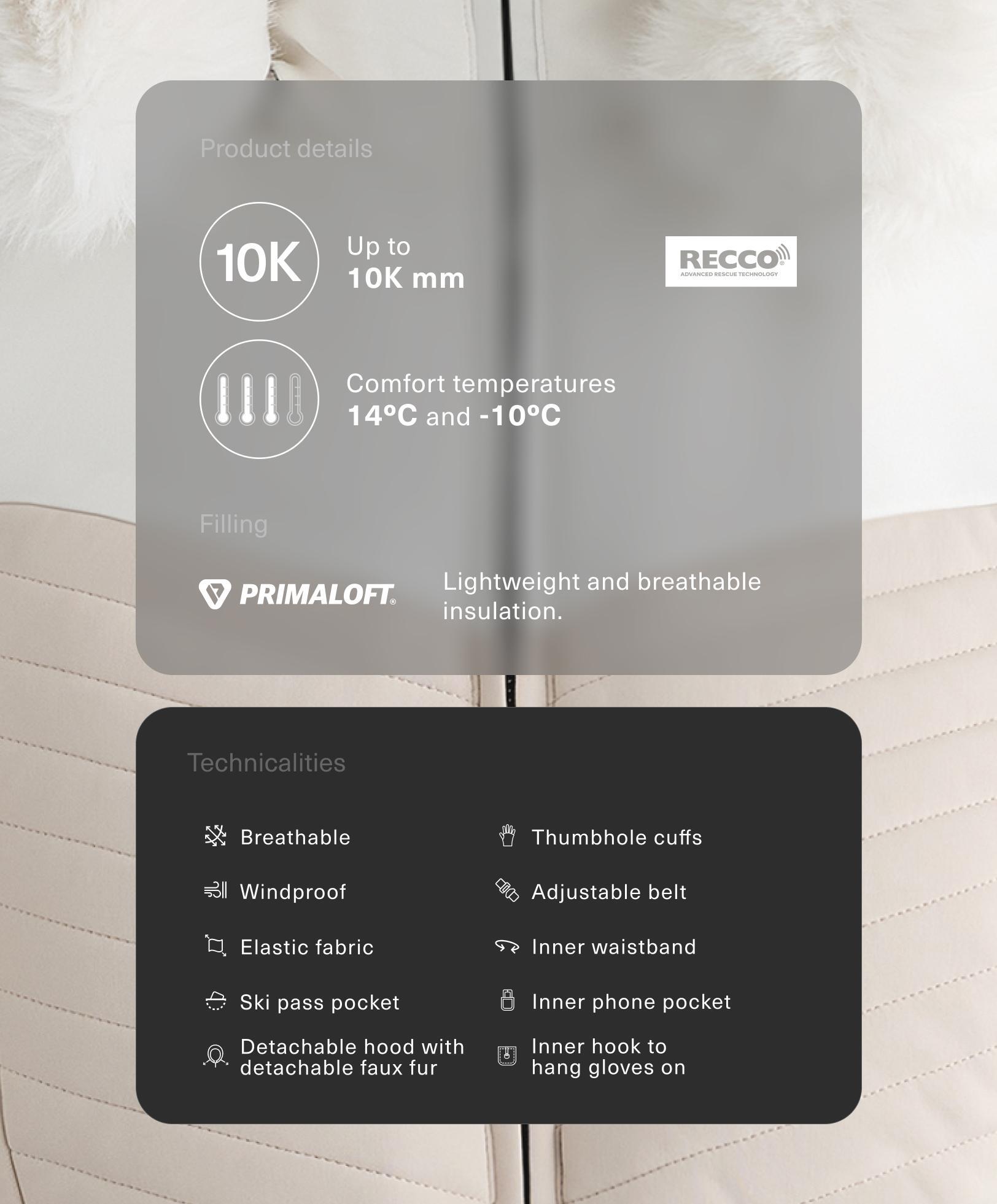 Застежка-молния спереди и регулируемый пояс. Боковые карманы на молнии, внутренний карман для мобильного телефона и карман на рукаве для ски-пасса. Съемный капюшон с искусственным мехом. Внутренний пояс предотвращает попадание снега. Эластичные внутренние манжеты с отверстиями для больших пальцев и внутренний крючок для перчаток. Дышащая, ветронепроницаемая и эластичная ткань для дополнительного комфорта.