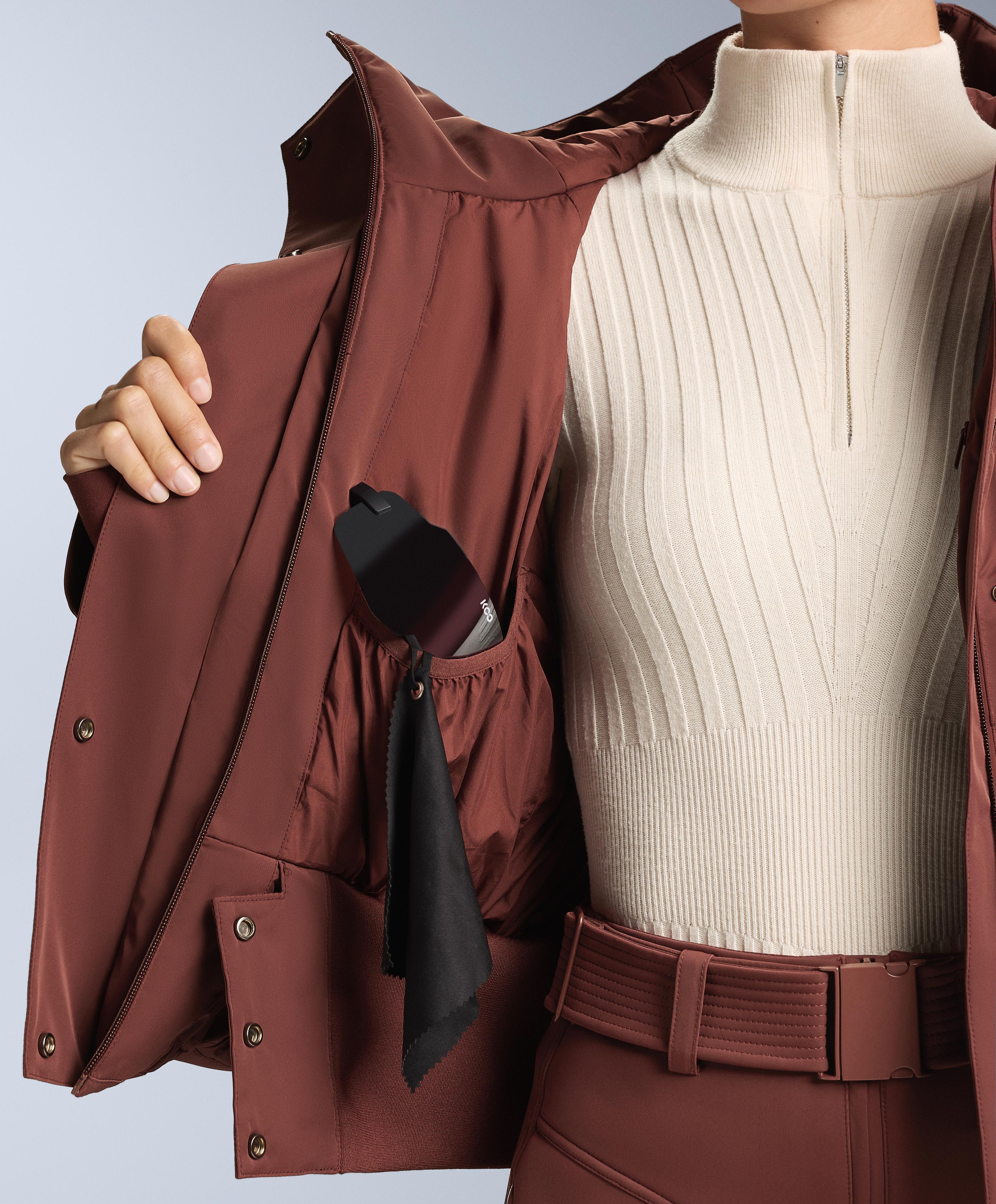 Передняя застежка на термосвариваемую молнию для повышения водонепроницаемости. Передние карманы с клапаном, внутренний карман для хранения мобильного телефона и карман на рукаве для ски-пасса. Внутренний крючок для подвешивания перчаток. Внутренняя эластичная талия, предотвращающая попадание снега. Внутренняя эластичная манжета с отверстием для большого пальца.