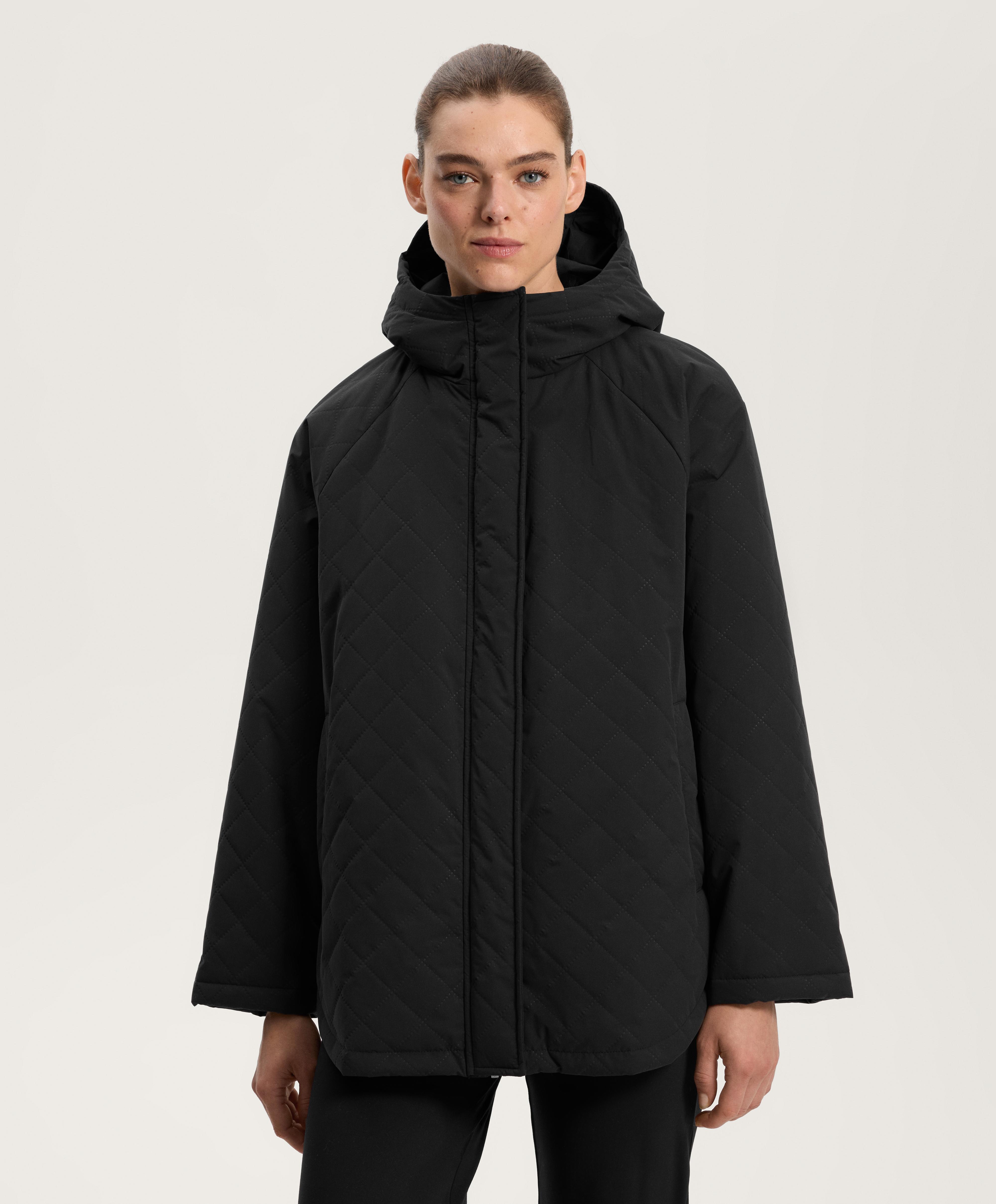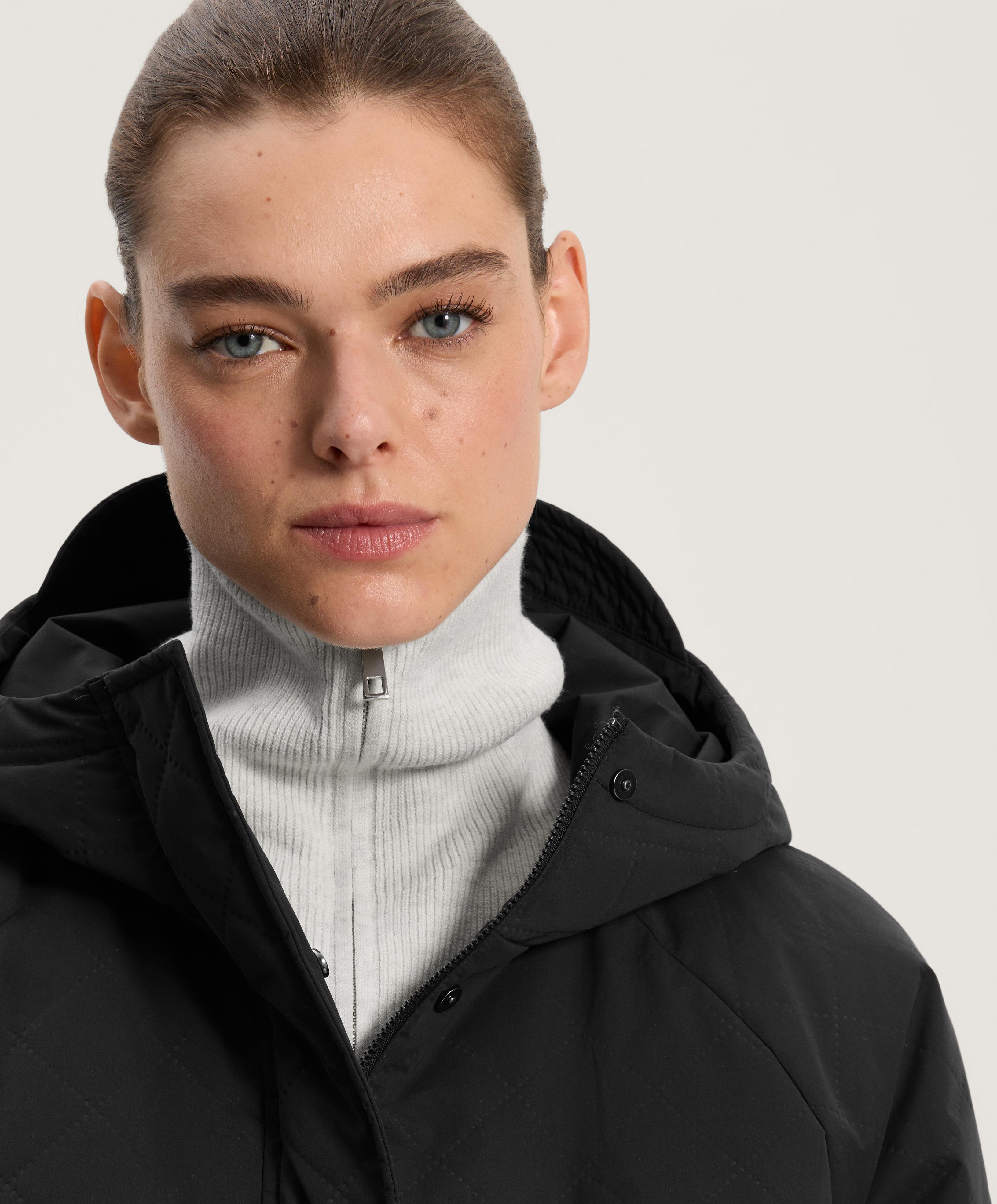 Застёжка на молнию и пуговицы спереди с магнитной застёжкой. Высокий ворот и регулируемый капюшон. Боковые и внутренние карманы с накладным внутренним слоем. Ткань с матовой поверхностью, водонепроницаемая и ветрозащитная.