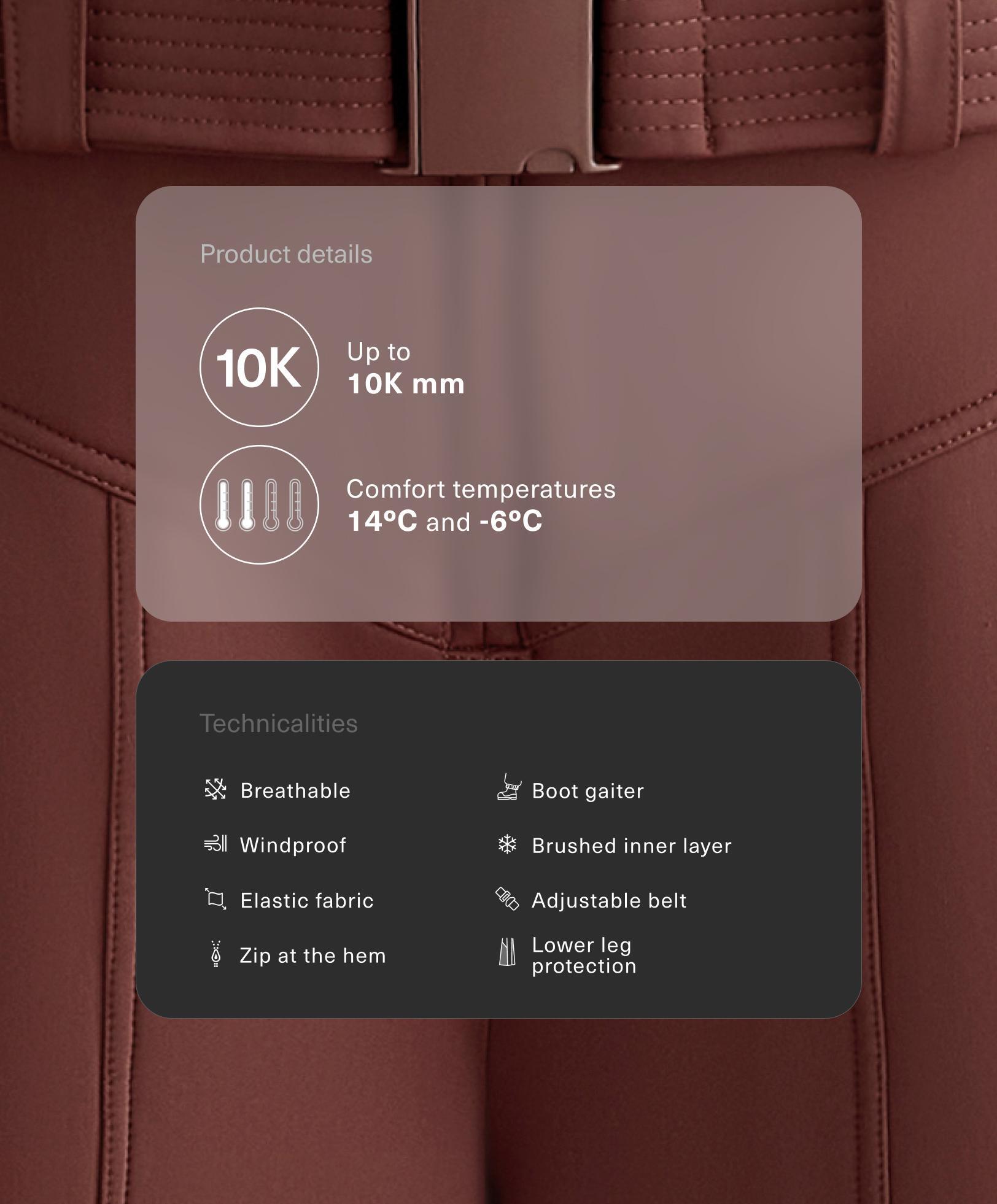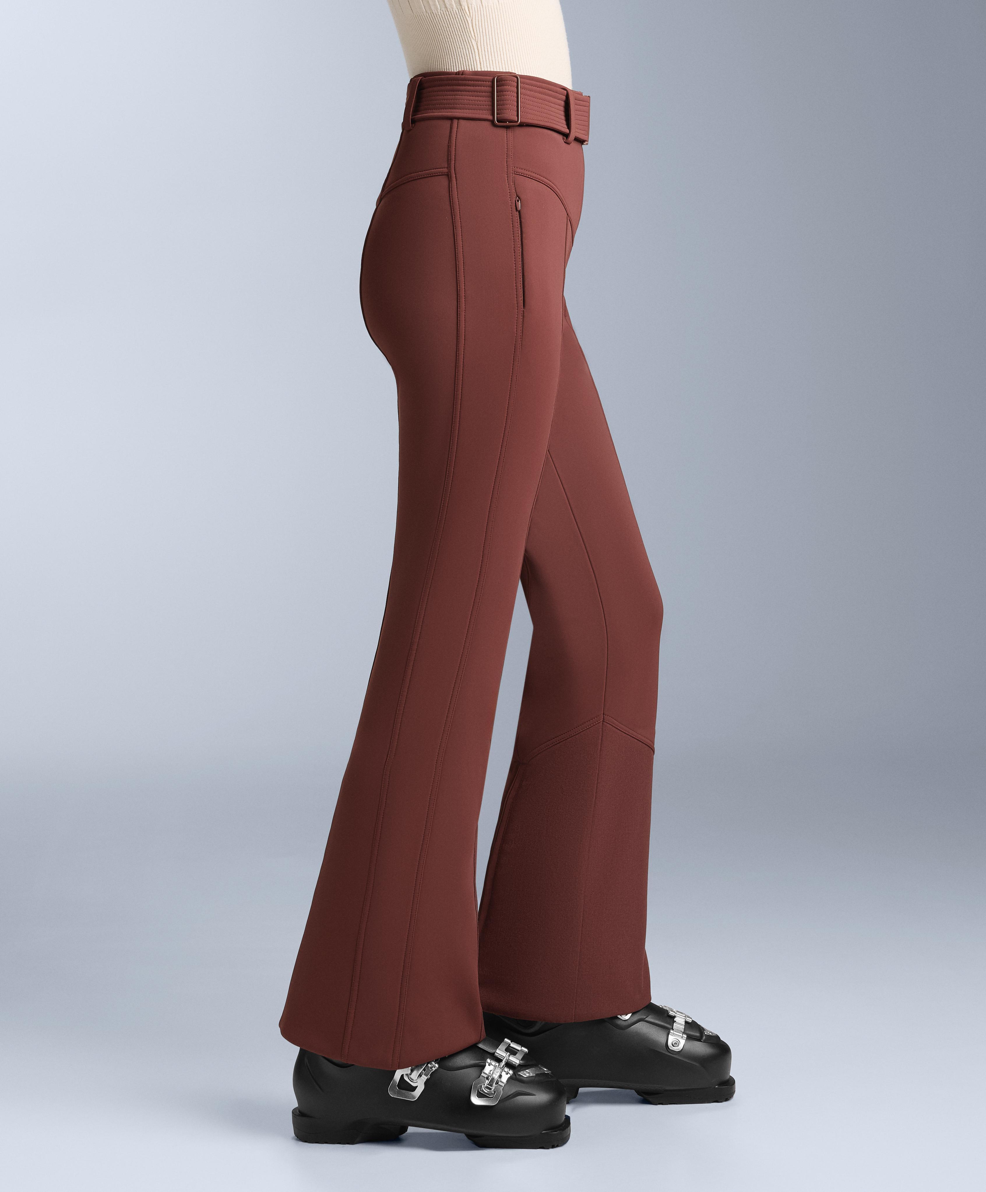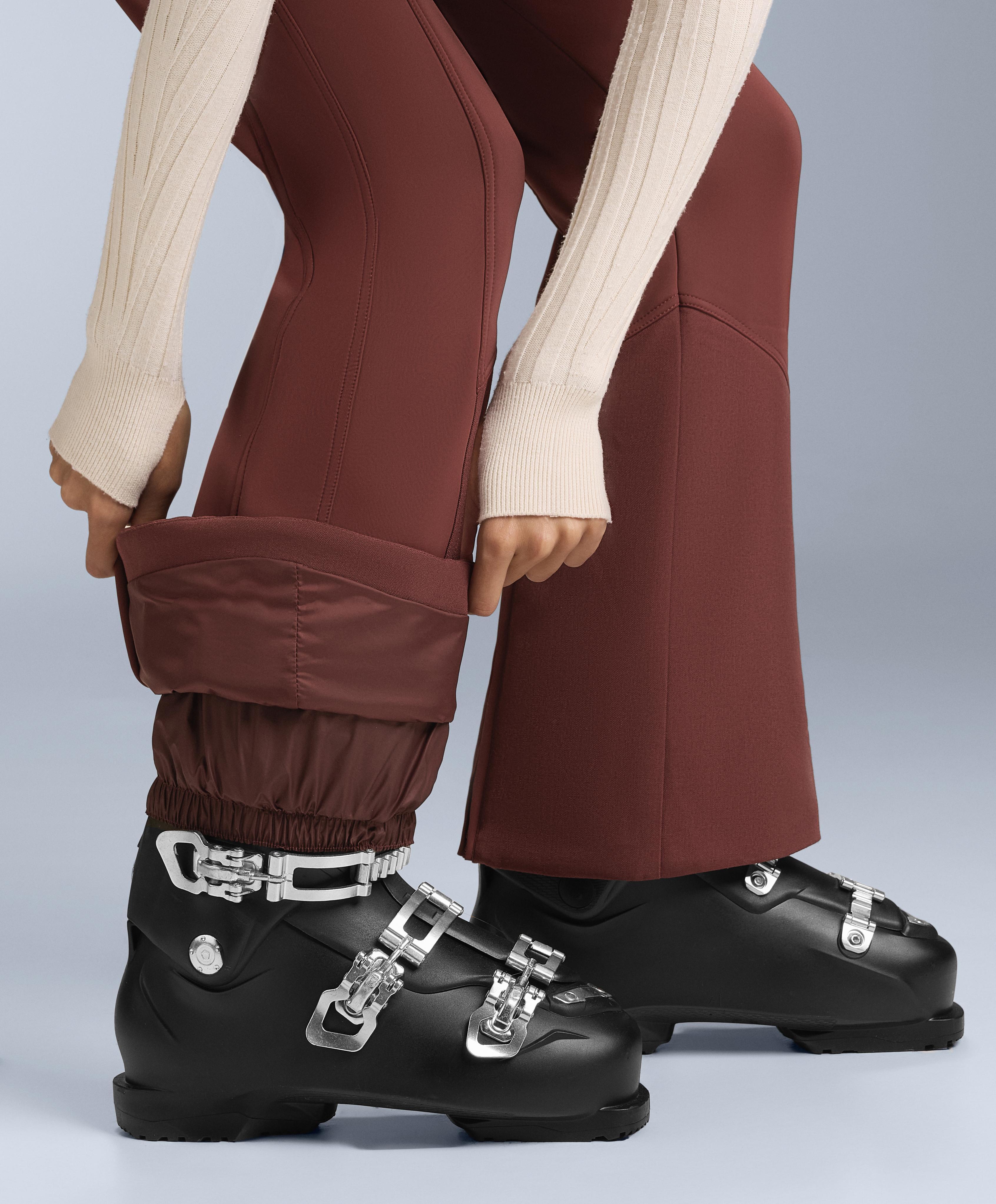 Расклешенные эластичные брюки с высокой посадкой, застежкой на молнию и кнопку спереди. Эластичная талия с регулируемым поясом. Передние карманы на молнии. Усиленный подол с молнией и подкладкой, которая предотвращает попадание снега внутрь. Защитная панель от порезов лыжами и ботинками. Начесанный внутренний слой для тепла. Дышащая, ветрозащитная и эластичная ткань для дополнительного комфорта.