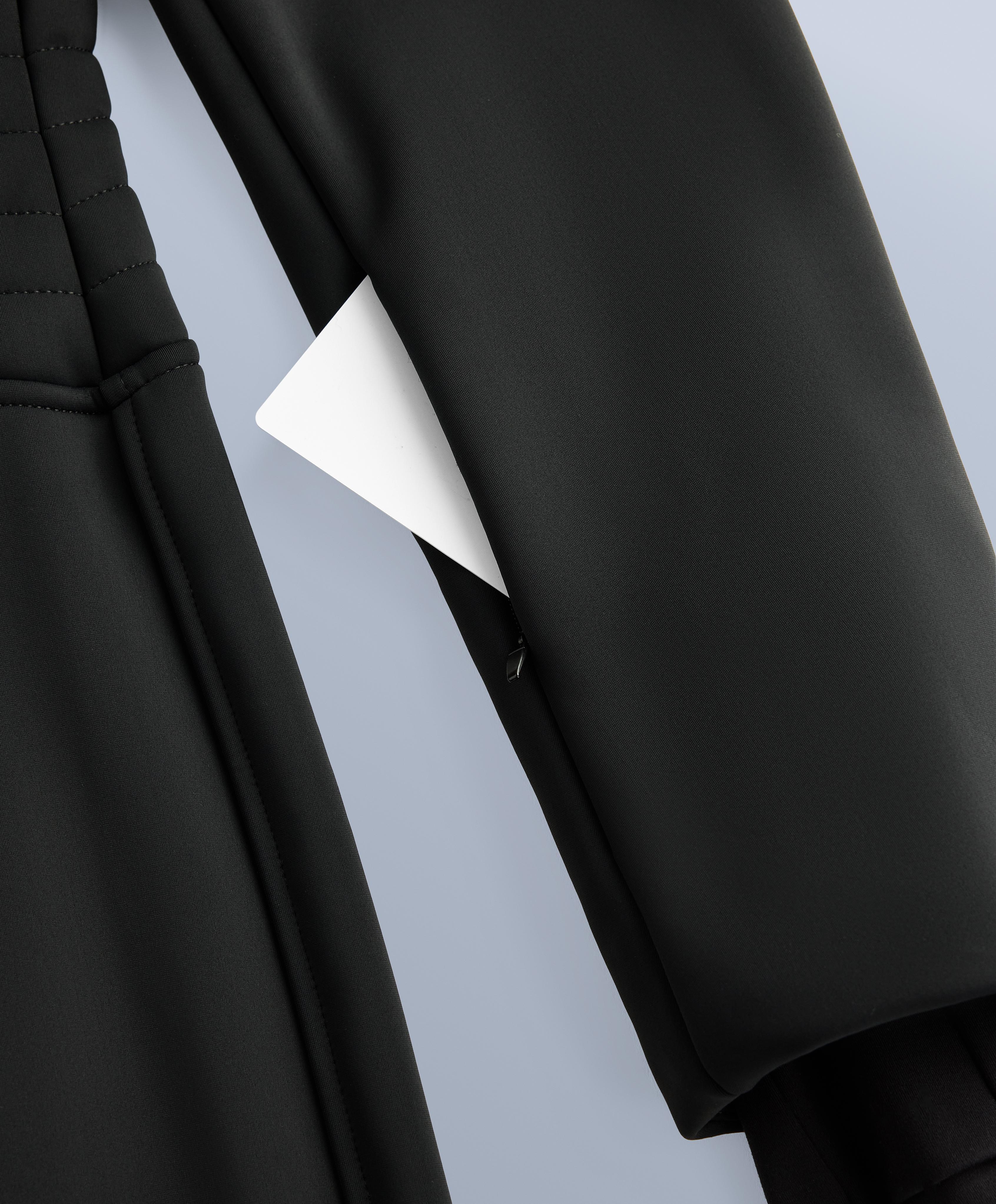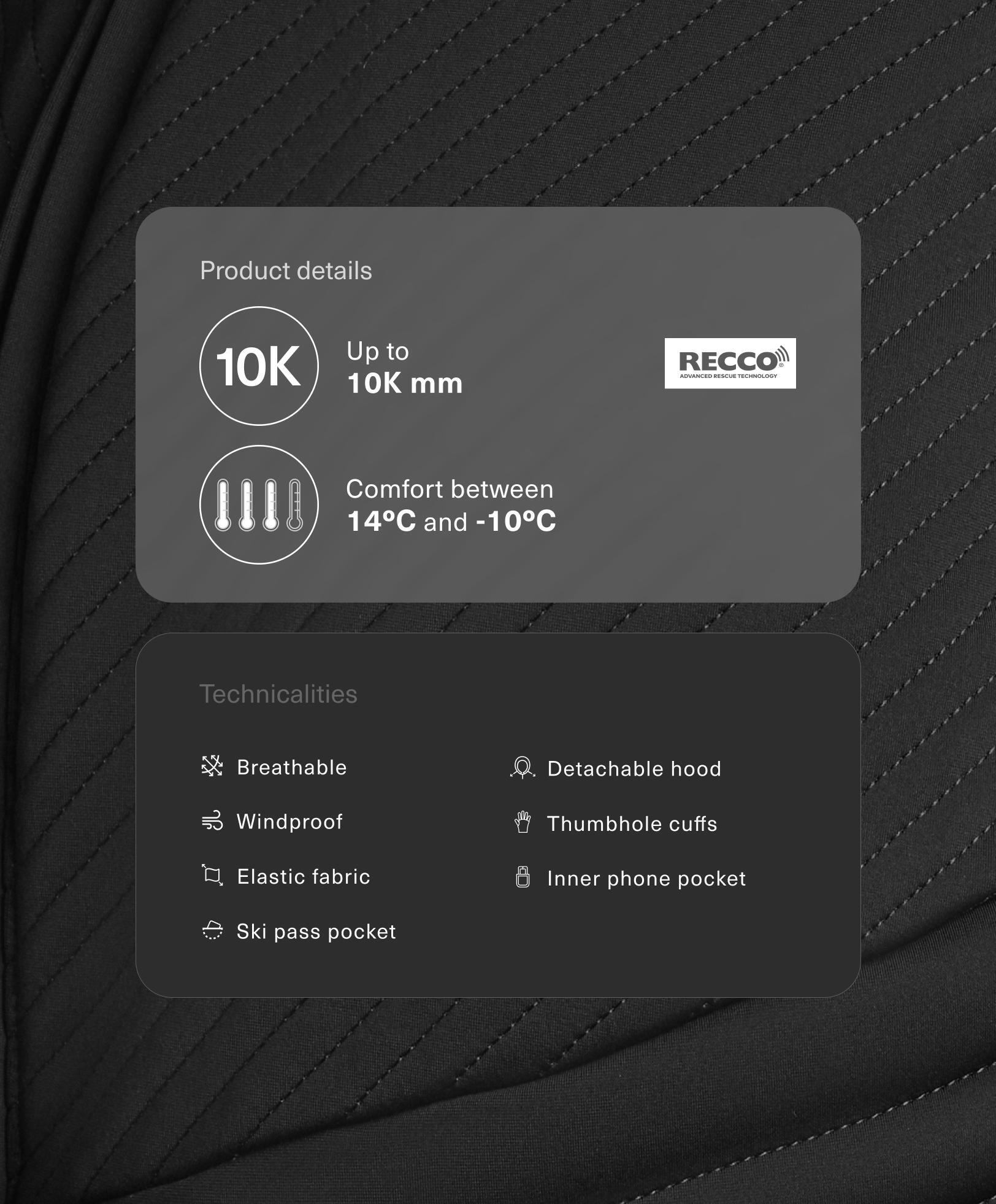 Длинные рукава на молнии спереди. Боковые карманы, внутренний карман для мобильного телефона и карман на рукаве для ски-пасса. Низ усилен подкладкой для защиты от снега. Молния по низу позволяет регулировать ширину брючины. Эластичные внутренние манжеты с отверстиями для больших пальцев. Дышащая, водостойкая, ветронепроницаемая и эластичная ткань обеспечивает дополнительный комфорт.