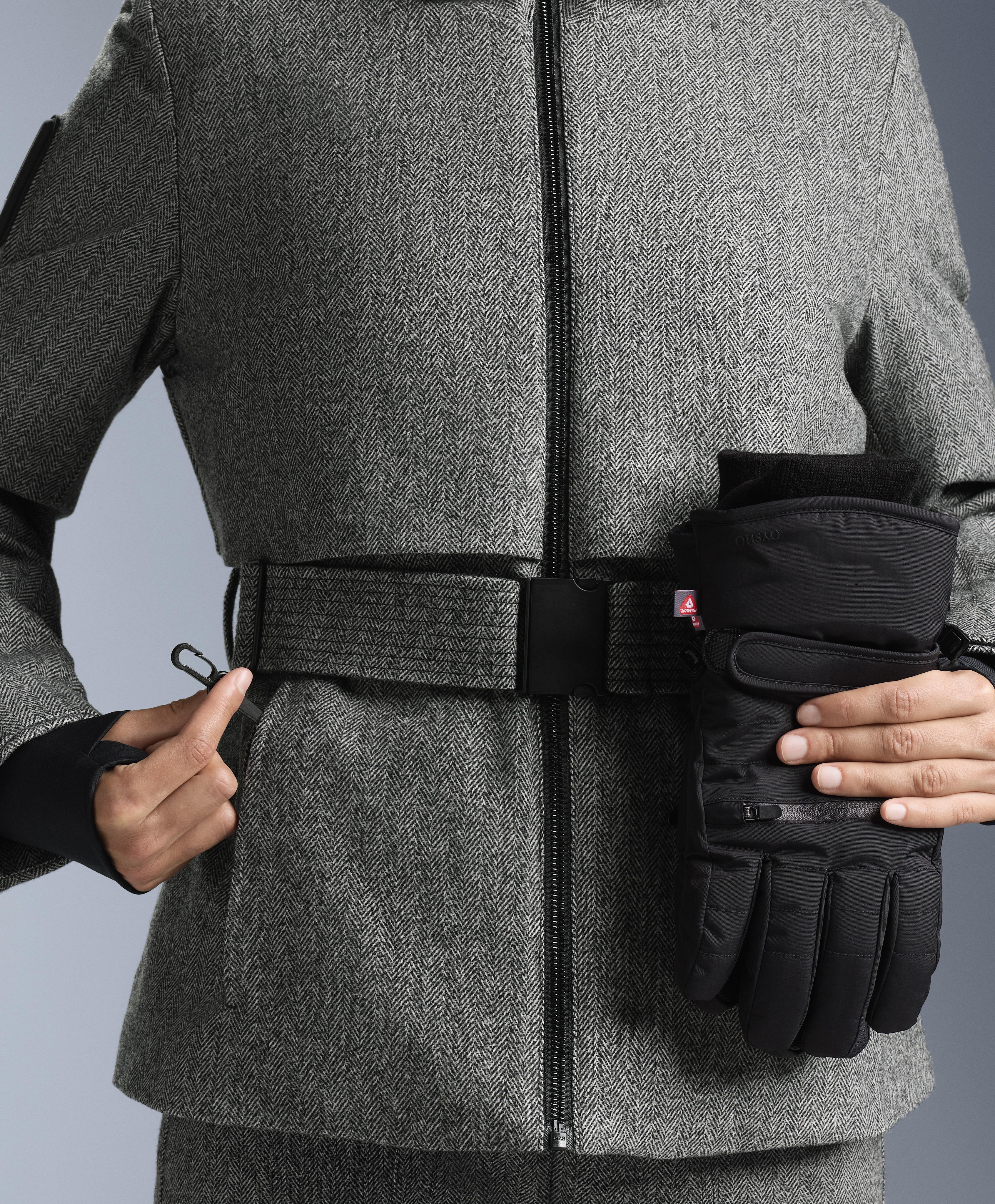 С высоким воротником и капюшоном, деталью в виде накидки и застежкой на молнию с регулируемым поясом. Карман для ски-пасса и карман для мобильного телефона. Внутренний пояс, предотвращающий попадание снега, внутренний крючок для подвешивания перчаток и эластичная внутренняя манжета с отверстием для большого пальца. Внутренний начес на карманах. Воздухопроницаемая и ветрозащитная ткань.