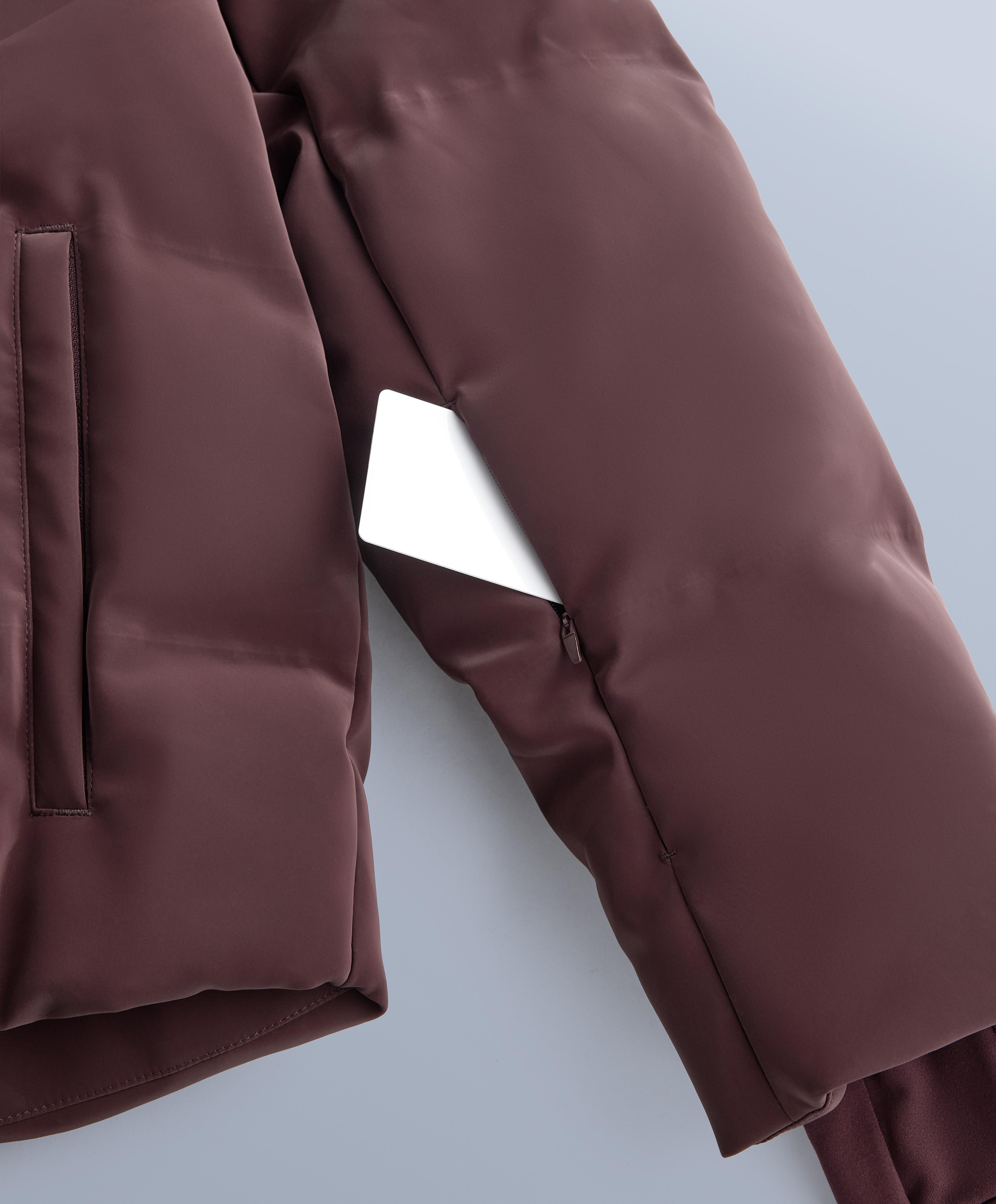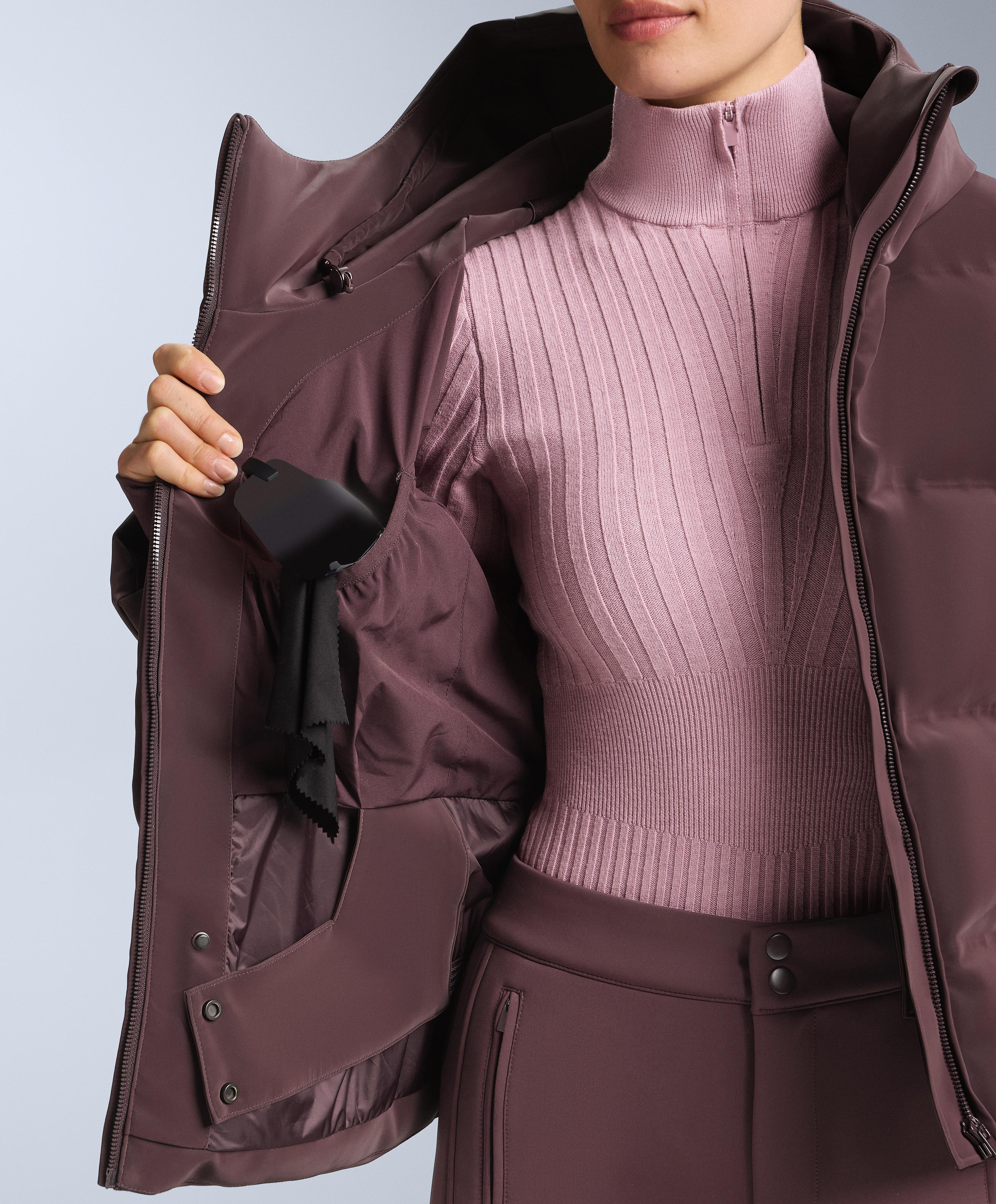 С капюшоном, высоким воротом и застежкой-молнией спереди. Боковые карманы с начесом внутри и карман на рукаве для ски-пасса. Внутренний карман для очков с чистящим средством. Внутренний пояс предотвращает попадание снега. Эластичная внутренняя манжета с отверстием для большого пальца. Внутренние ремни и карман с прозрачным окошком. Внутренний крючок для перчаток. Ветрозащитная ткань.