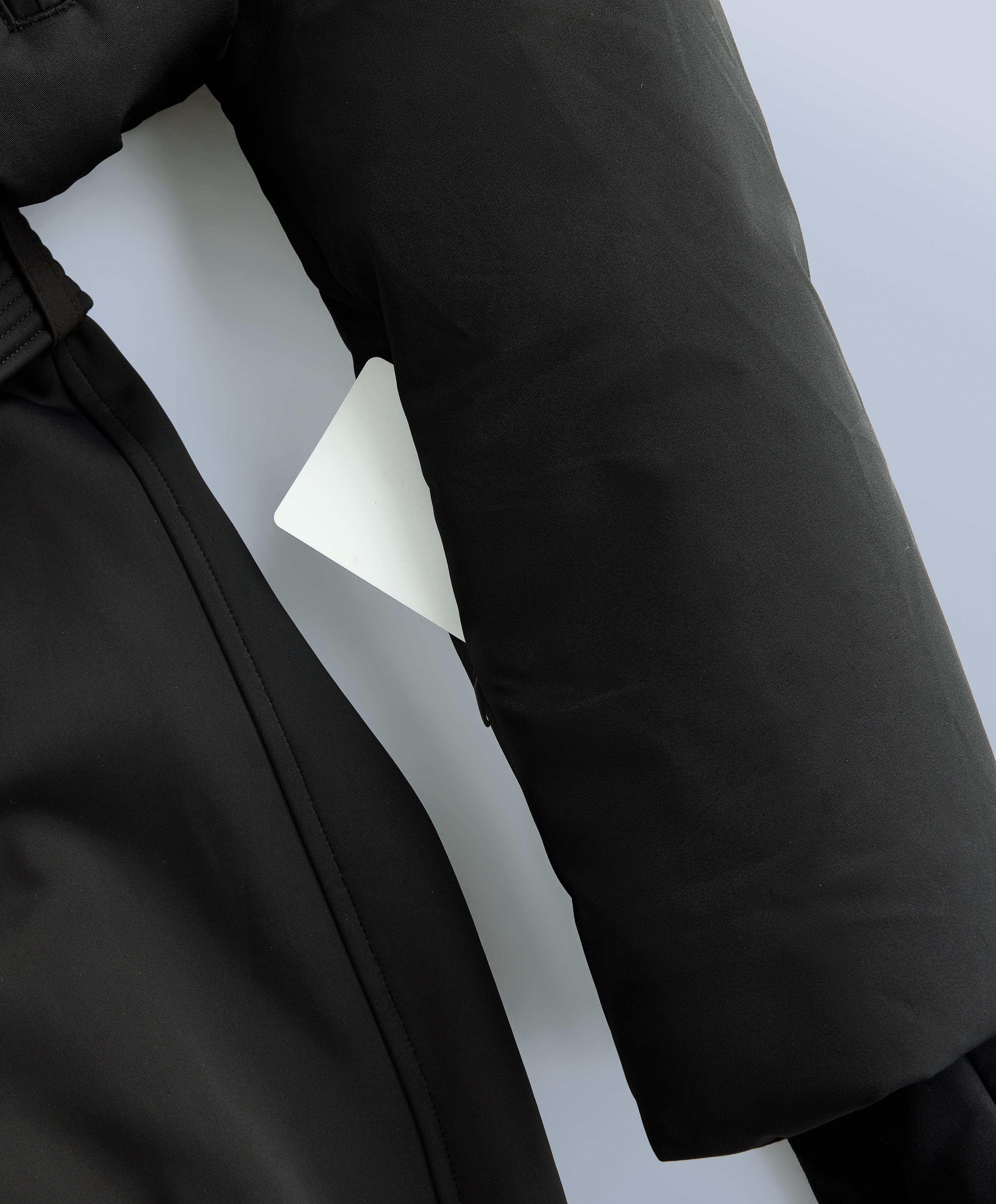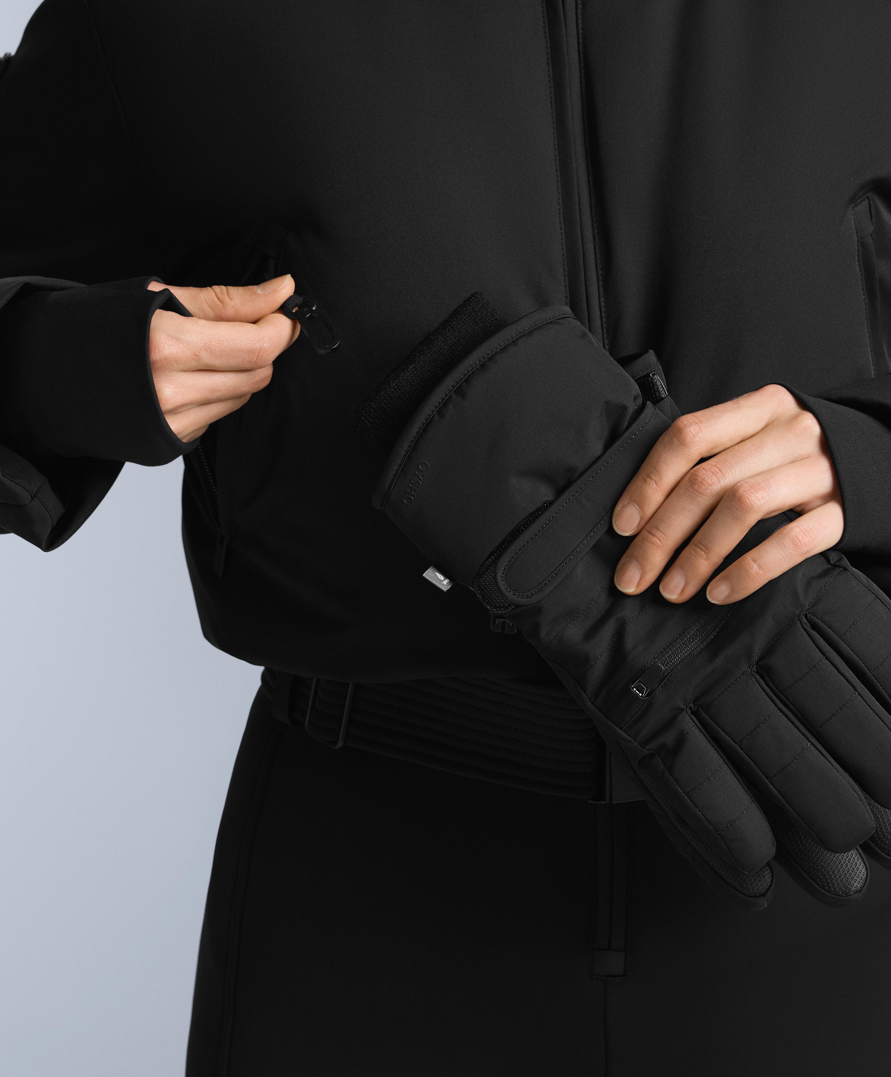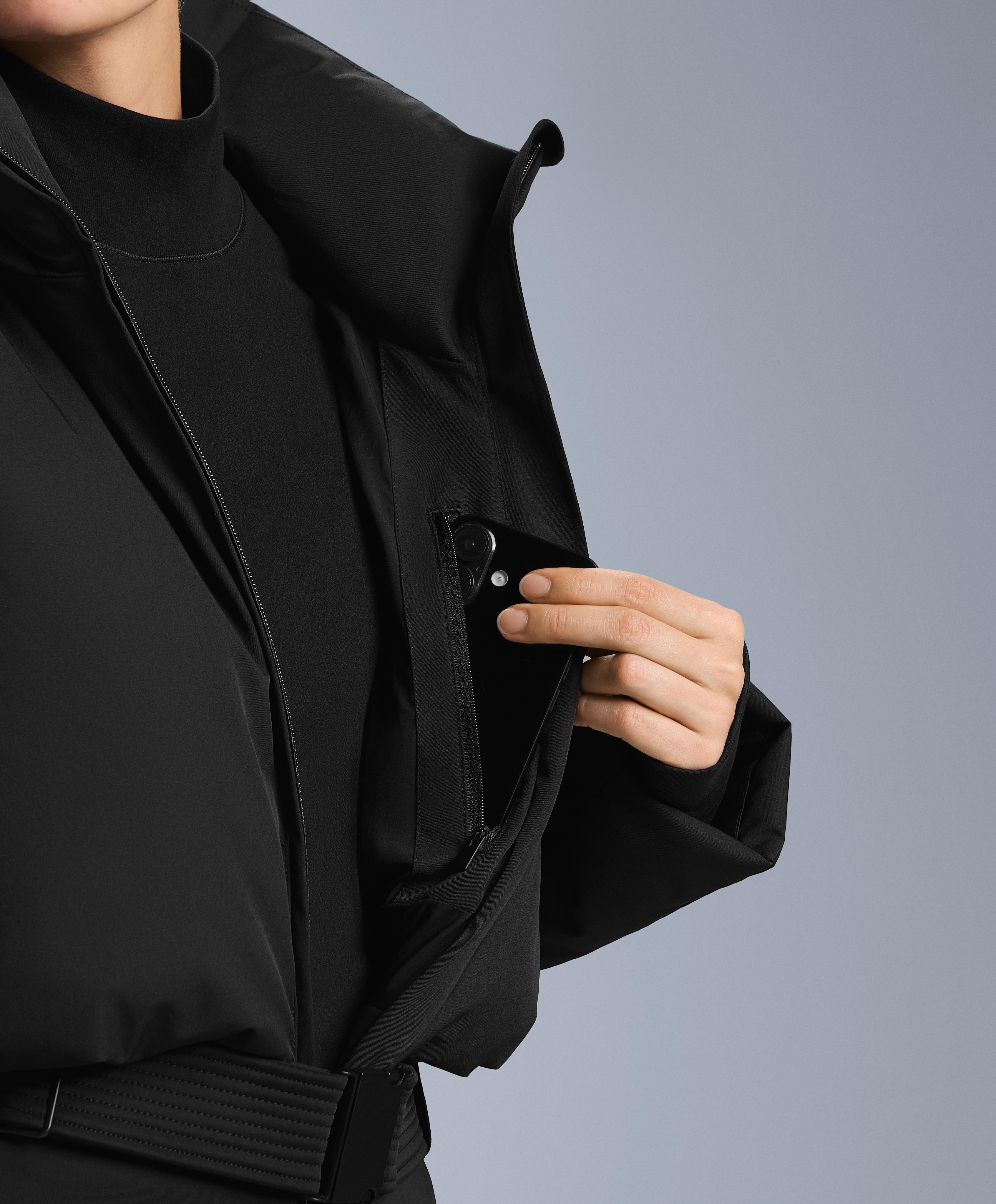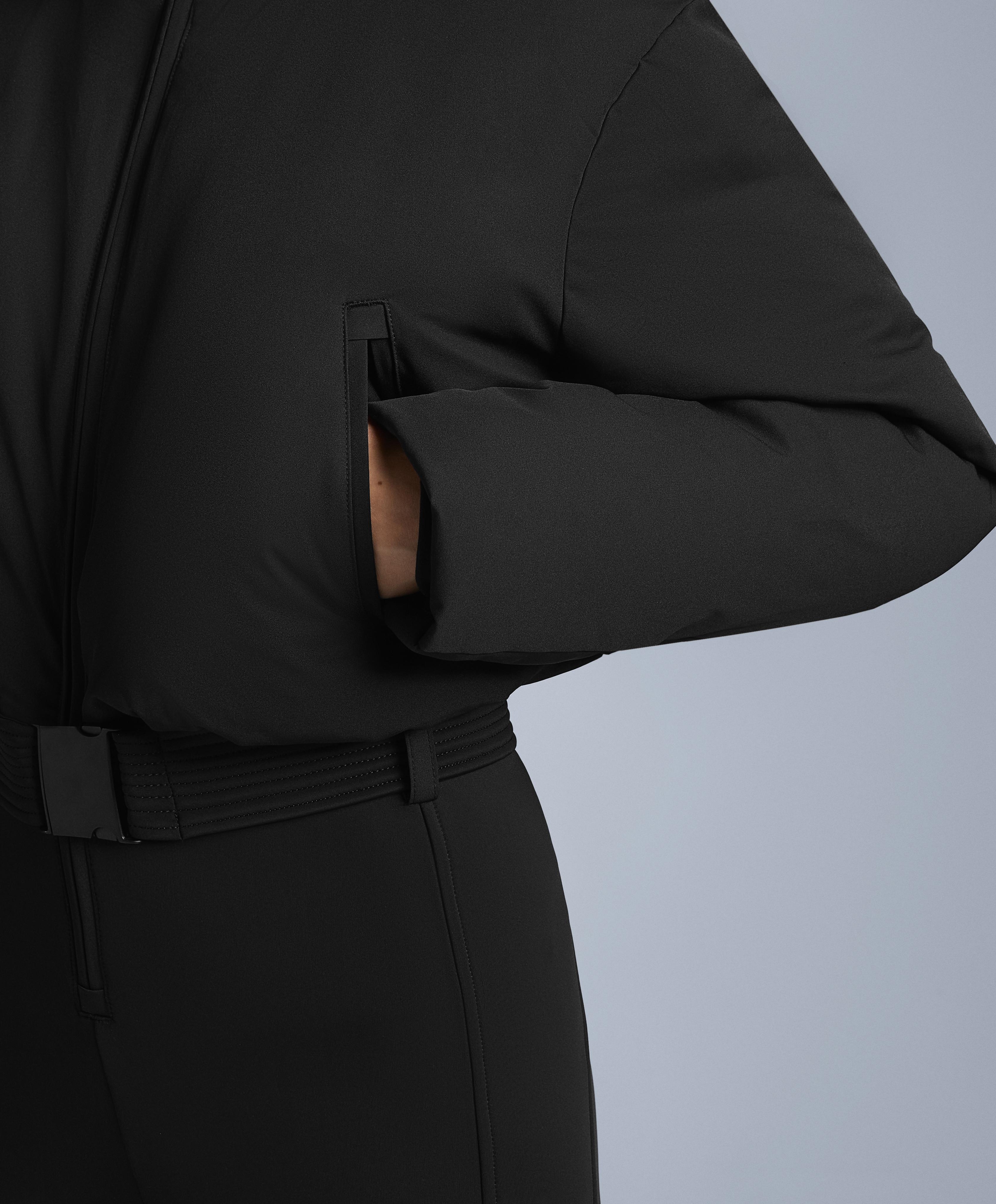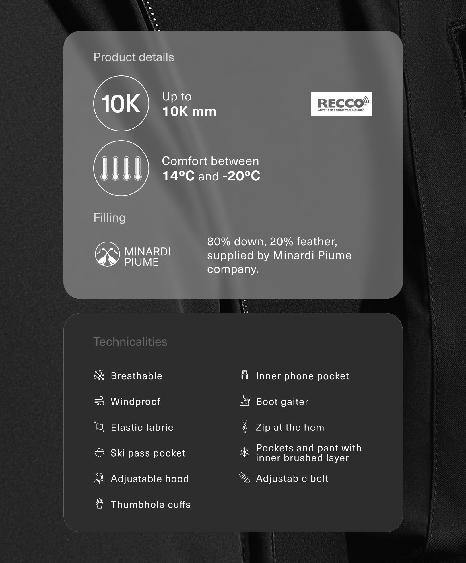 Застежка-молния спереди и регулируемый пояс. Подкладка с начесом в карманах и брюках. Карман на рукаве для ски-пасса и внутренний карман для телефона. Внутренний крючок для перчаток. Эластичные внутренние манжеты с отверстием для большого пальца. Регулируемый капюшон. Молния внизу для регулировки ширины штанин. Усиленный низ с подкладкой, препятствующей попаданию снега.