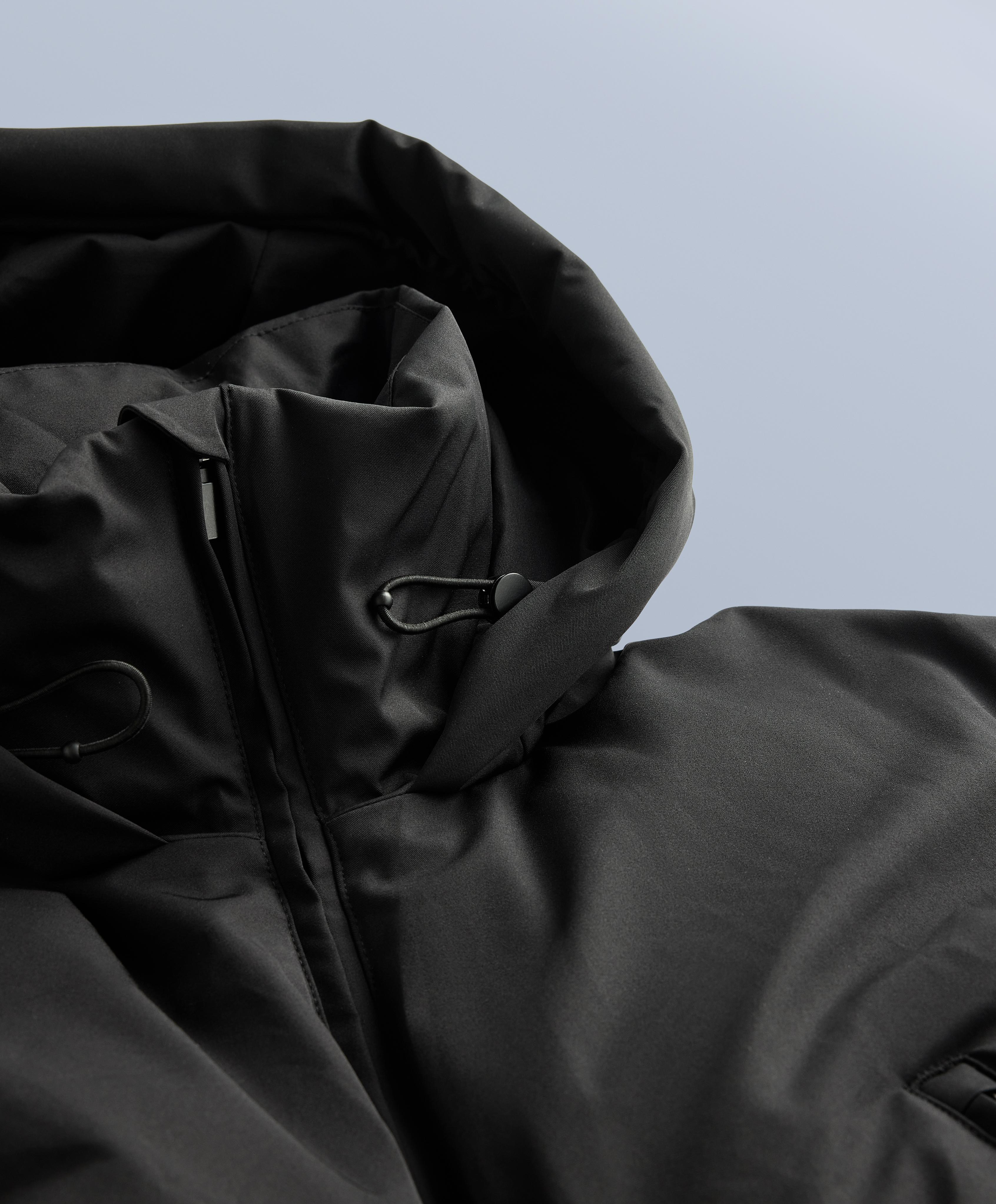 Воздухопроницаемый, ветрозащитный и эластичный материал в области брюк для повышенного комфорта. Ткань выдерживает давление воды 10 000 мм, что предотвращает промокание под легким дождем при кратковременном воздействии.