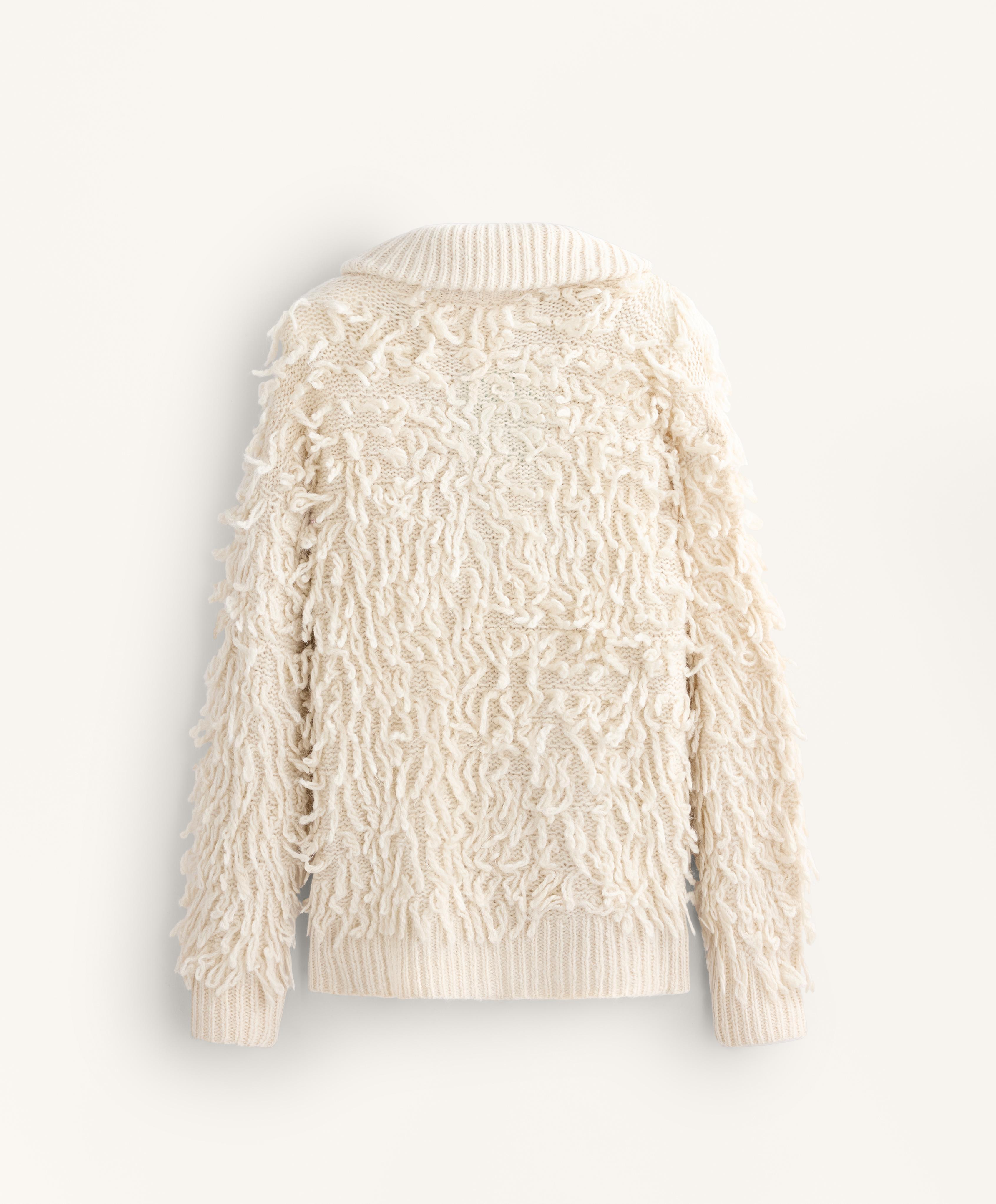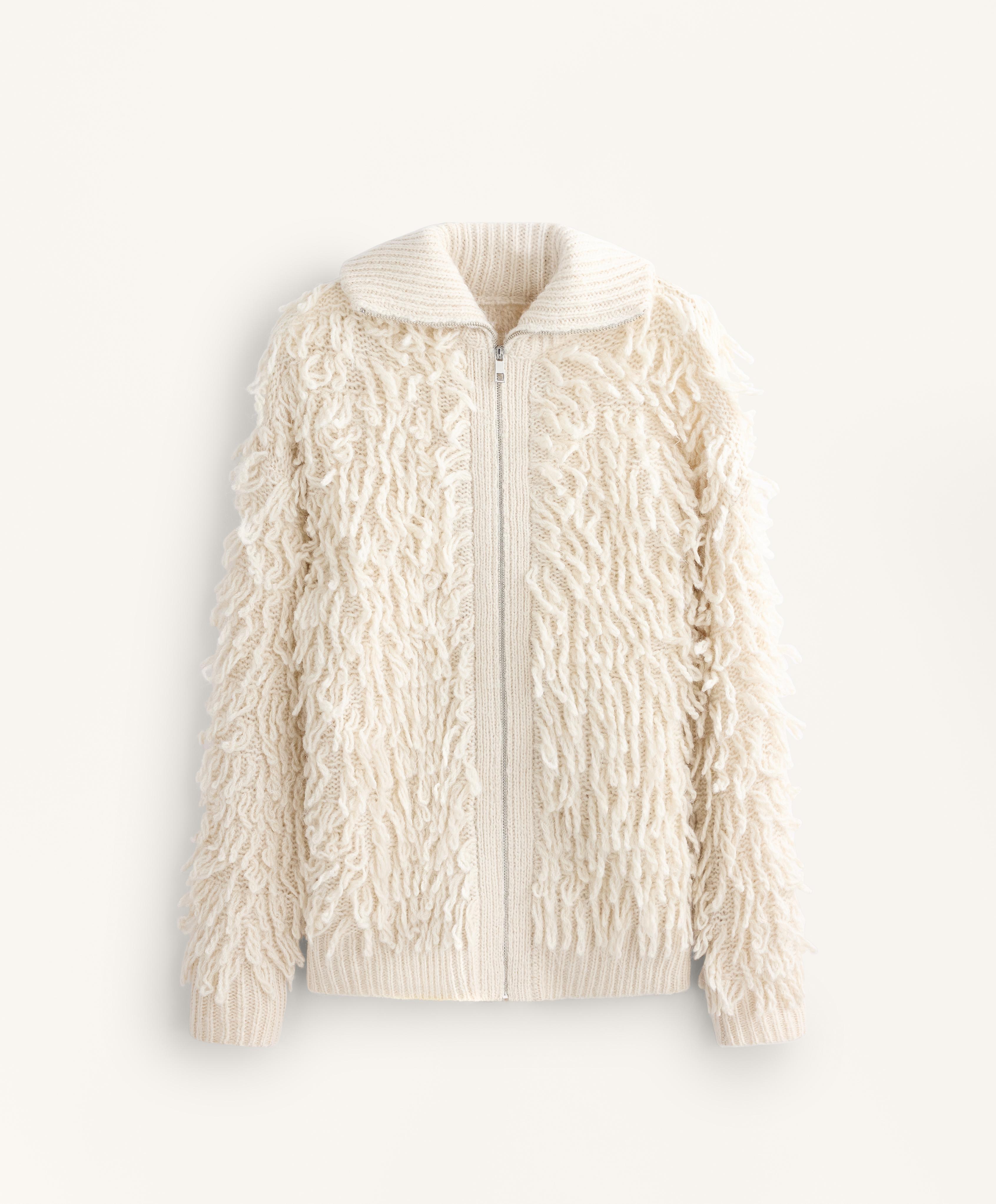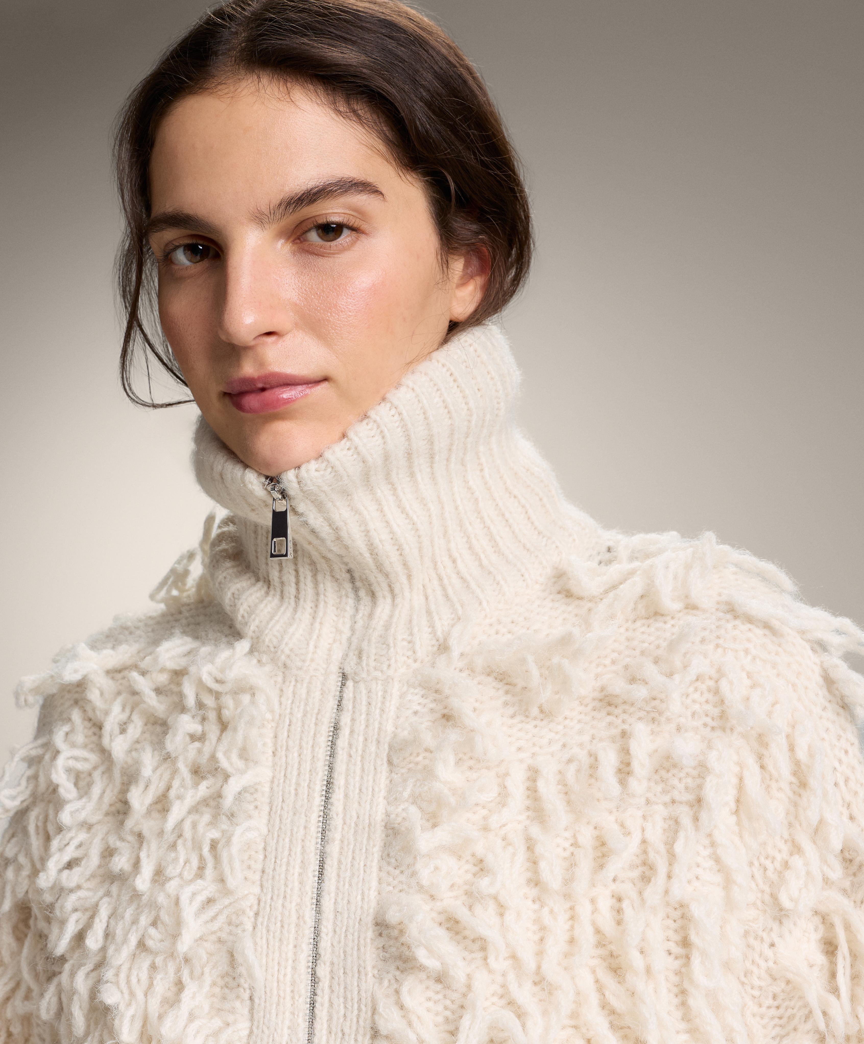 Вязаная куртка с бахромой, имитирующей мех. С высоким воротником и застежкой-молнией спереди. Отделка в рубчик на манжетах, воротнике и по низу.
