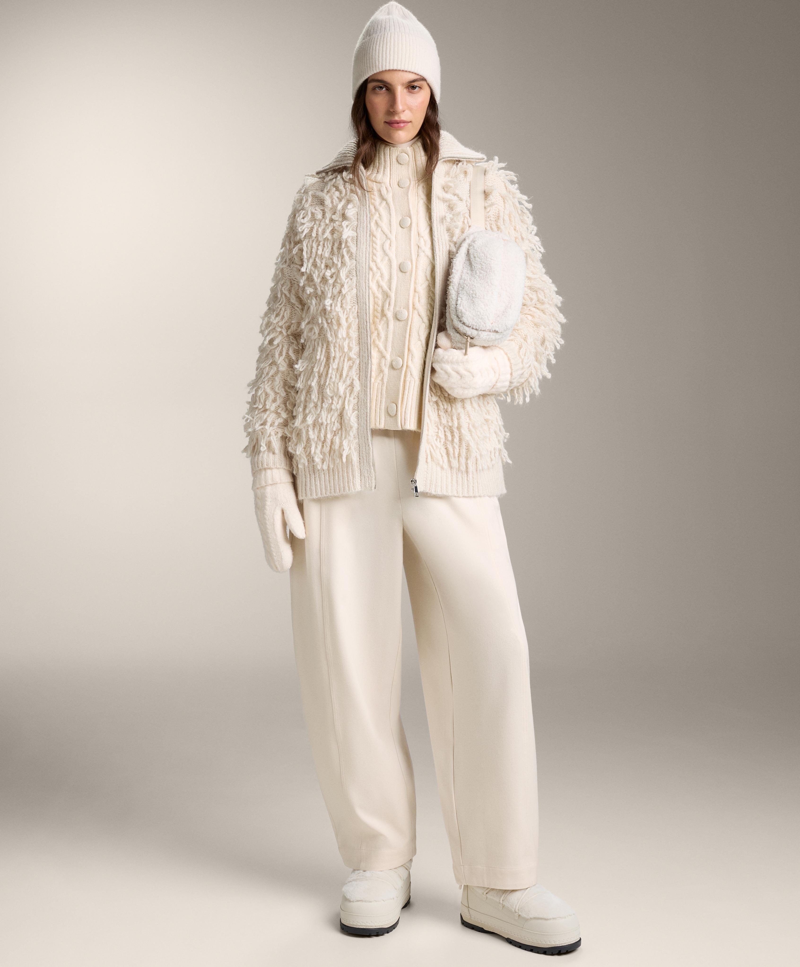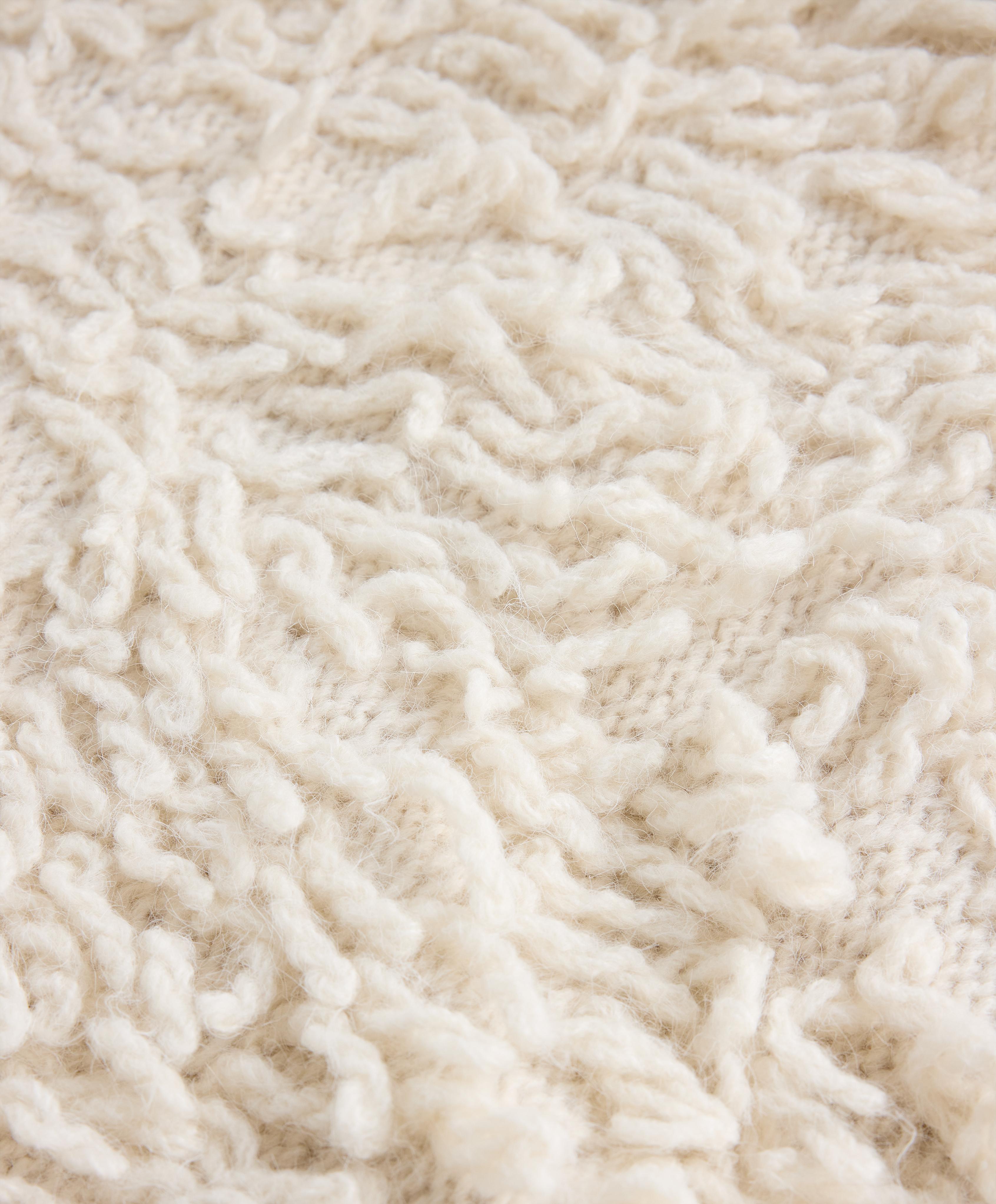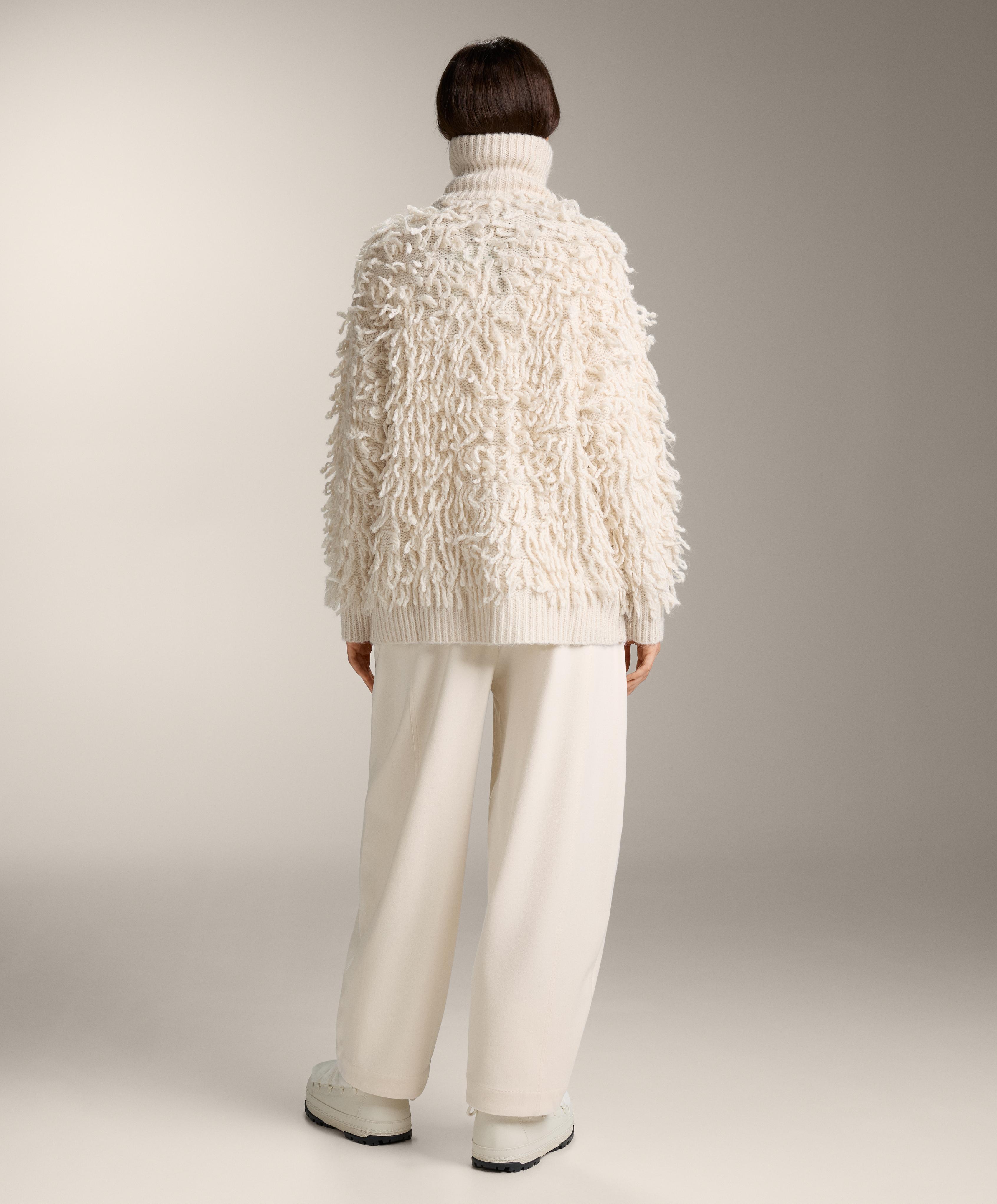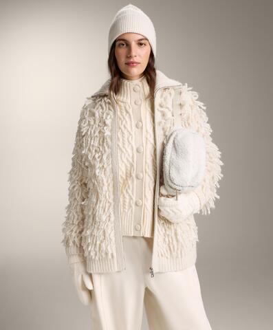 Вязаная куртка с бахромой, имитирующей мех. С высоким воротником и застежкой-молнией спереди. Отделка в рубчик на манжетах, воротнике и по низу.