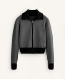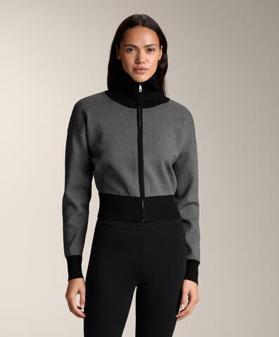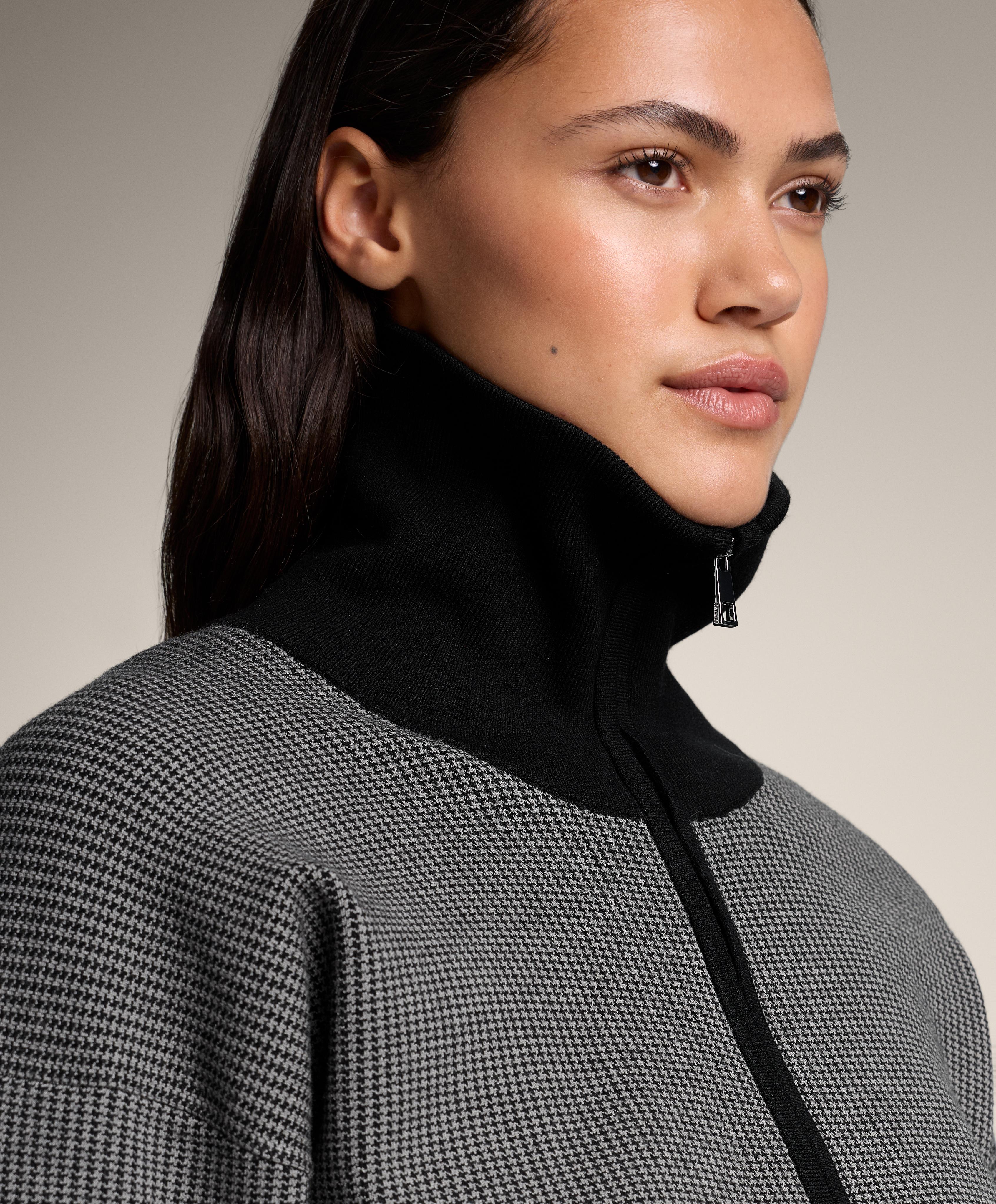Вязаная куртка с высоким воротником и застежкой-молнией спереди. Контрастная отделка в рубчик на манжетах, воротнике и по низу. Вязаная ткань с принтом.