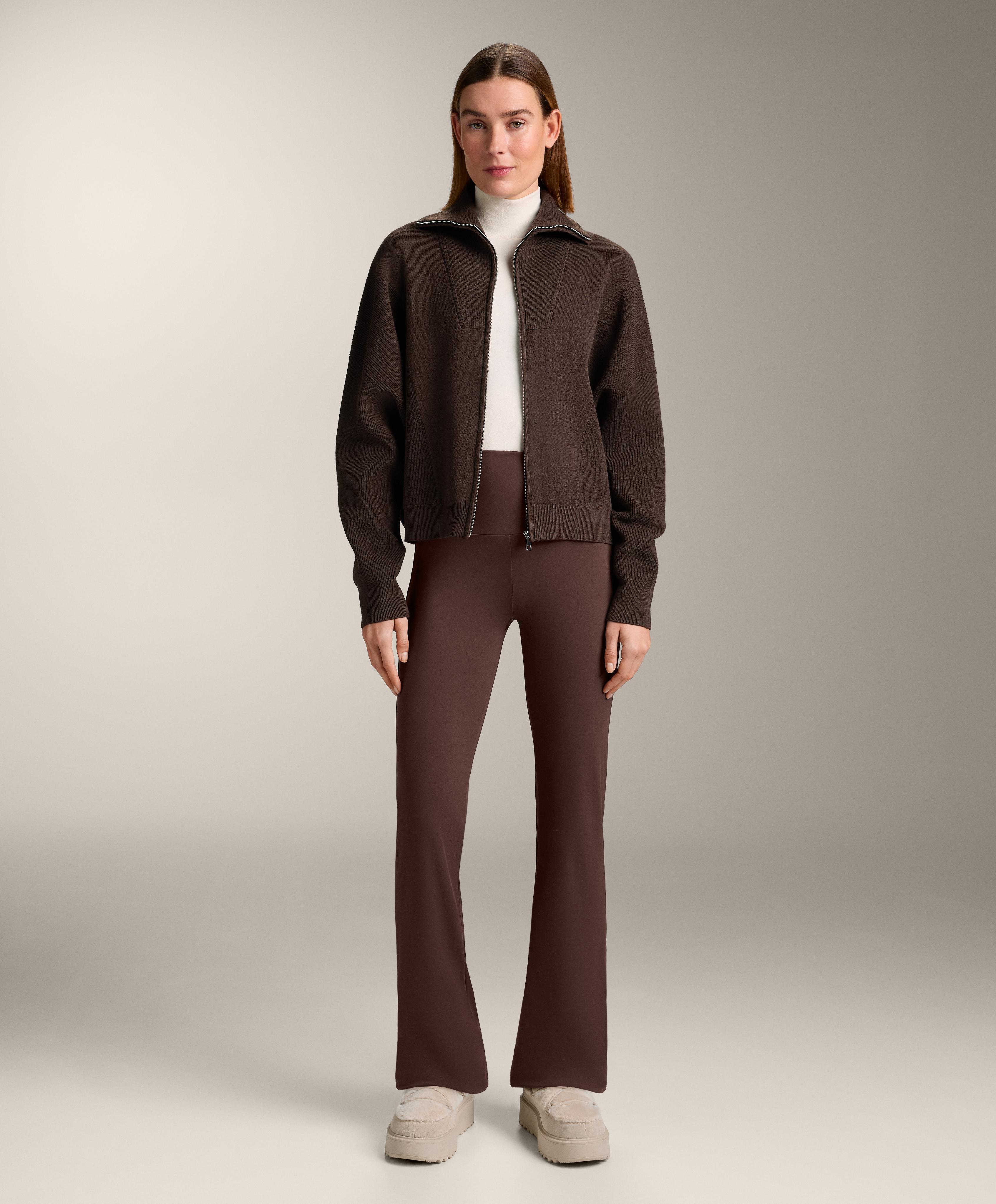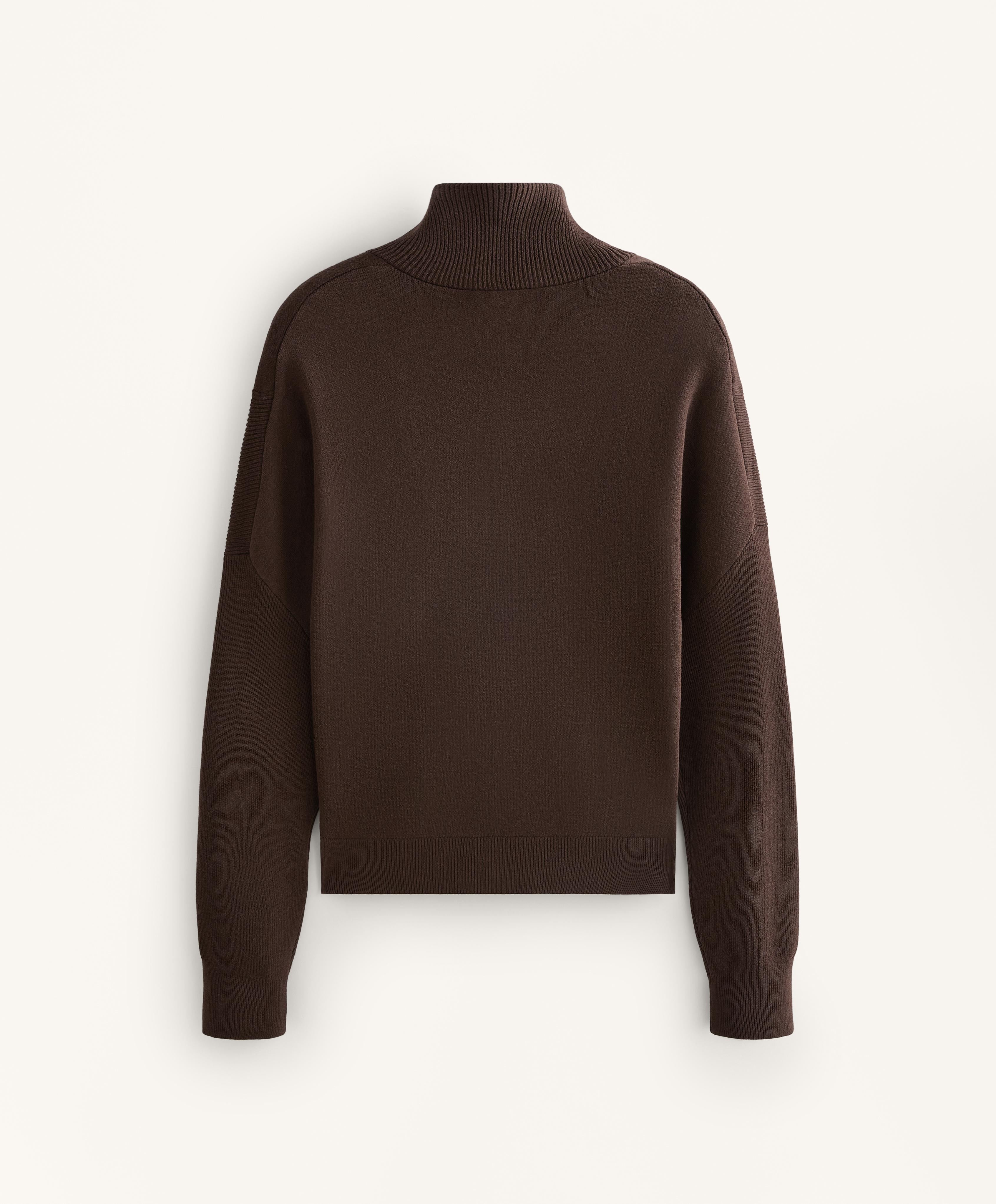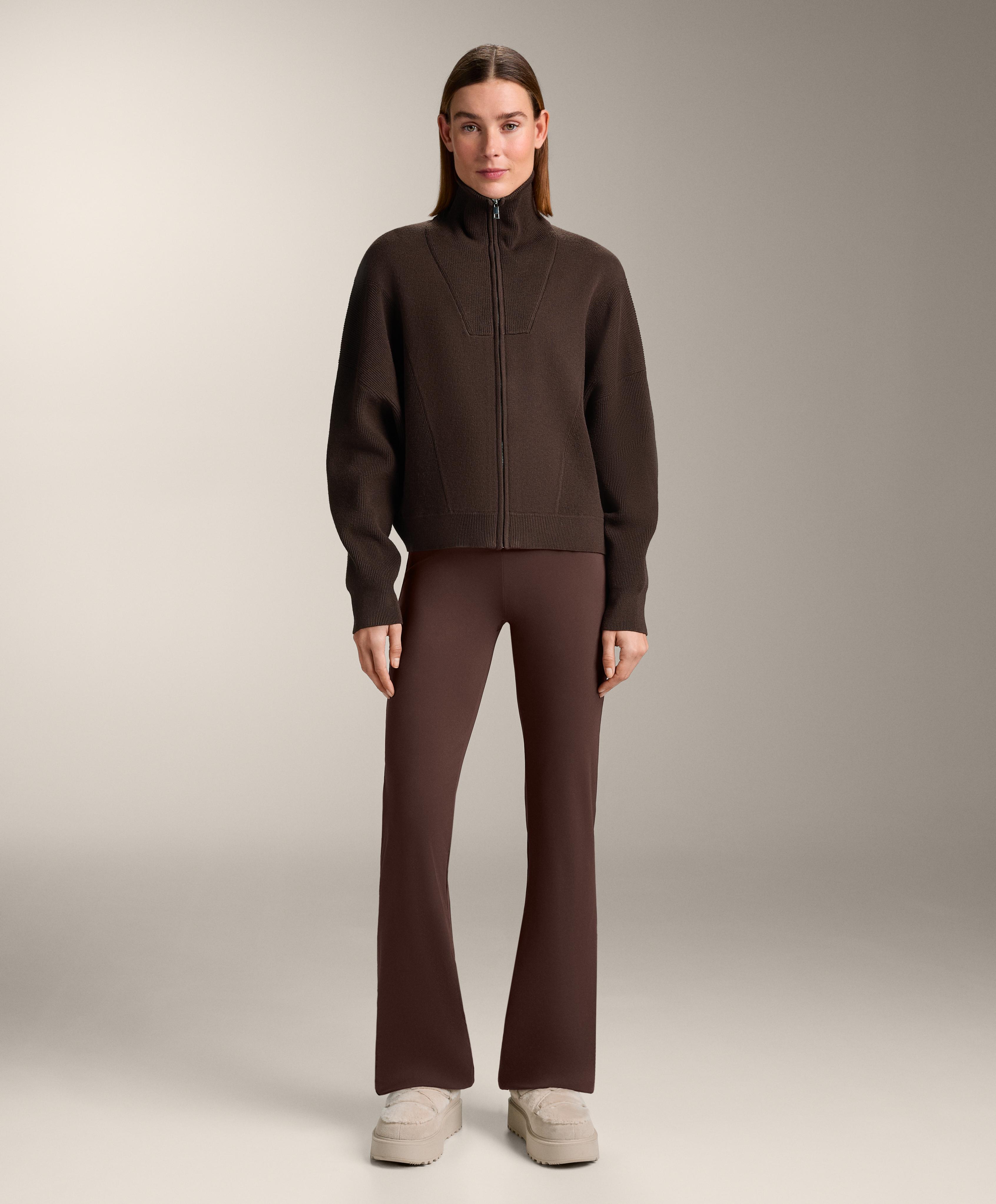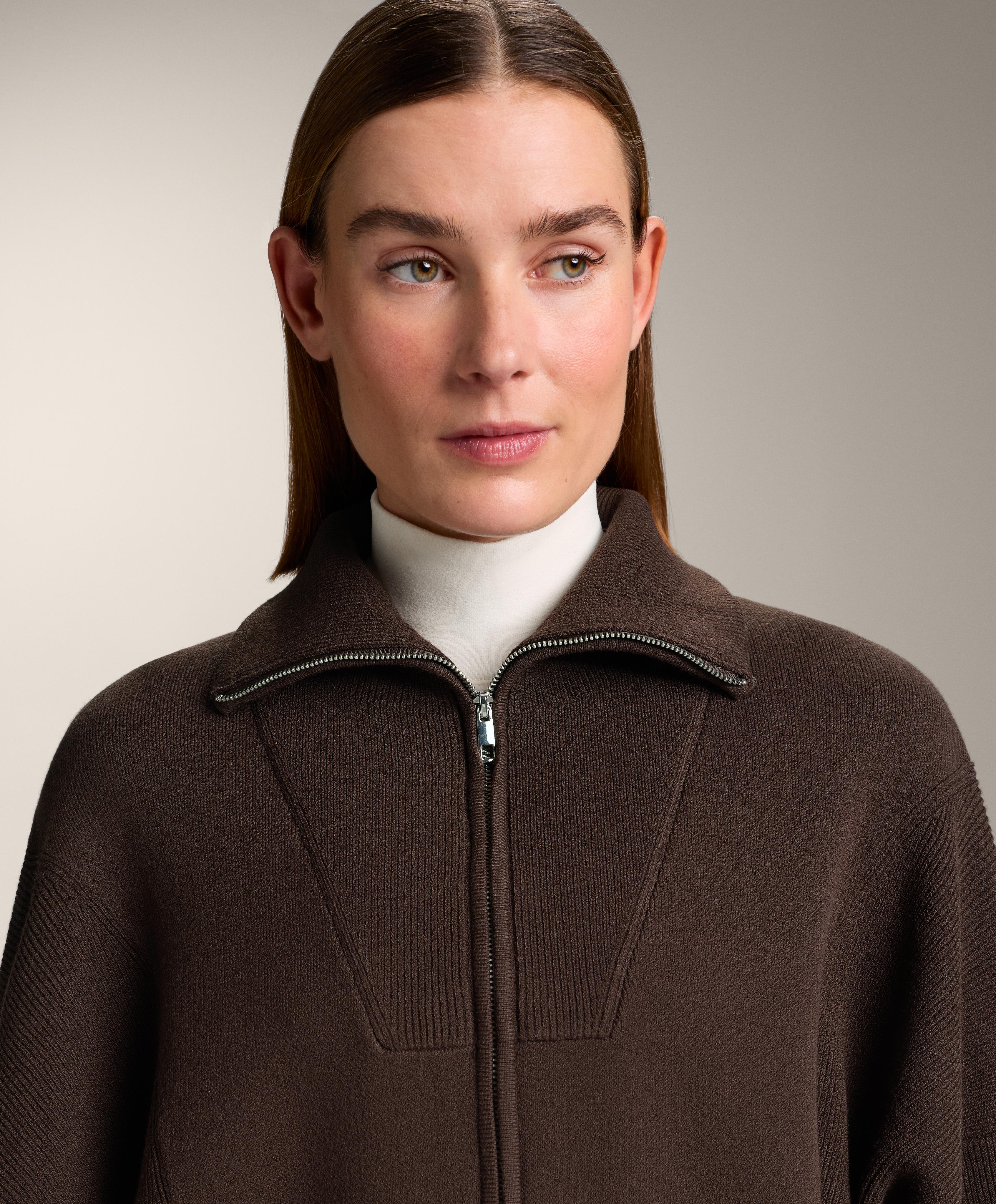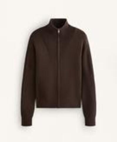 Вязаная куртка с высоким воротником в рубчик. Застежка на молнию спереди и детали в рубчик на манжетах и нижней кромке.