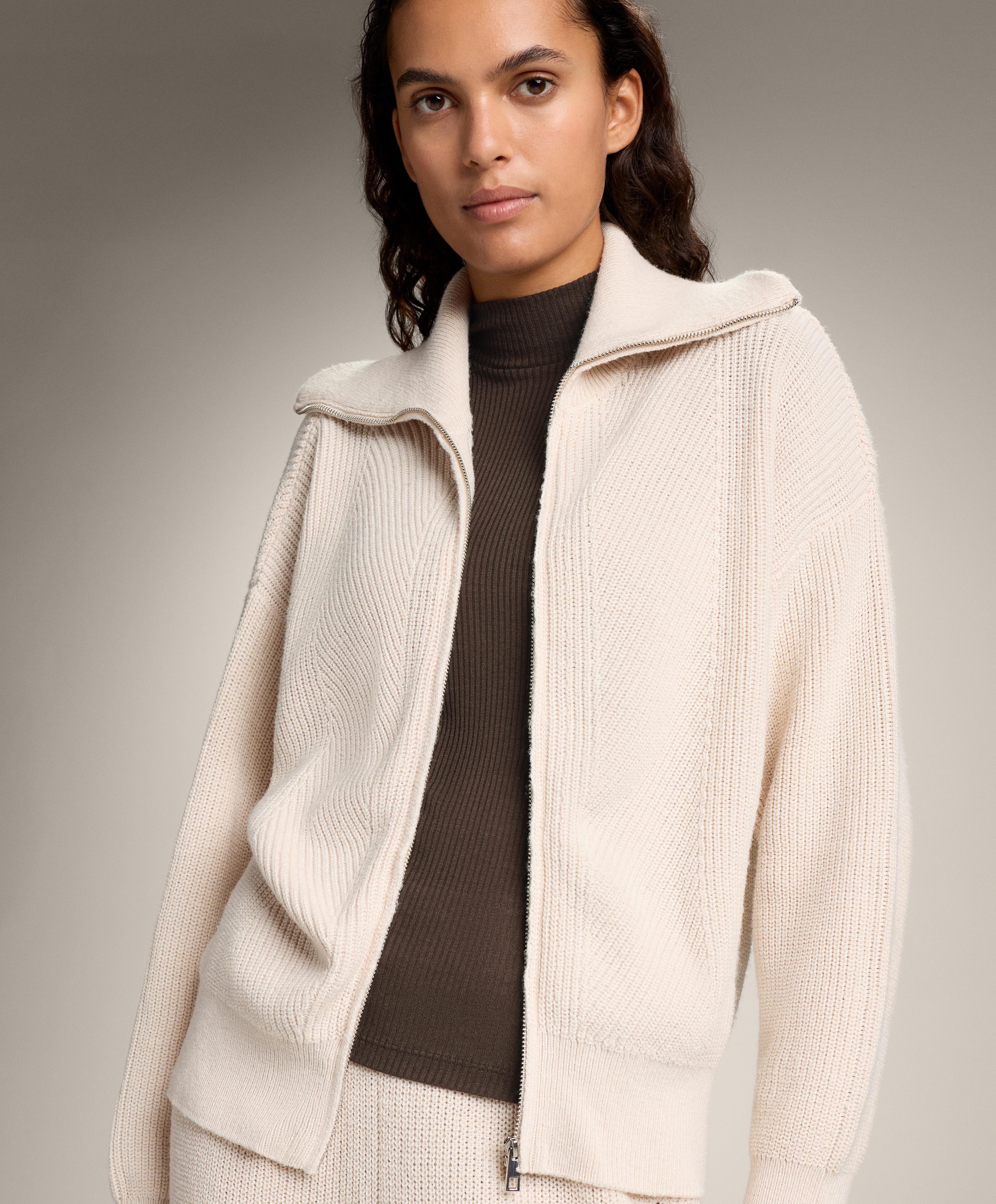 Вязаная куртка с отложным воротником и застежкой-молнией спереди.