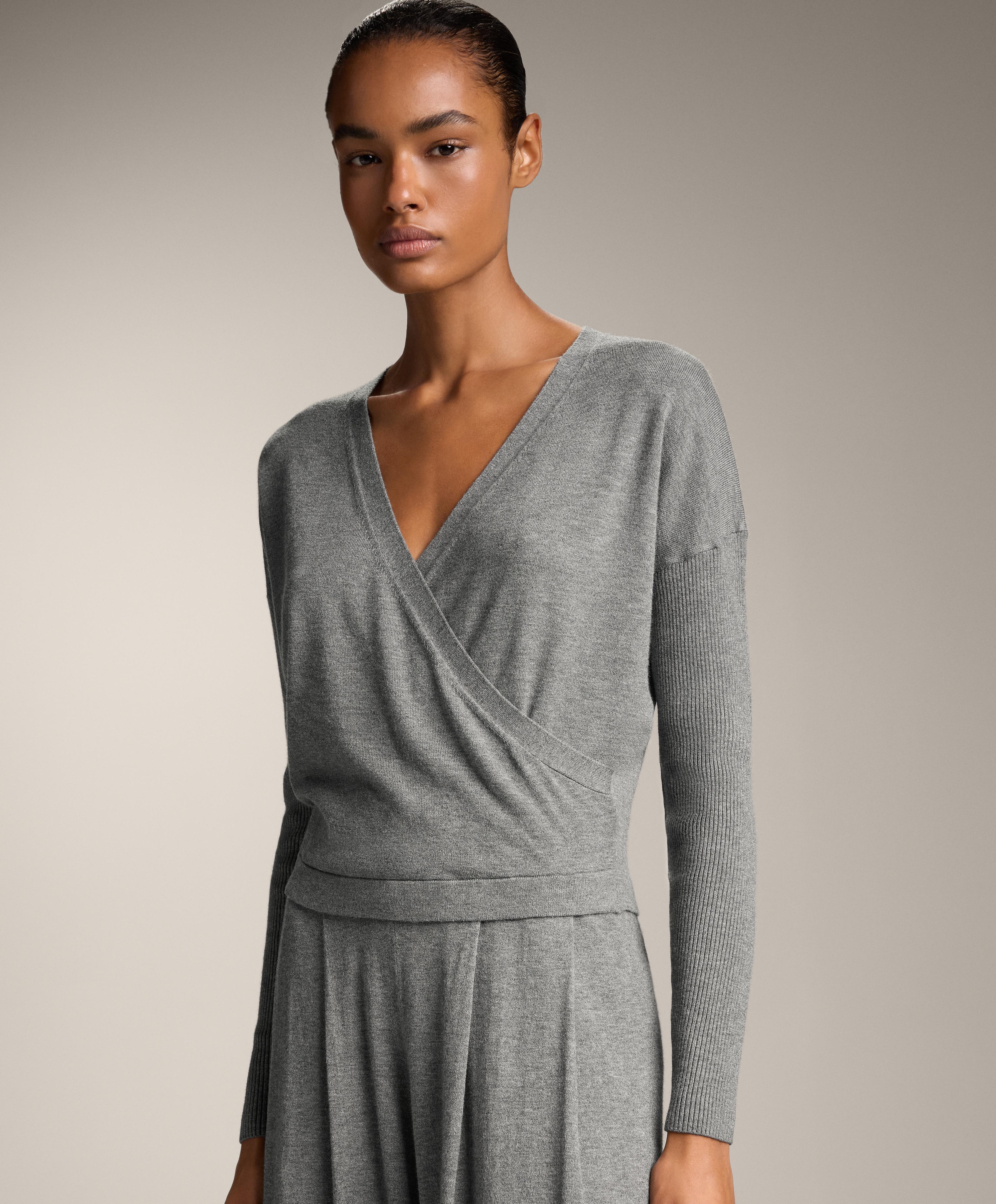 Oysho Вязаный джемпер с запа́хом, рукава в рубчик, серый меланж