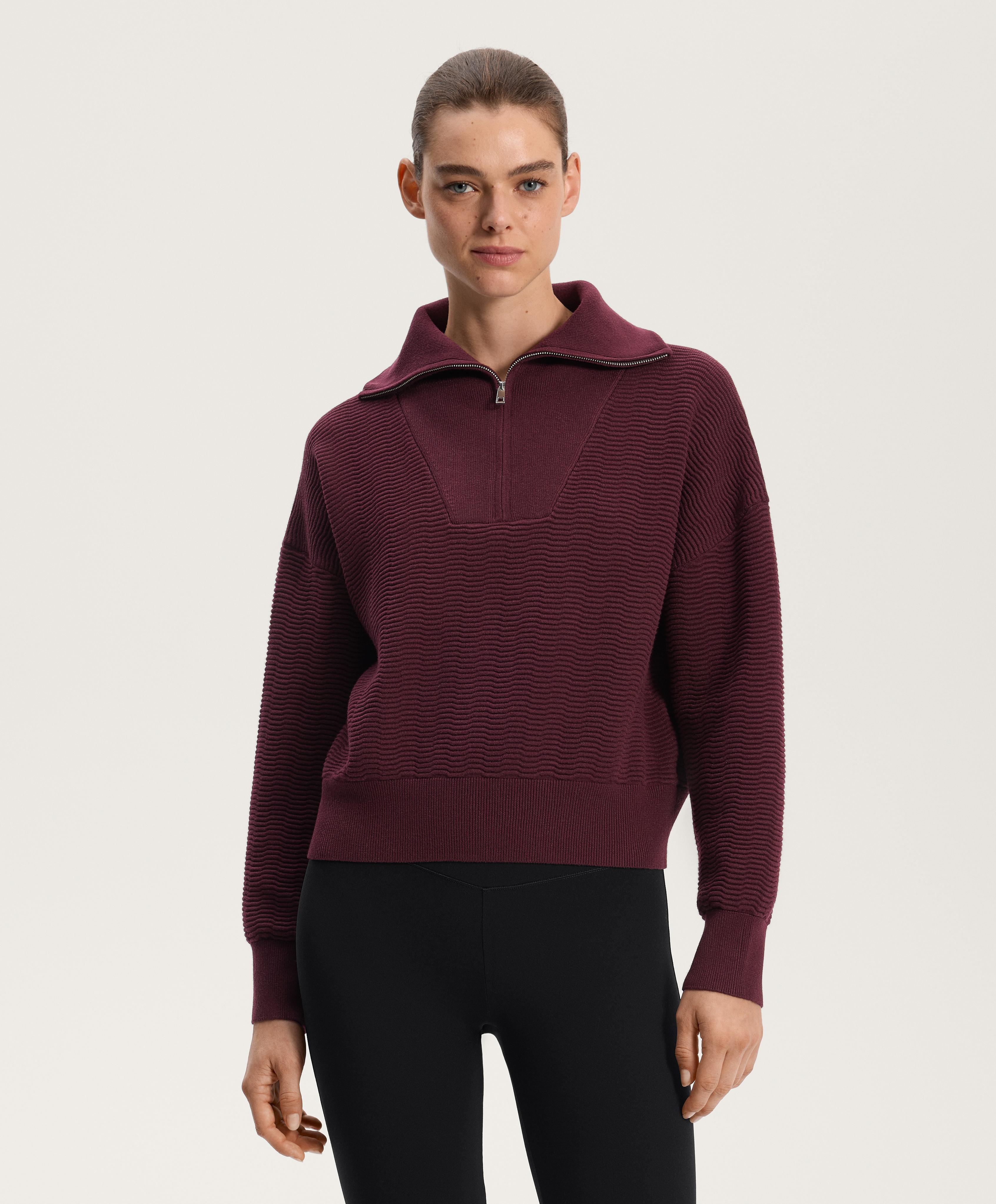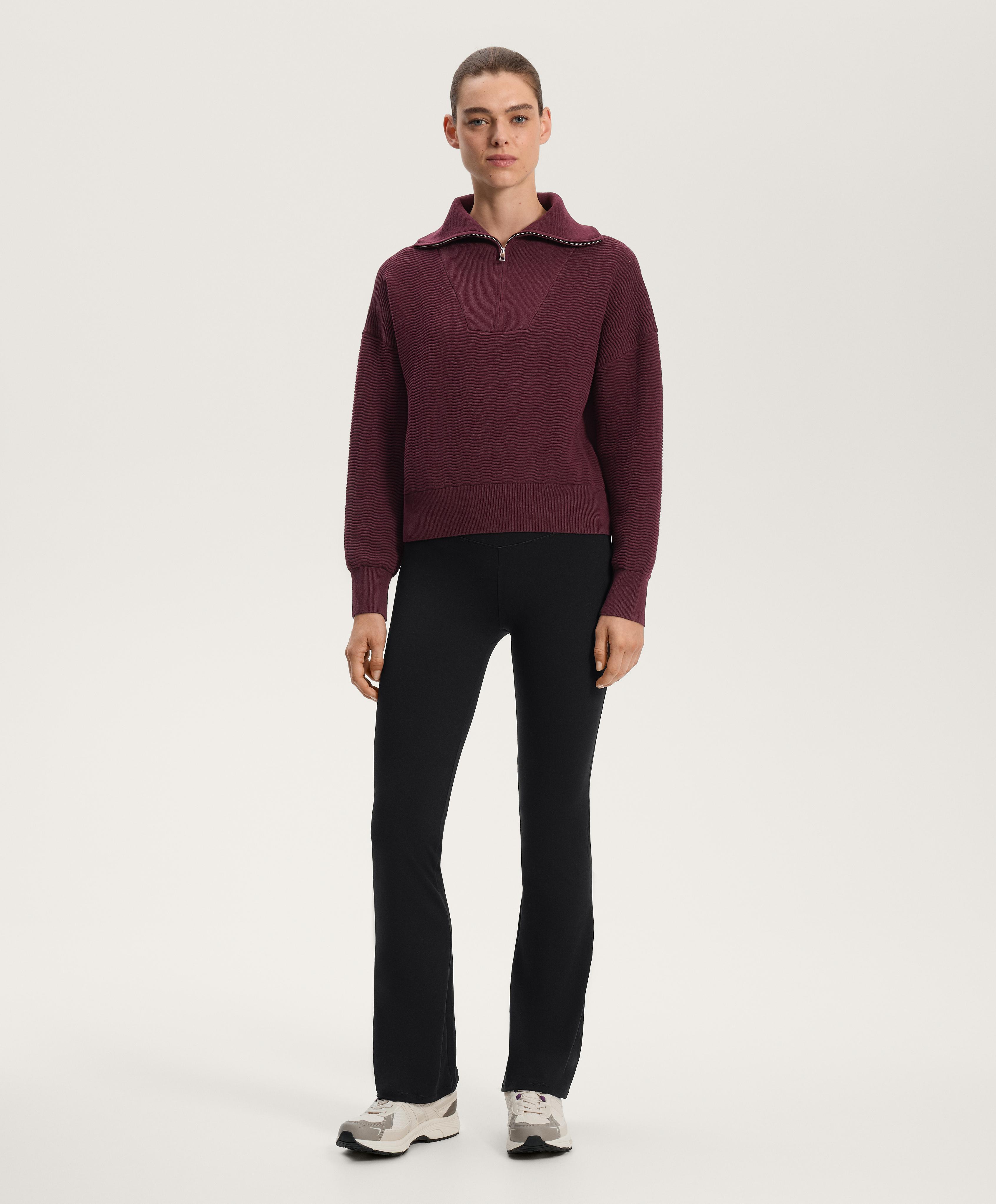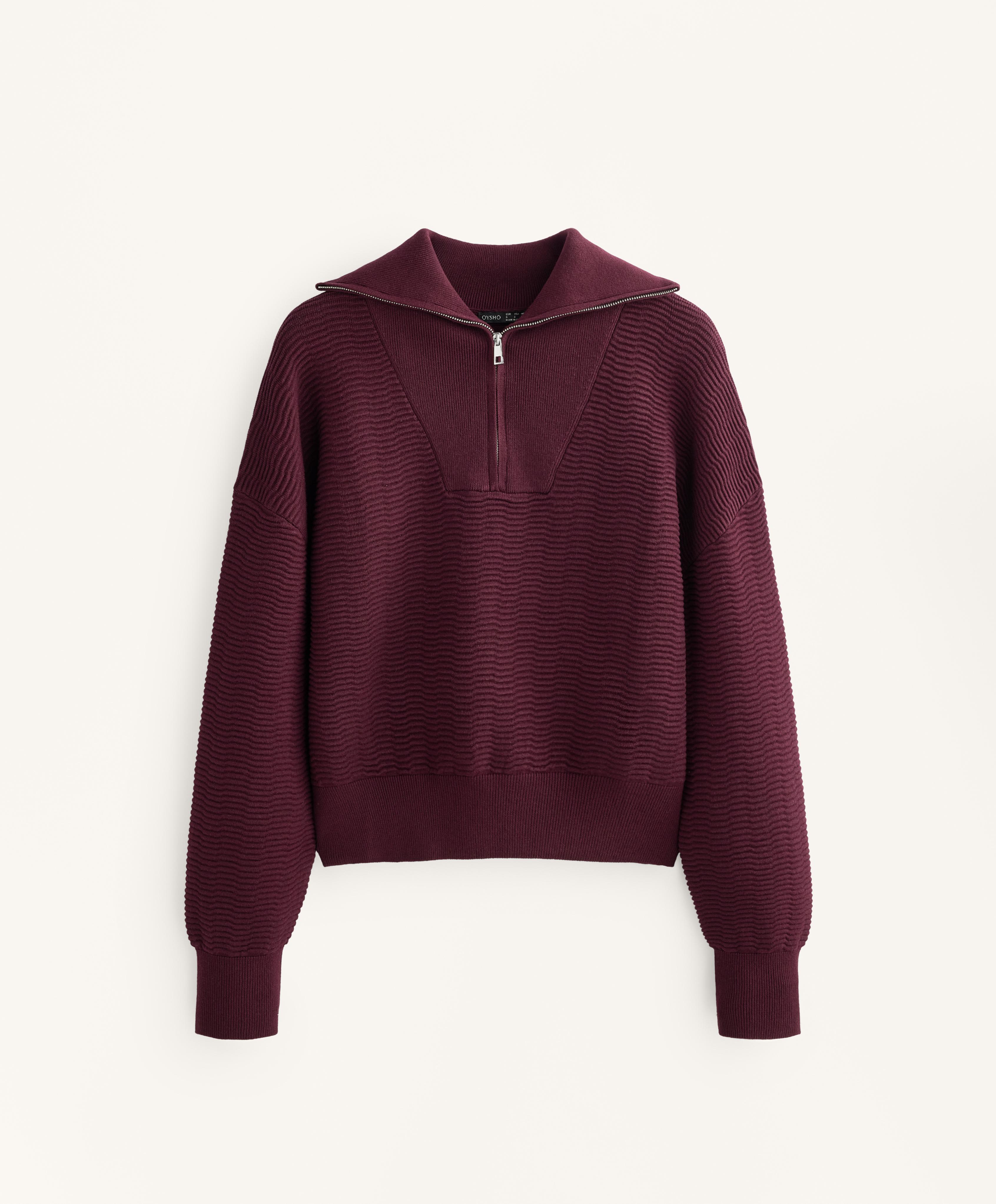 Oysho Вязаный свитер с молнией структурной вязки, темно-гранатовый