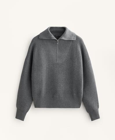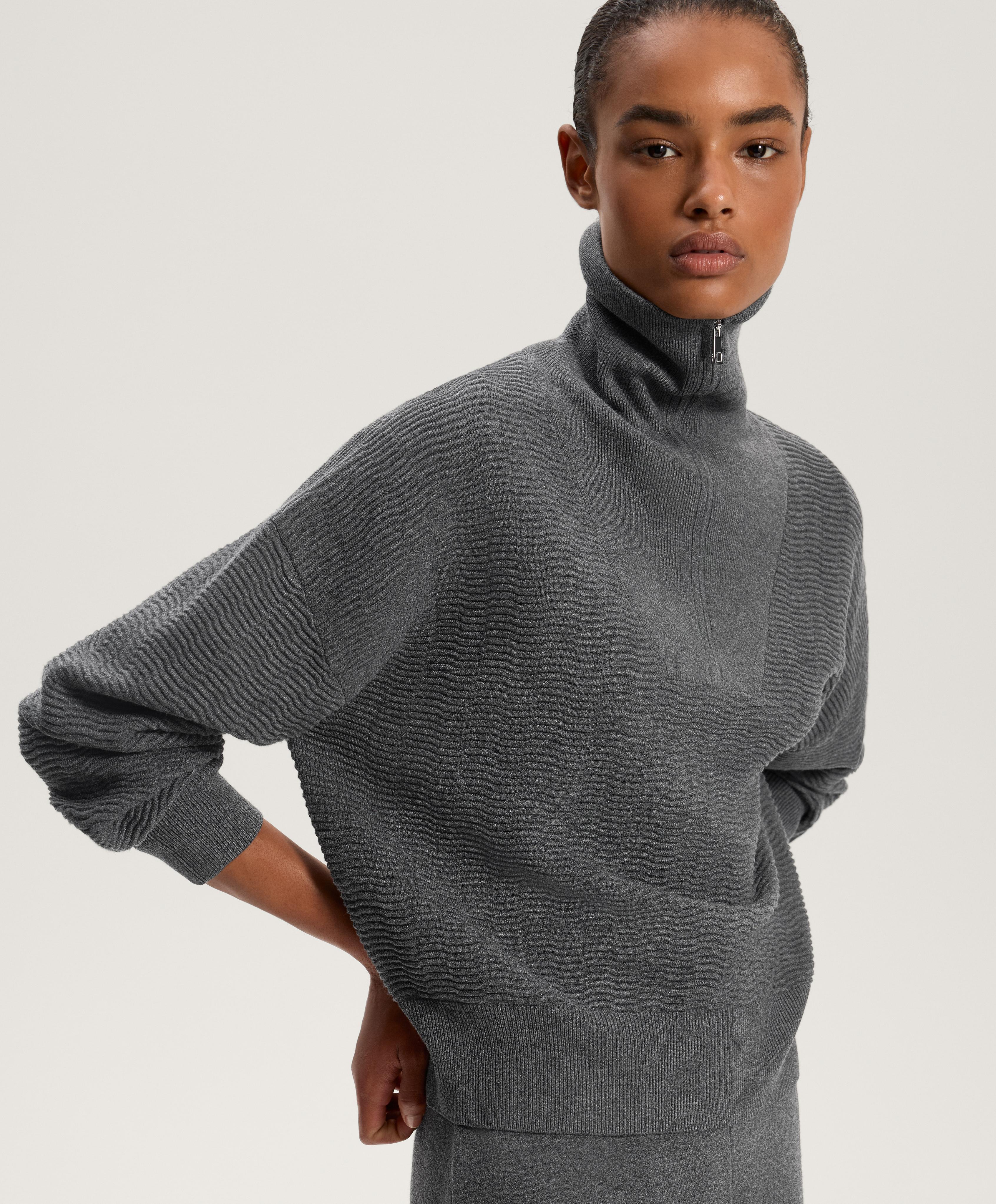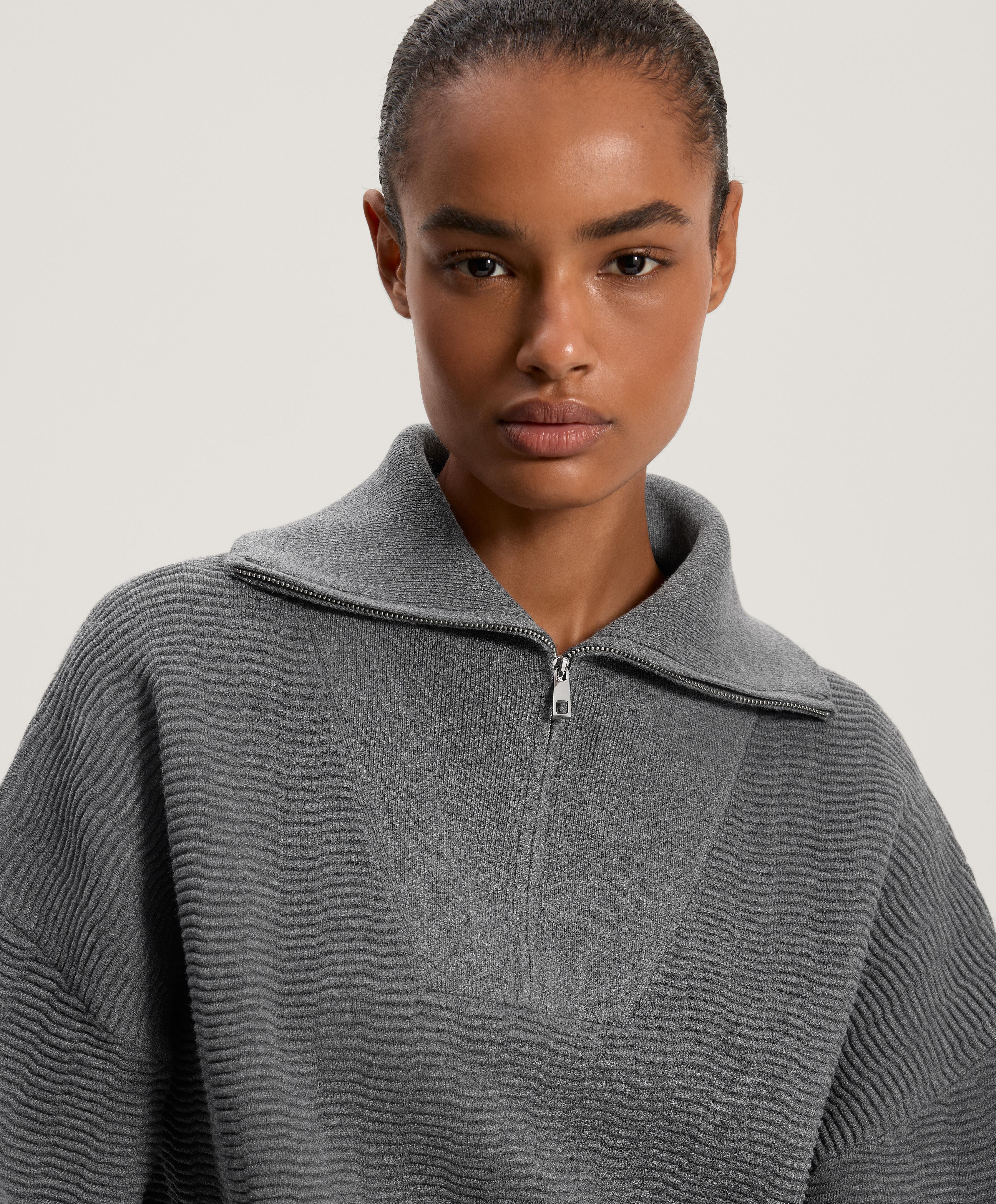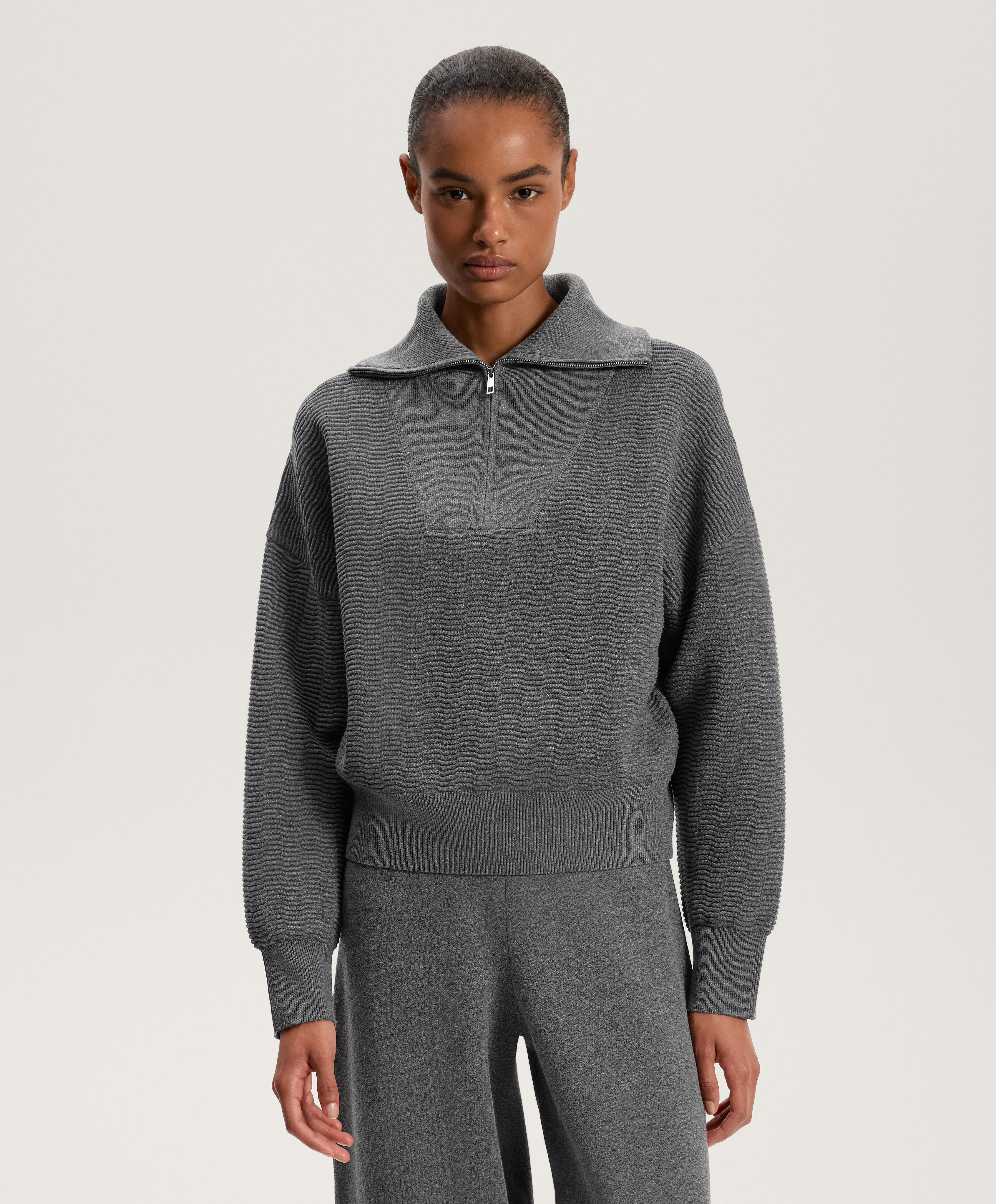 Oysho Вязаный свитер с молнией структурной вязки, темно-серый меланж