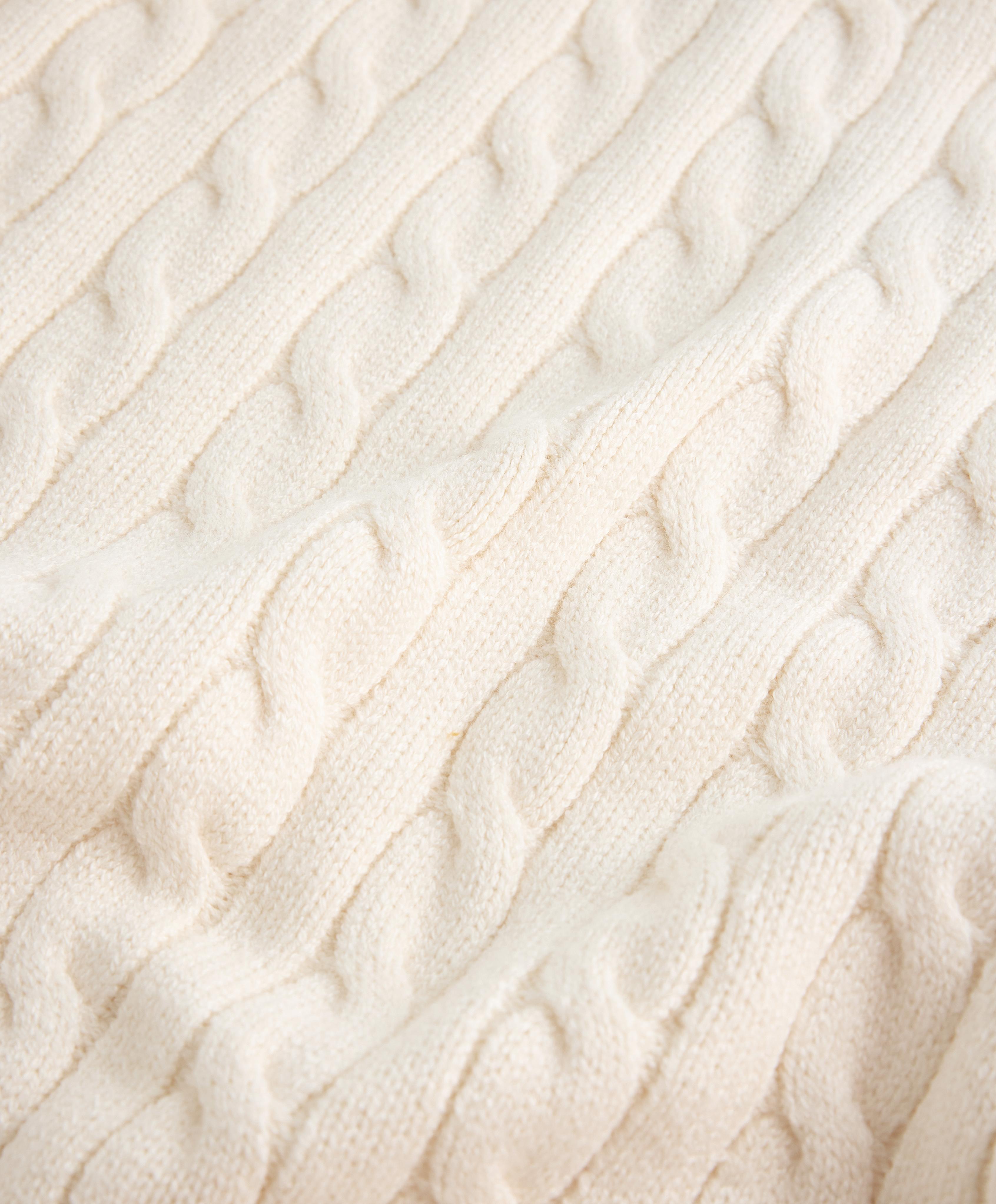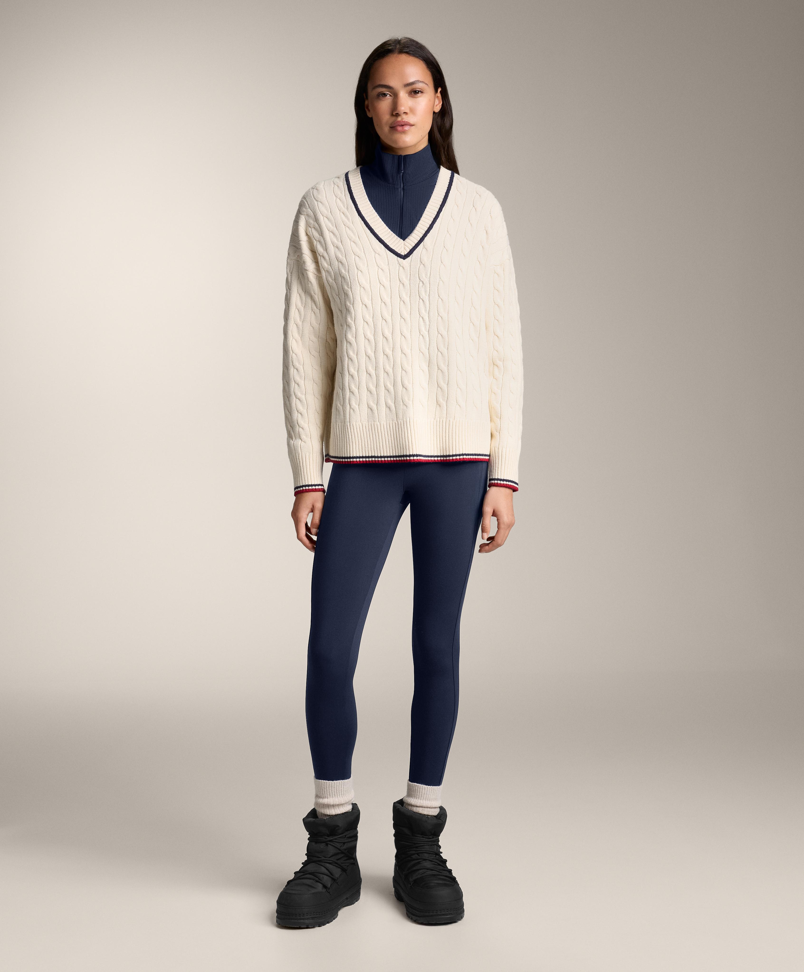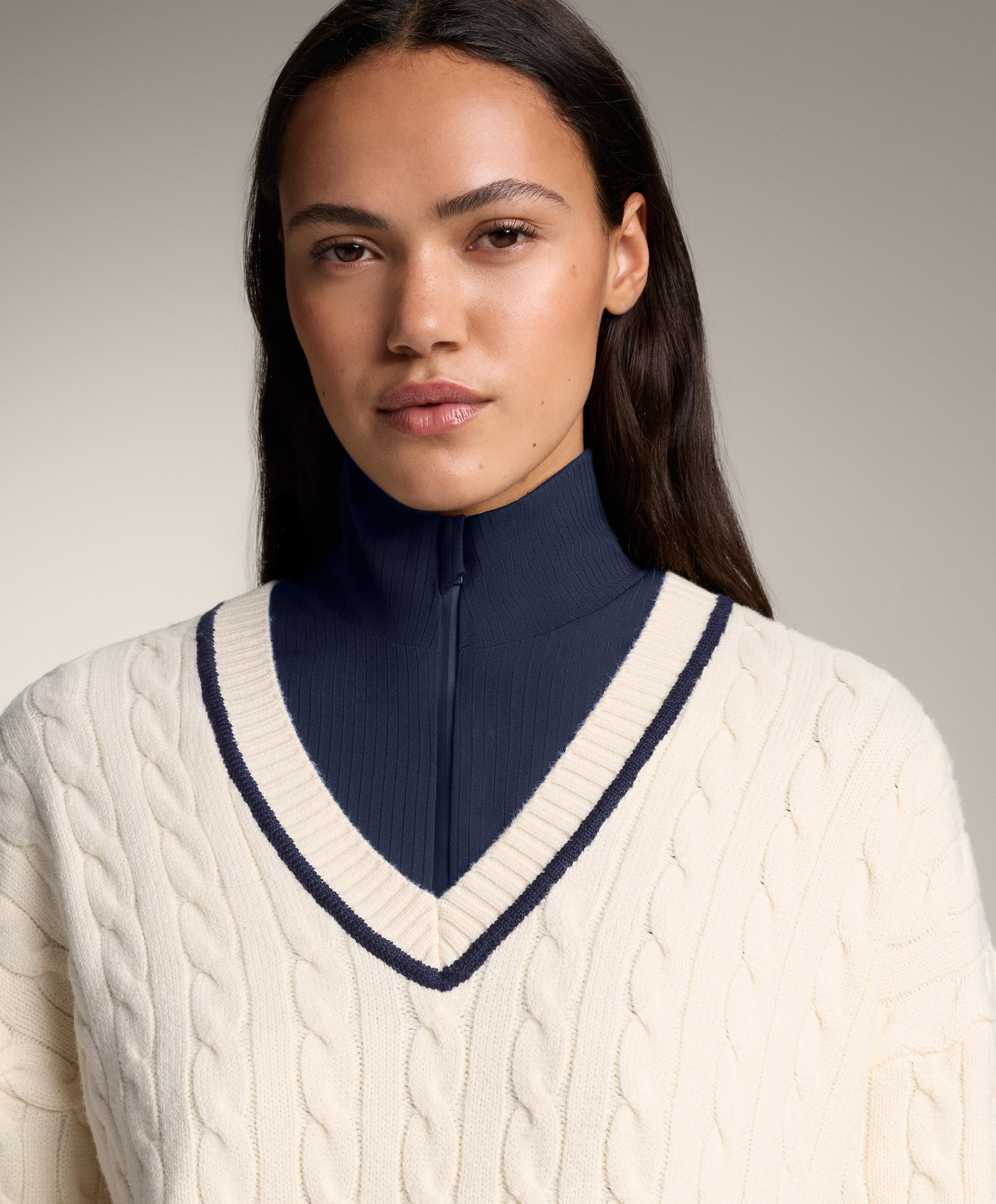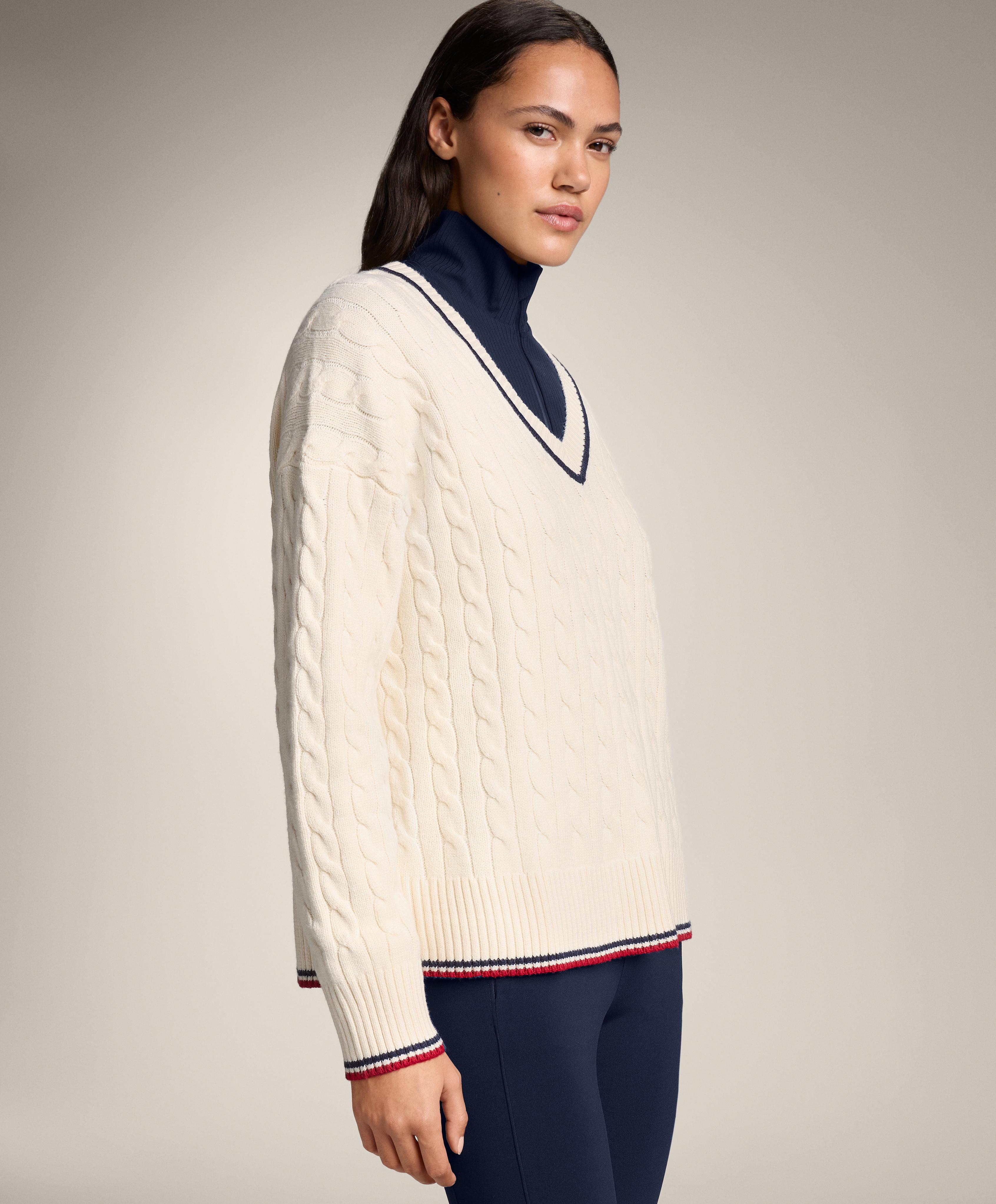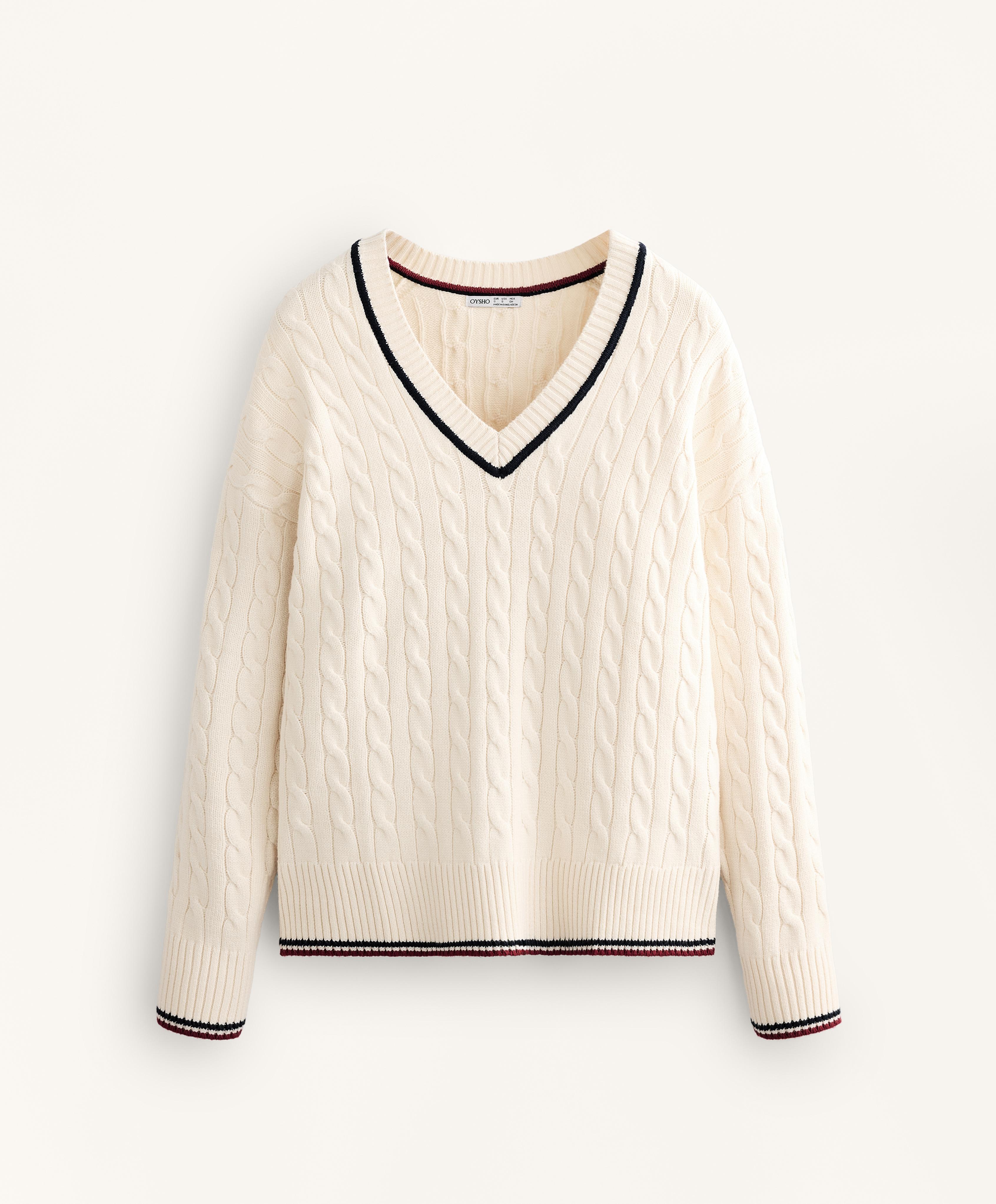 Вязаный свитер с V-образным вырезом и узором из мини-кос. С контрастной отделкой на воротнике, манжетах и по низу.