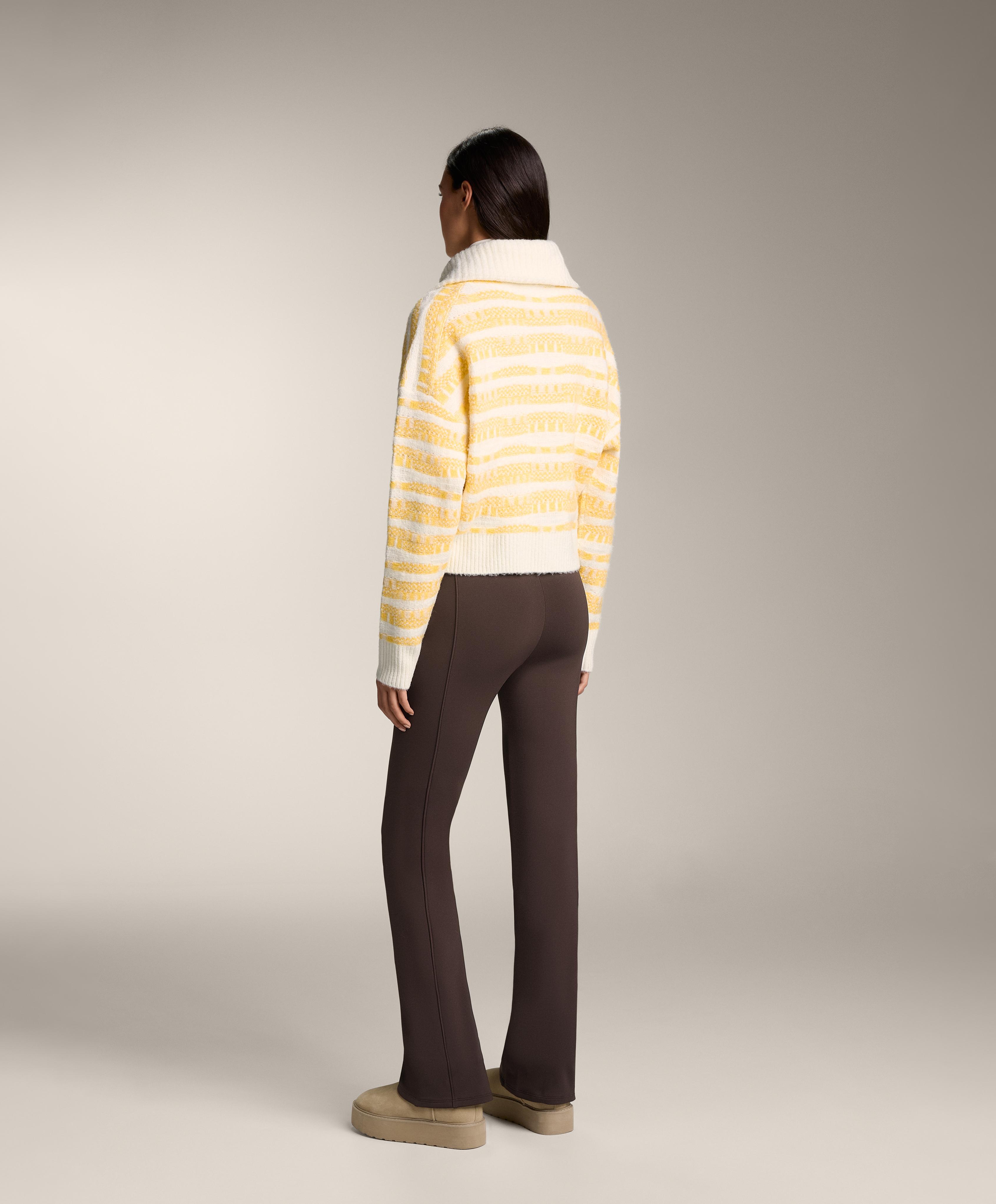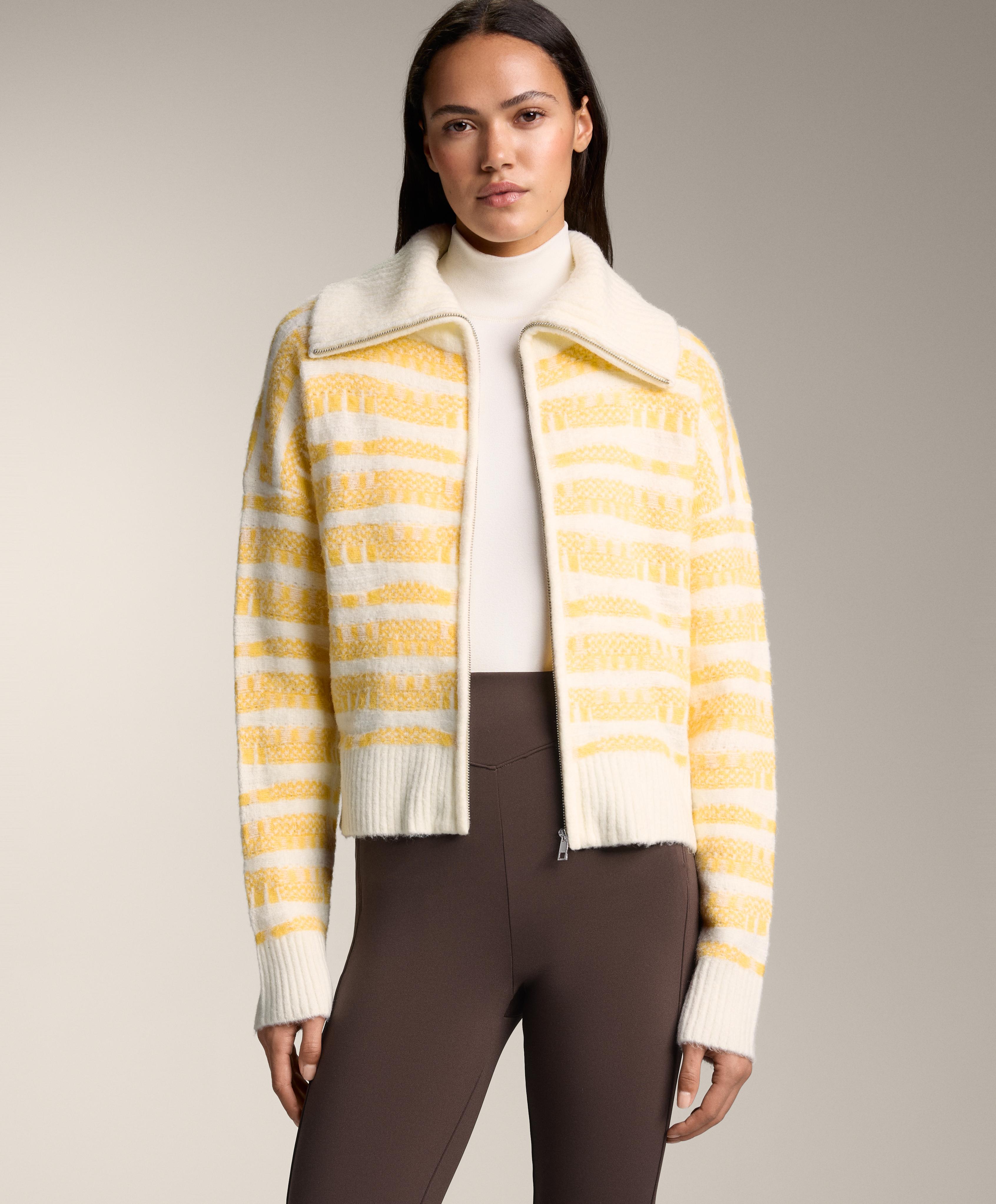 Вязаный жакет с высоким воротником и застежкой-молнией спереди. С жаккардовым принтом в полоску и высоким воротником. Отделка в рубчик на воротнике, снизу и на манжетах.