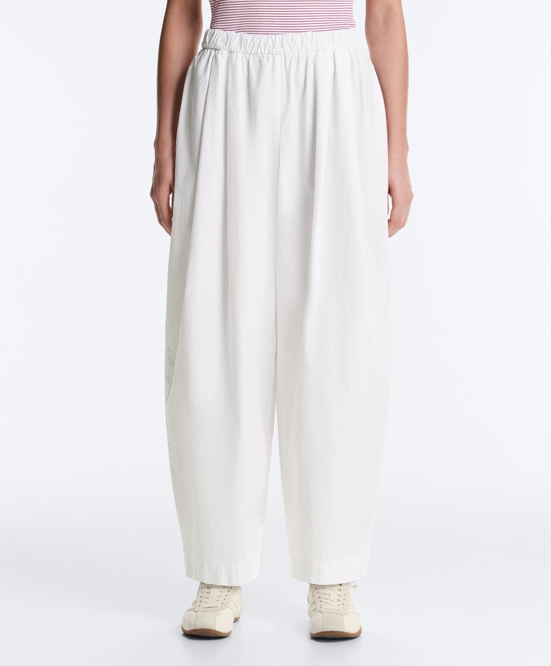 Длинные зауженные брюки с регулируемым эластичным поясом и двойной складкой по всей длине штанин. Незаметная отделка швов по низу штанин. Изготовлены из 100% хлопка.