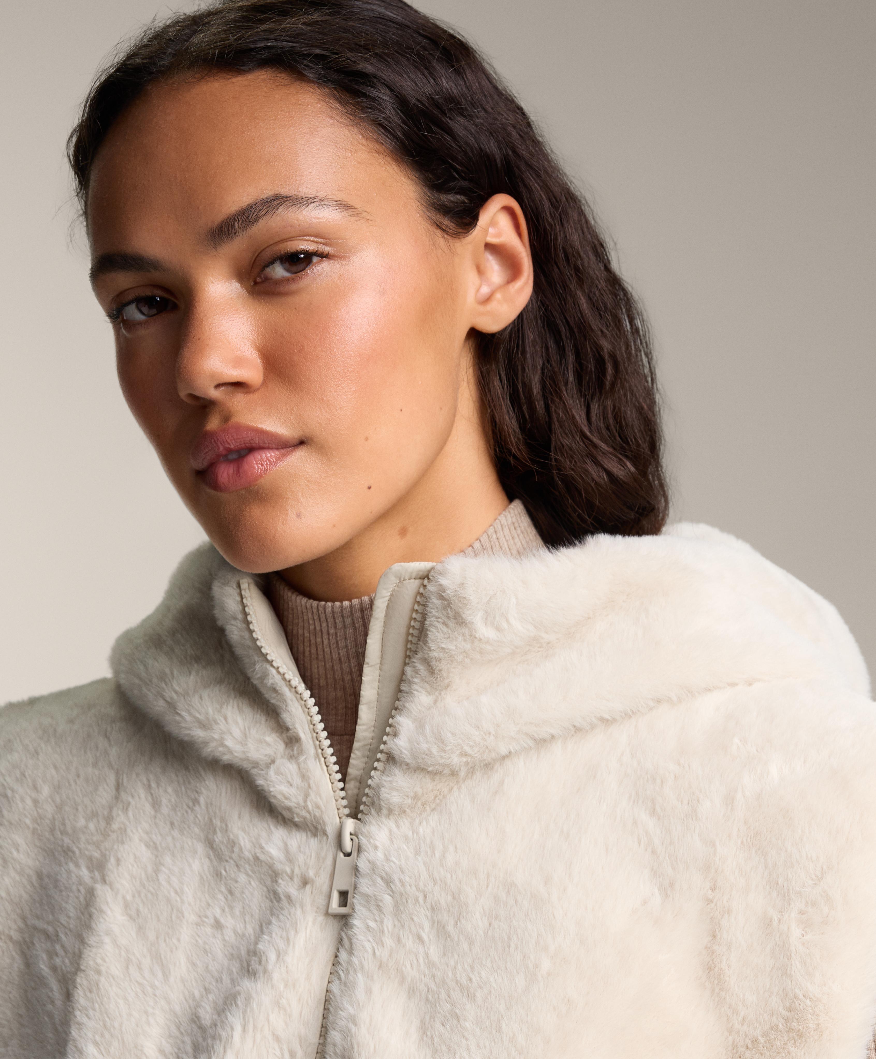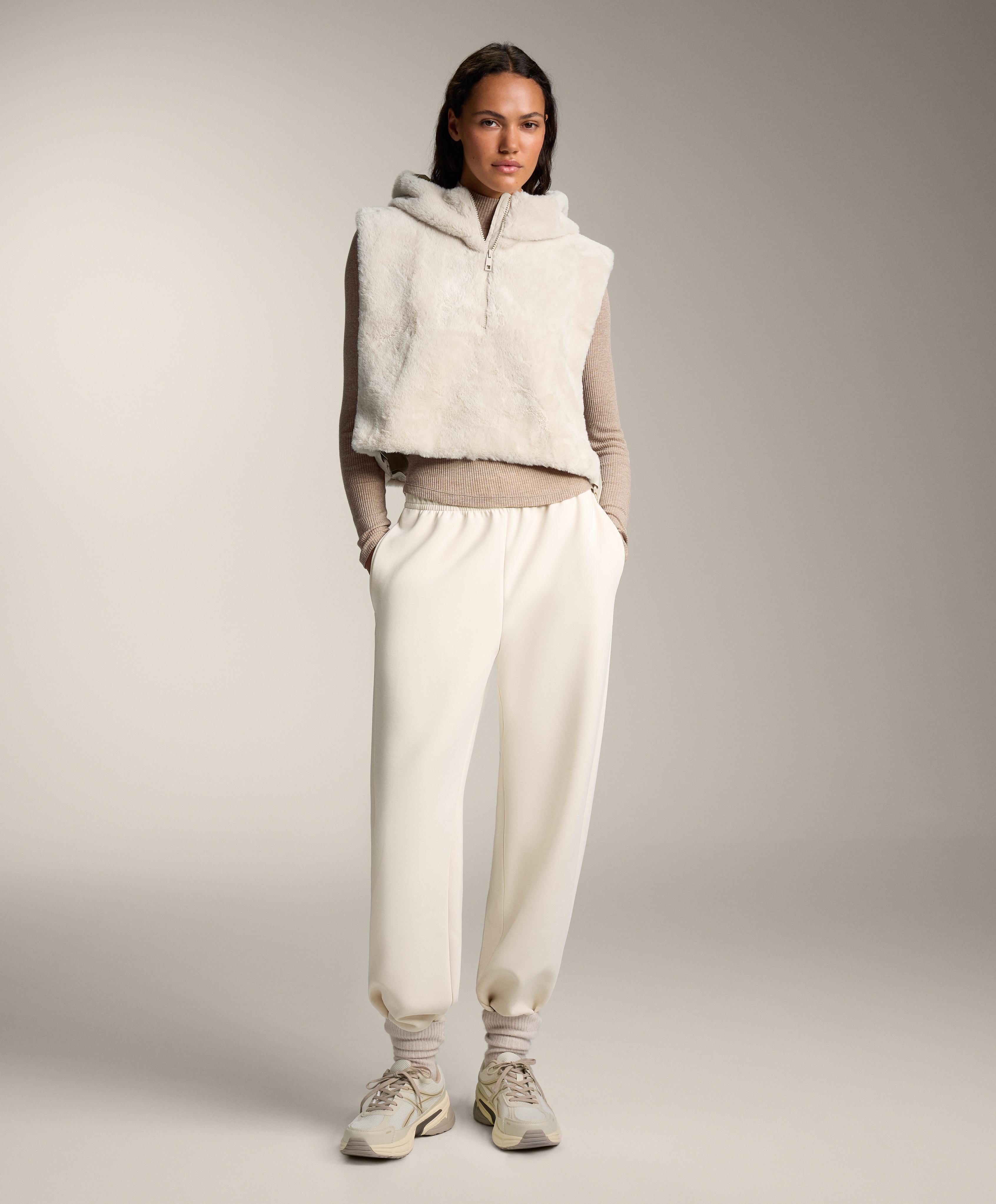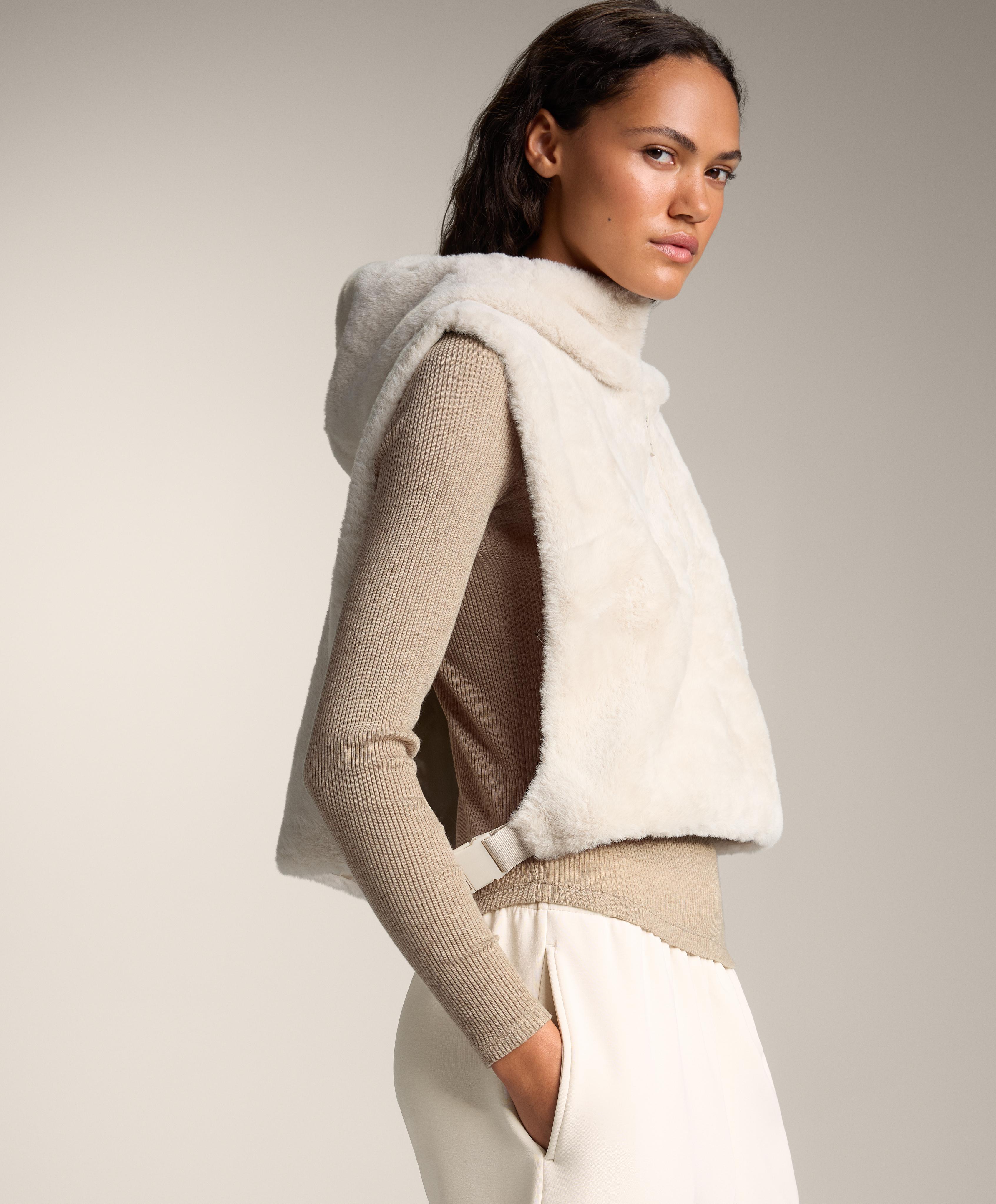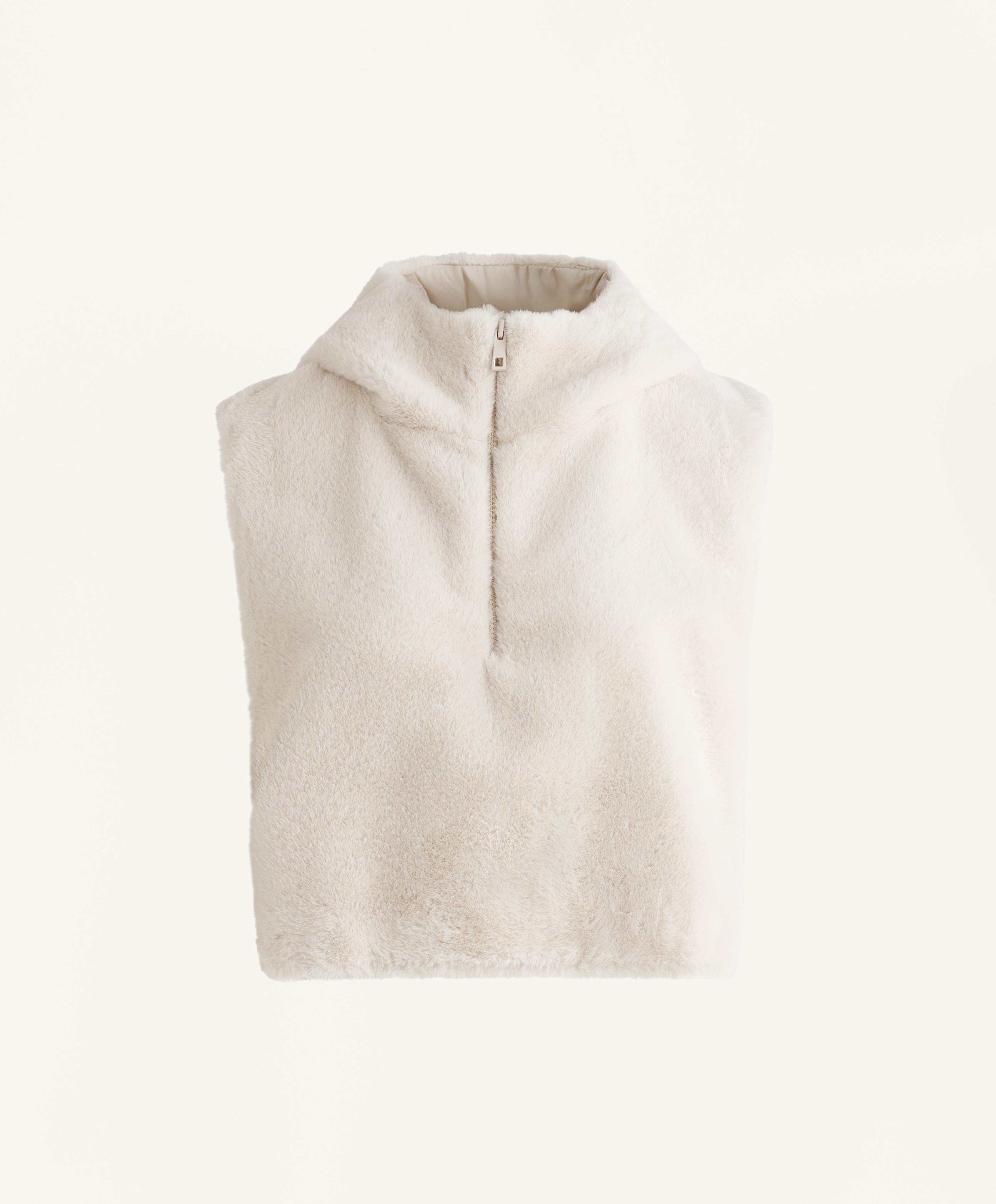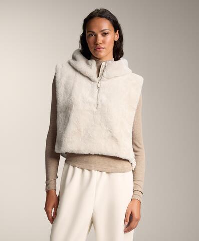 Жилет из искусственного меха с регулируемым капюшоном. Высокий ворот с застежкой-молнией.