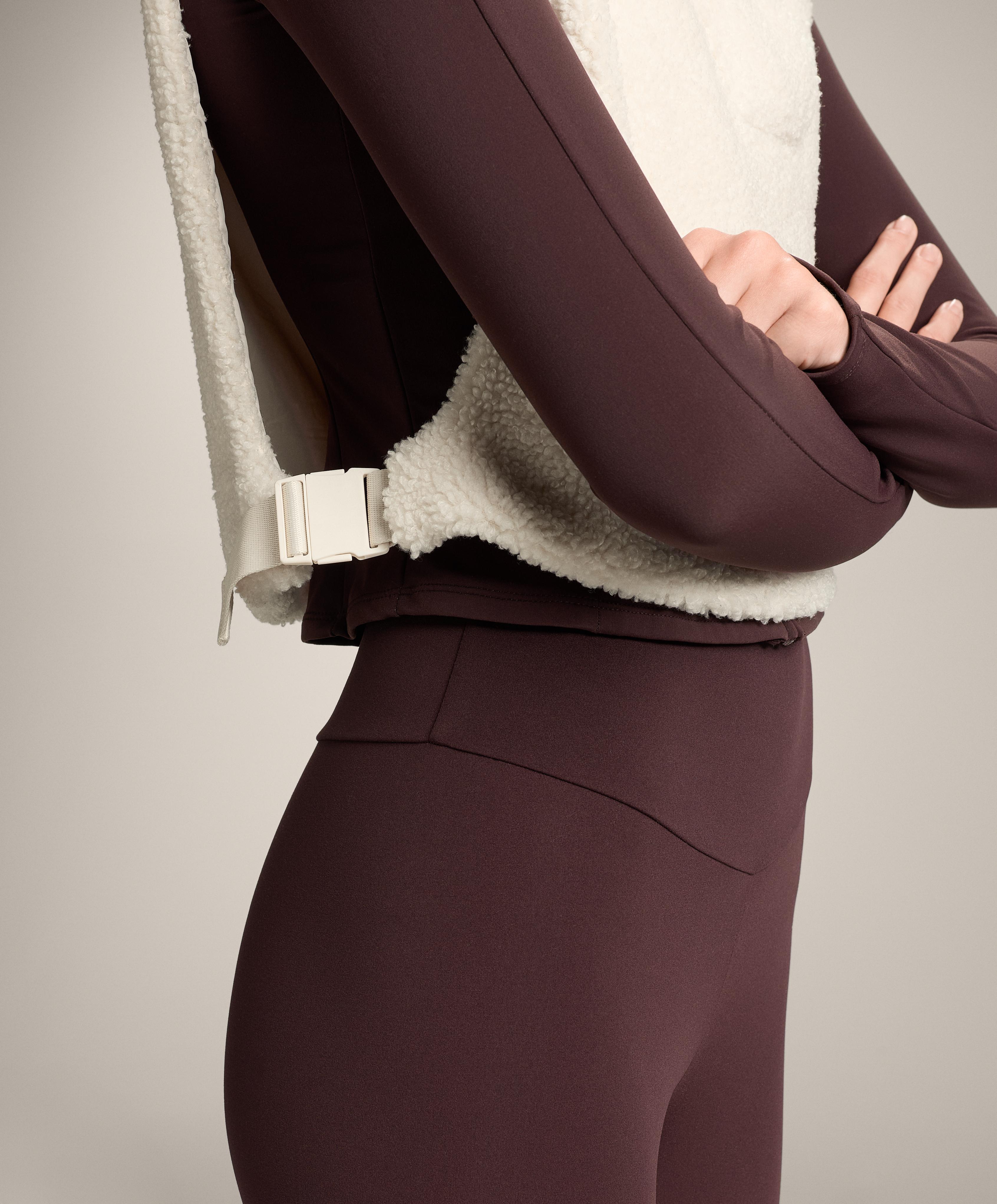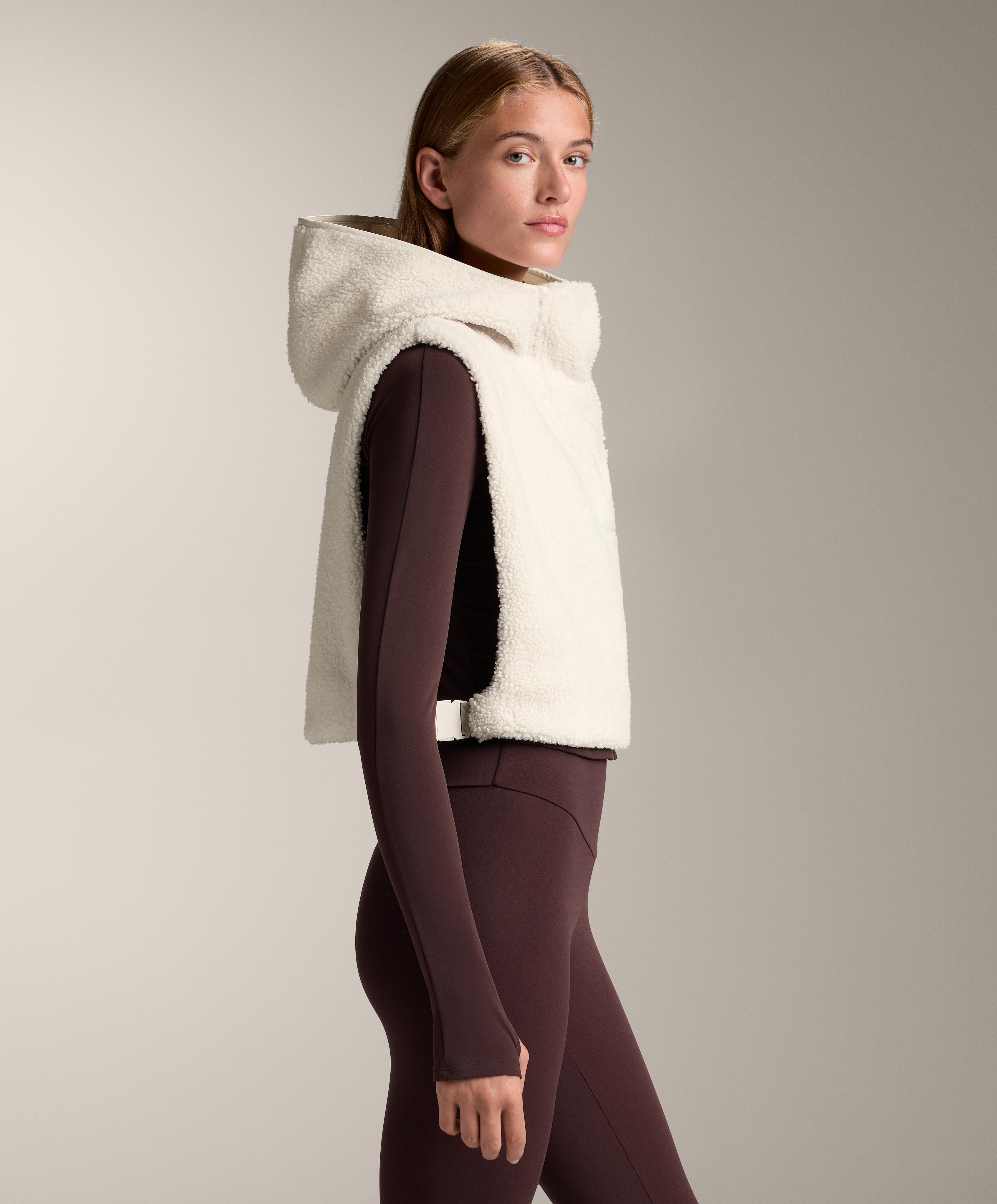 Жилет из искусственной овчины с регулируемым капюшоном. Высокий воротник с застежкой на потайные кнопки.