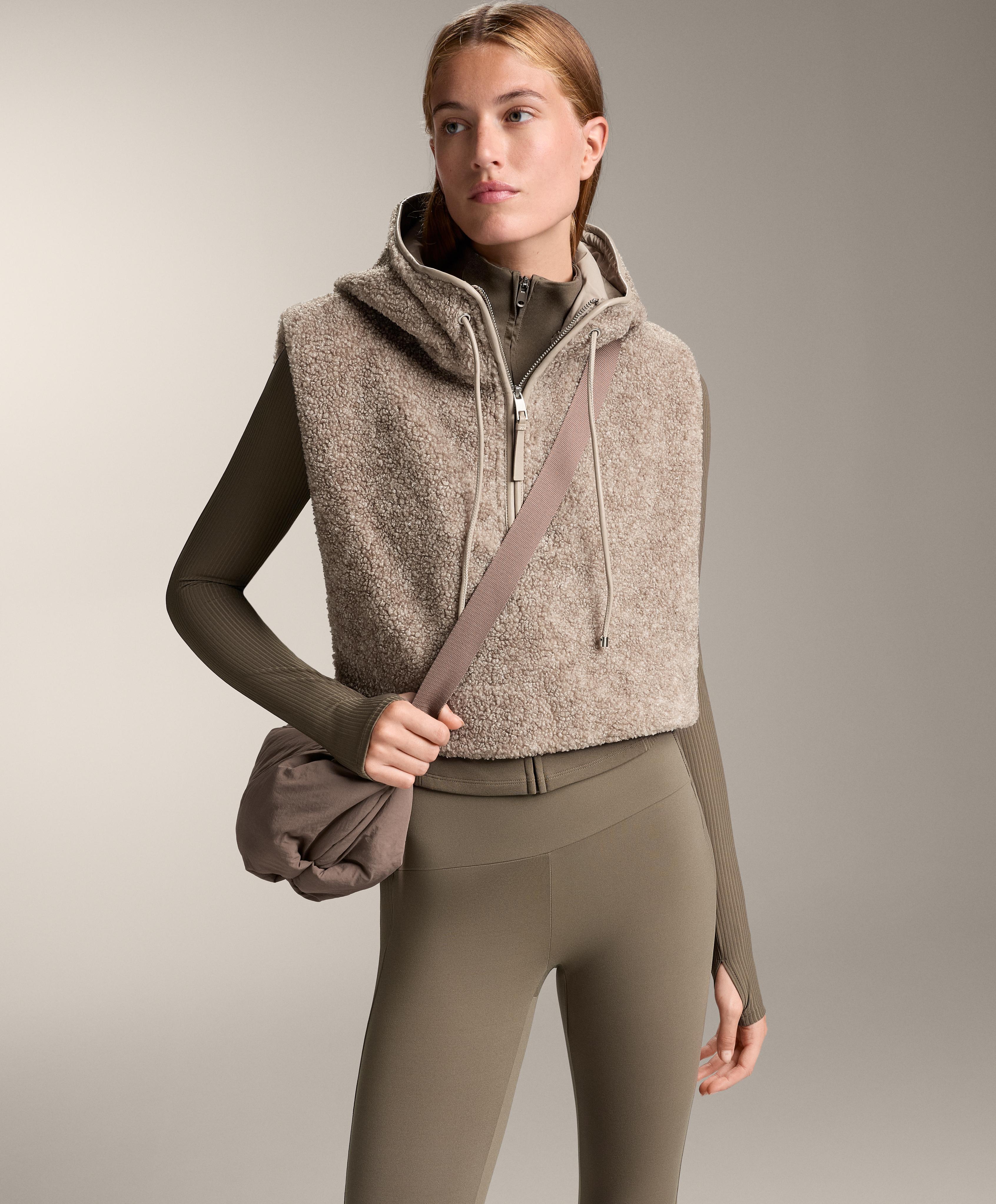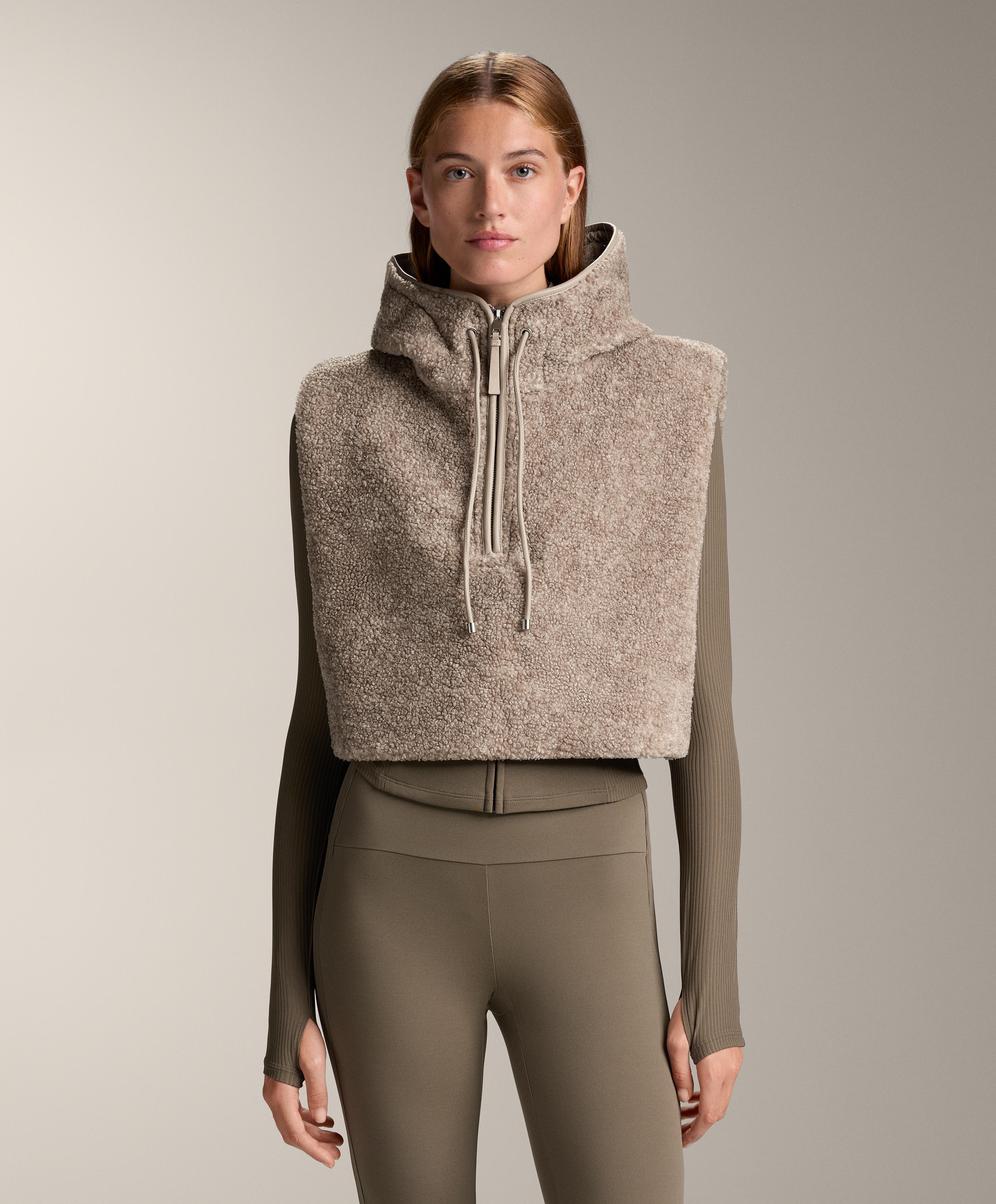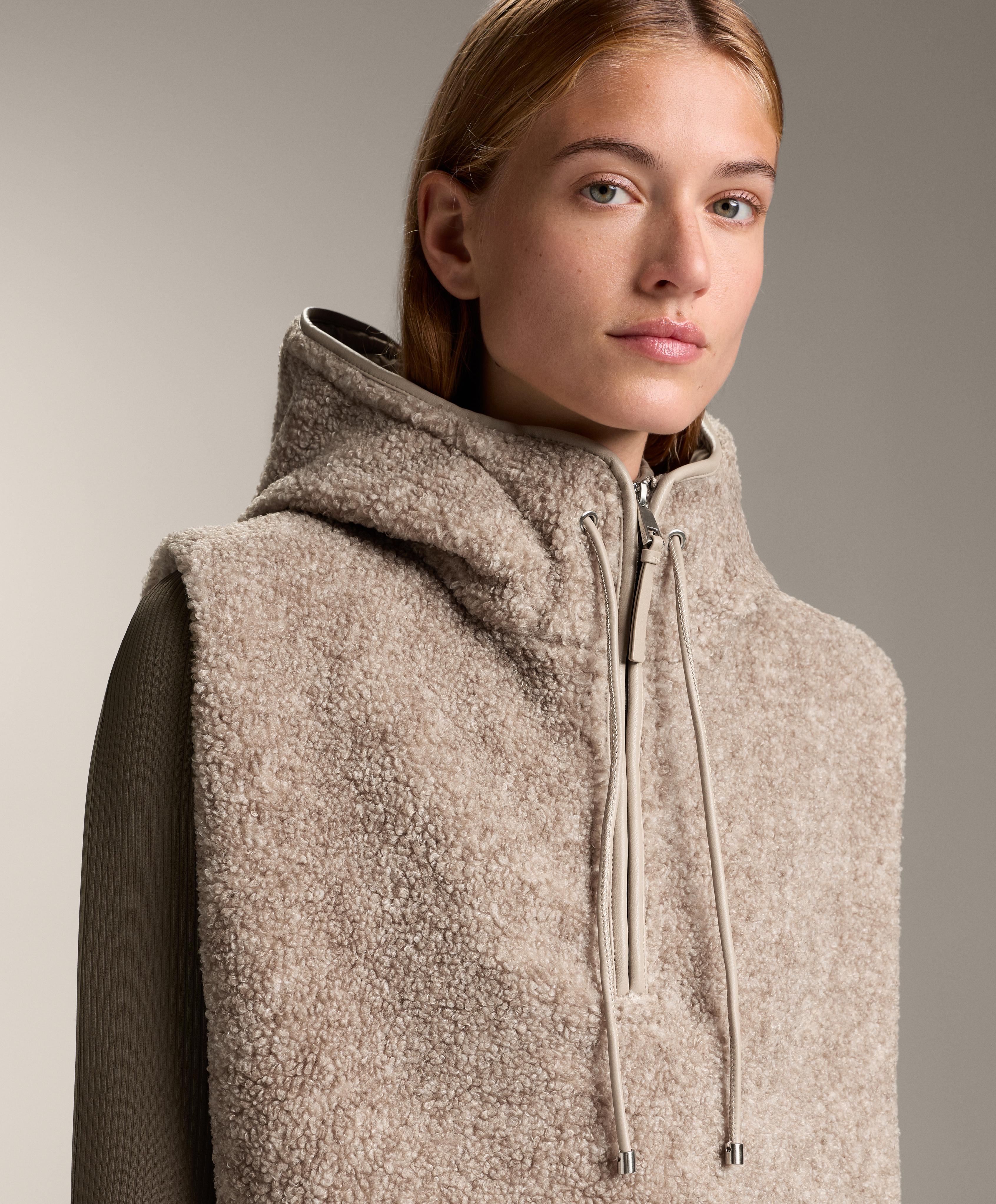 Жилет из ткани под овчину с регулируемым капюшоном. Высокий воротник с застежкой-молнией.