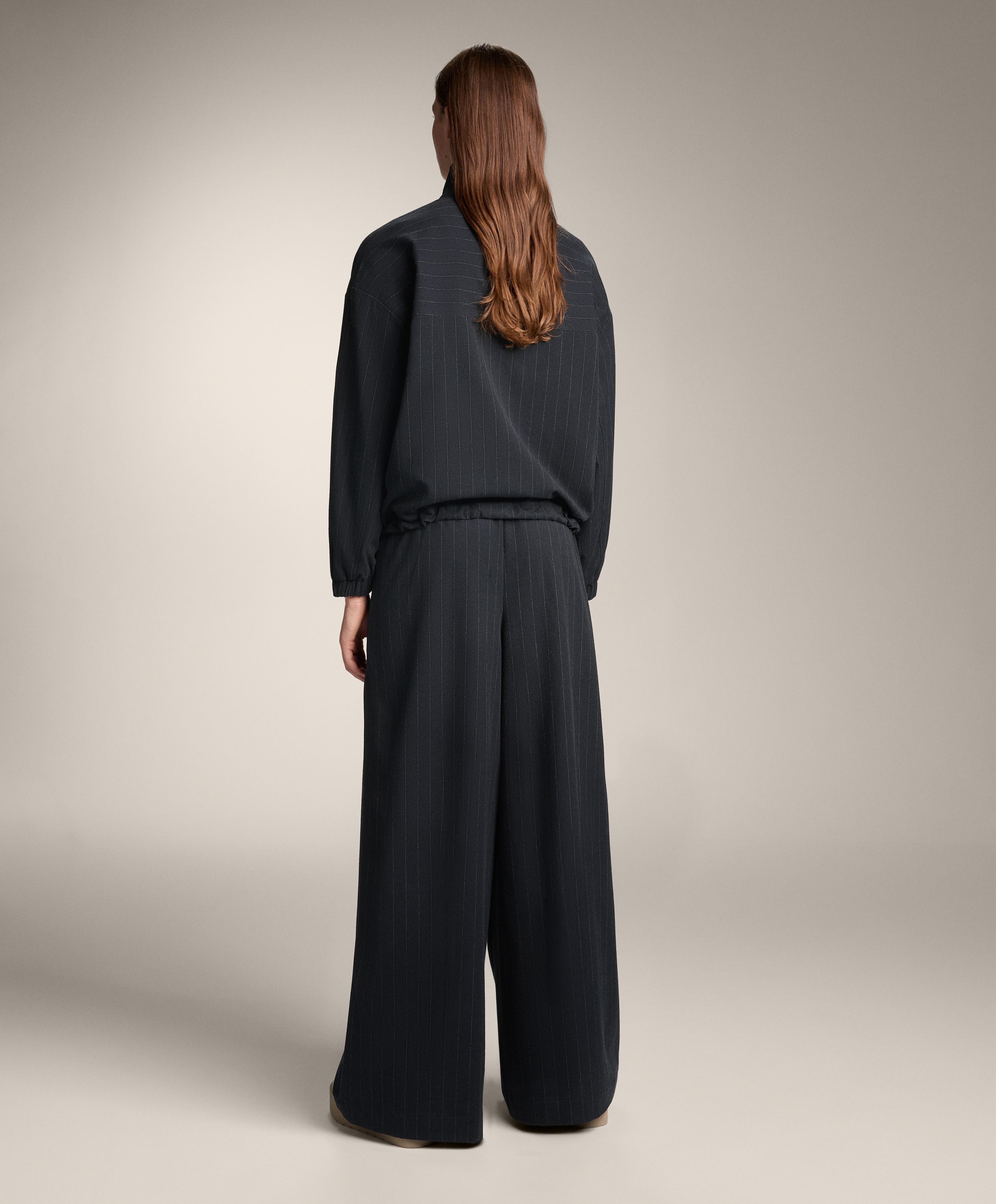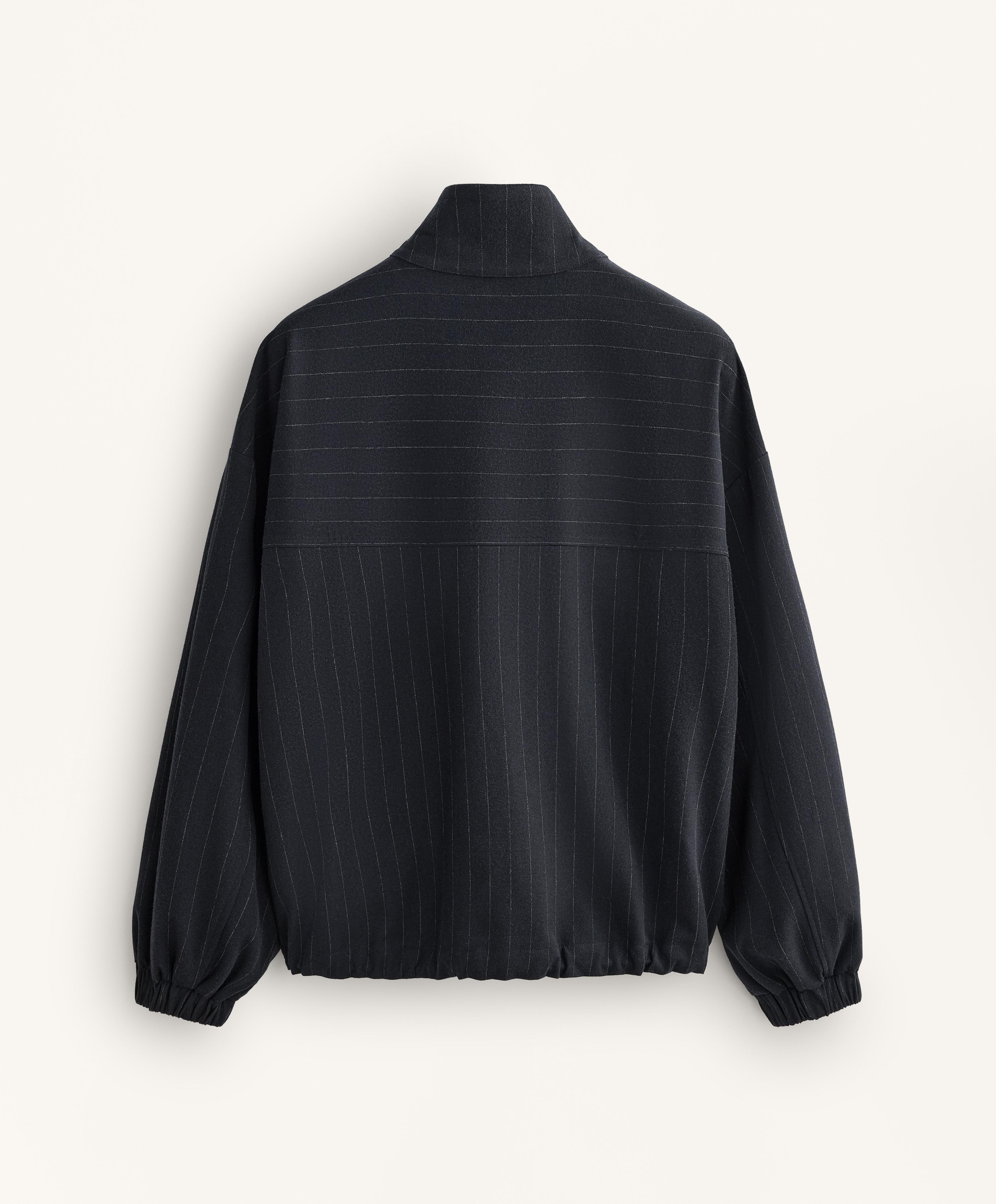 Структурированный жакет в тонкую полоску. С воротником-стойкой и застежкой-молнией спереди. Эластичные манжеты и приталенный низ.