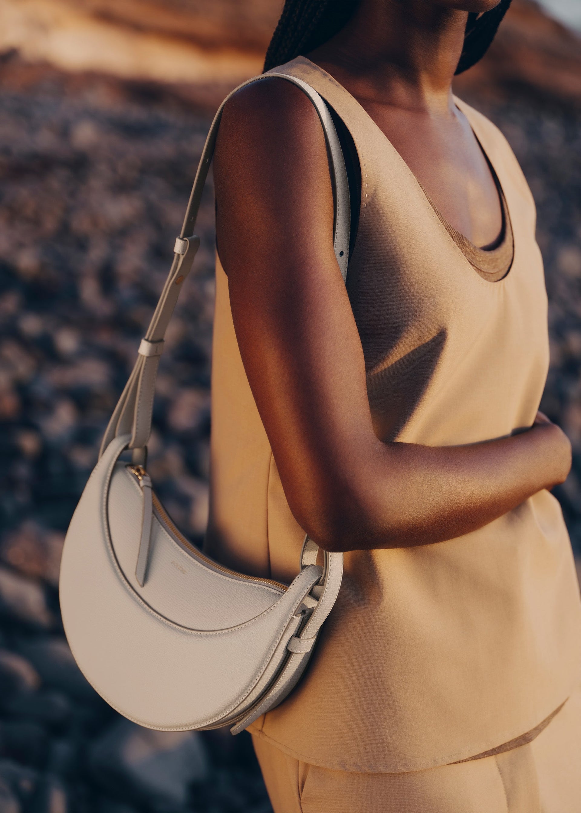 Благодаря своей округлой форме, поролоновой подкладке и швам, сшитым вручную, модель Numéro Dix черпает вдохновение в конной амуниции. Ее дизайн в форме полумесяца играет с перекрывающимися изгибами.