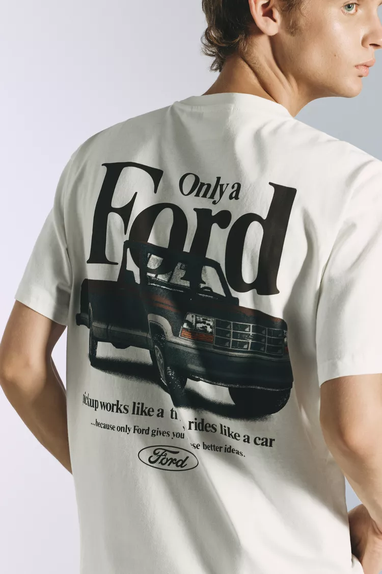 Футболка с коротким рукавом и графическим рисунком спереди и сзади, круглым вырезом, изготовлена из хлопка, с номерным знаком Ford.