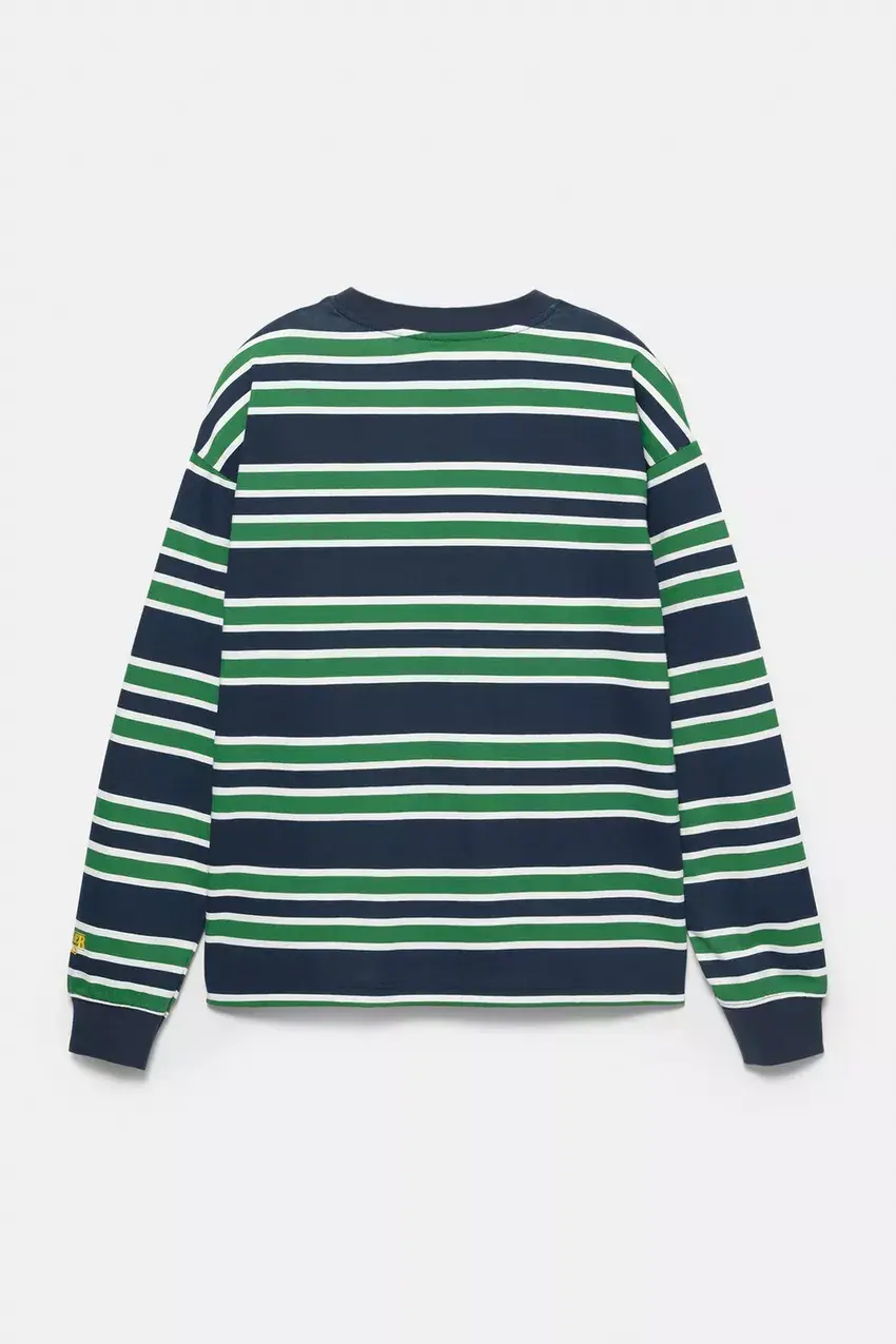 Полосатая хлопковая футболка с длинными рукавами и логотипом "Очень странные дела", с круглым вырезом и контрастной графической деталью.