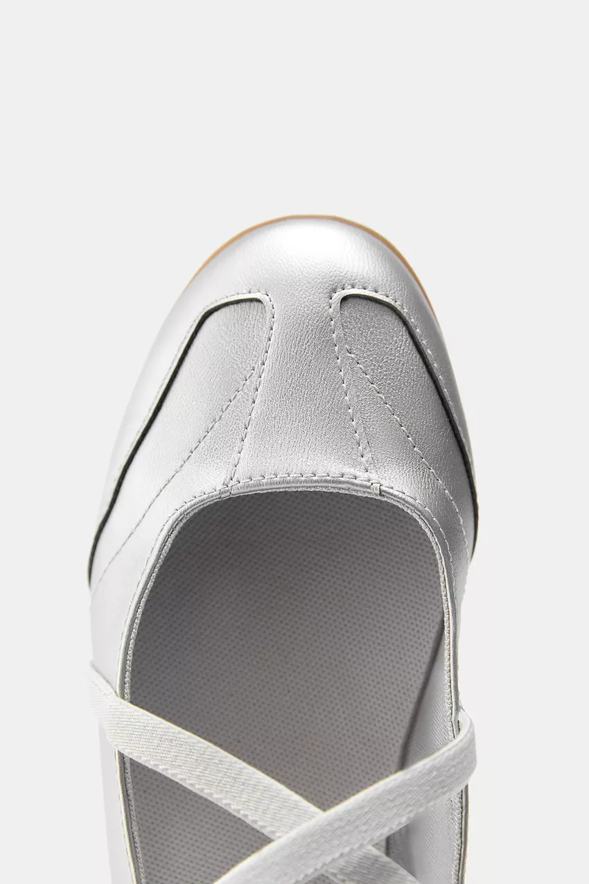 Балетки серебристого металлического цвета. С перекрещивающимися ремешками спереди. С закругленным носком.