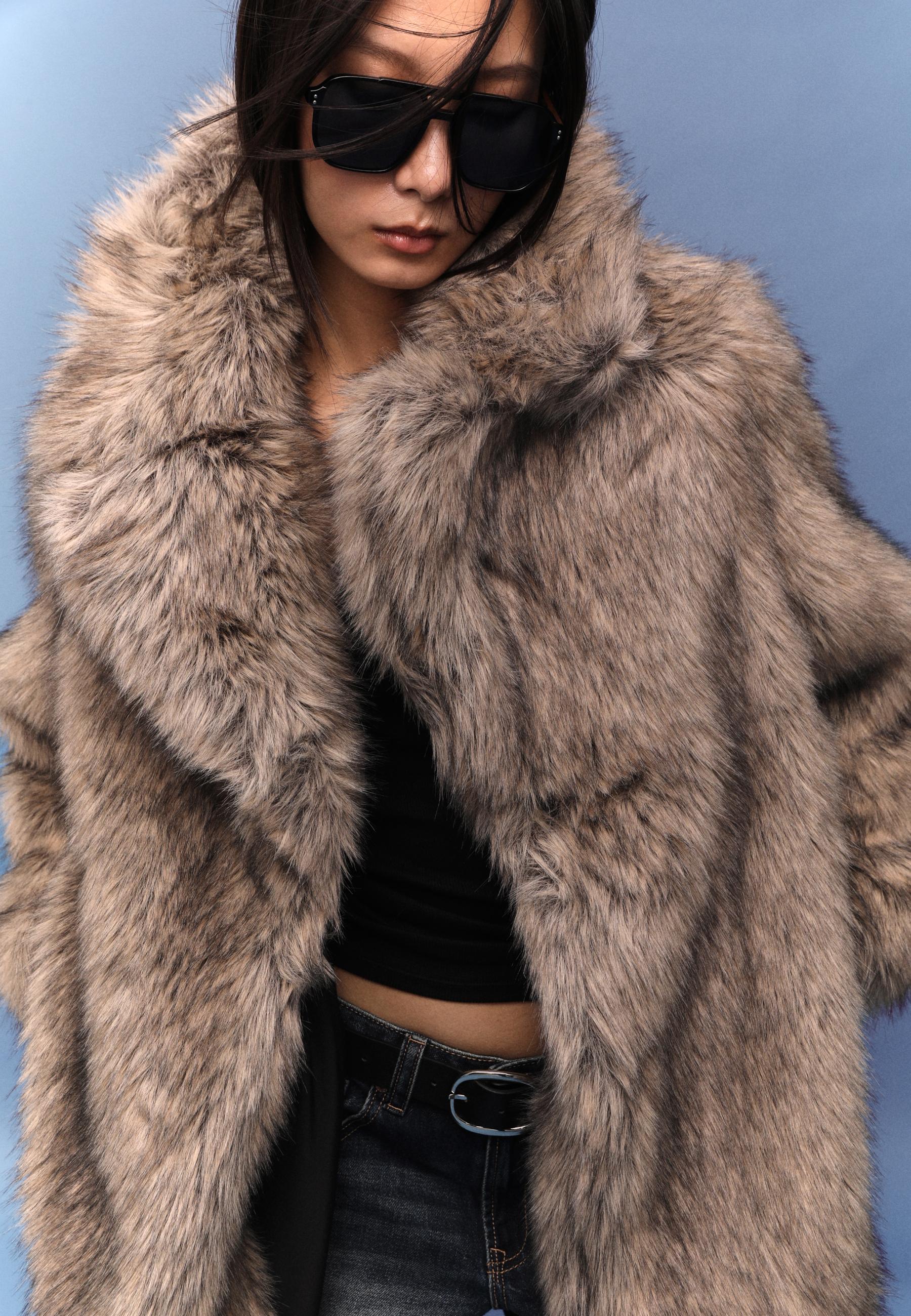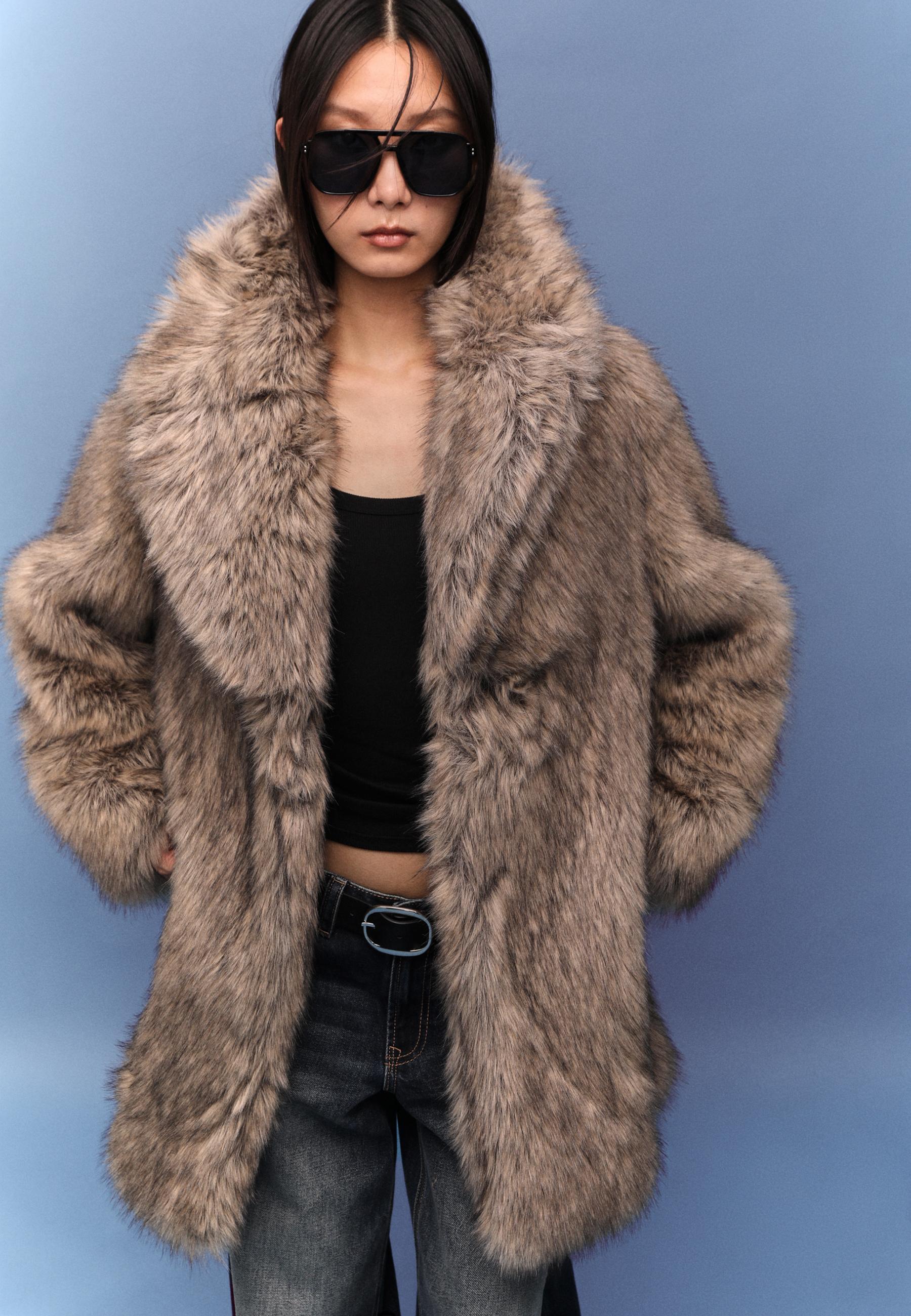 Длинное пальто прямого кроя из мягкого на ощупь искусственного меха с принтом.