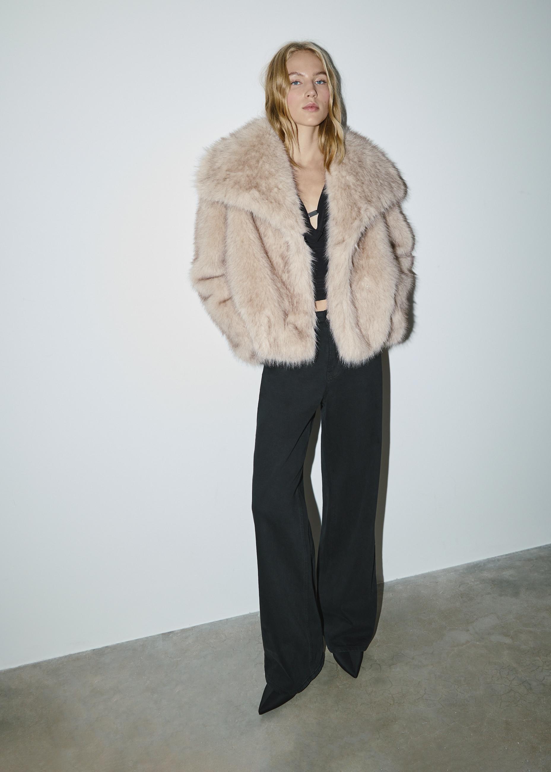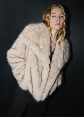 Короткая шуба из искусственного меха. Воротник с лацканами, длинные рукава.