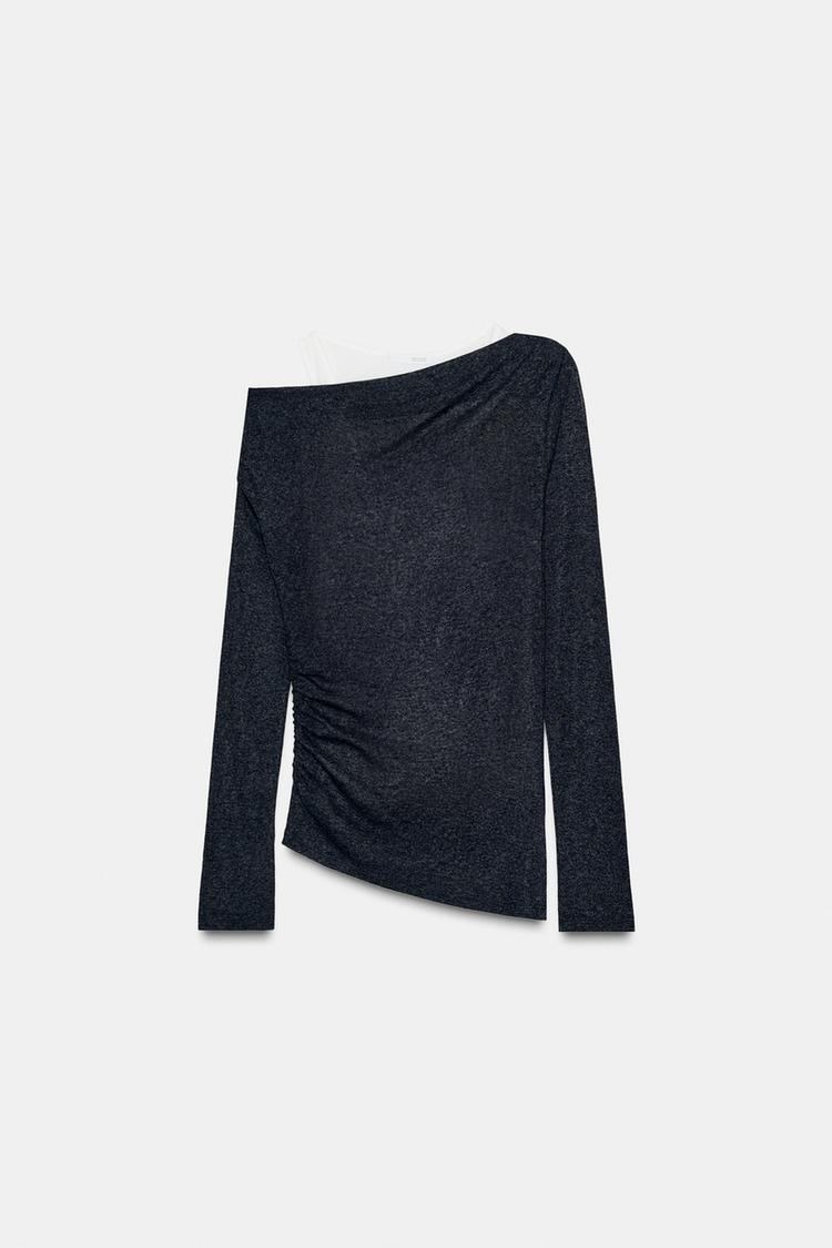 ZARA АСИММЕТРИЧНАЯ ФУТБОЛКА С ЭФФЕКТОМ ДВОЙНОЙ ТКАНИ, ТЕМНЫЙ АНТРАЦИТ
