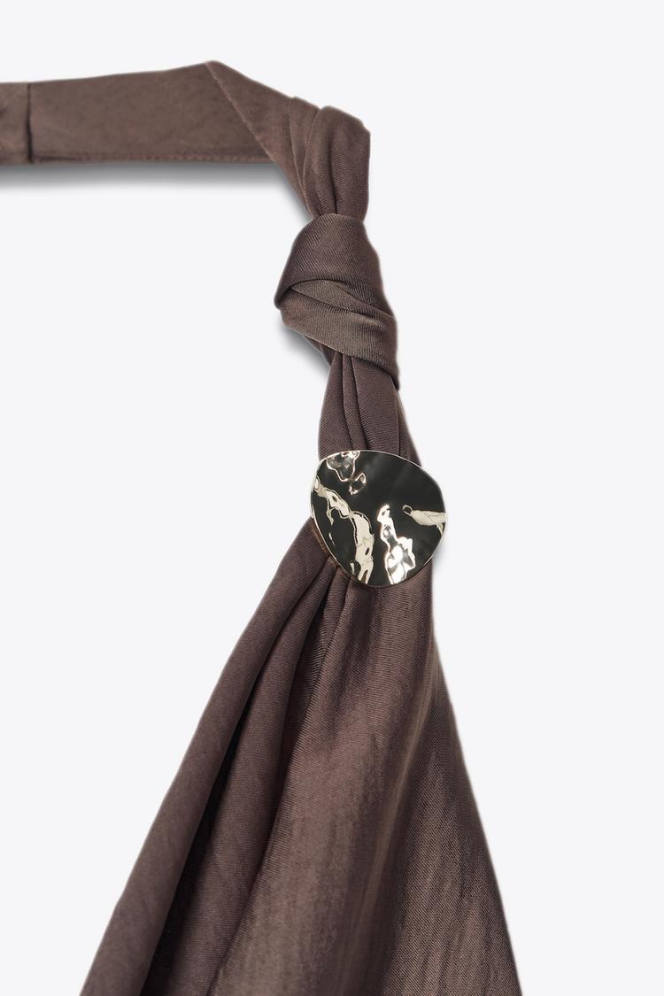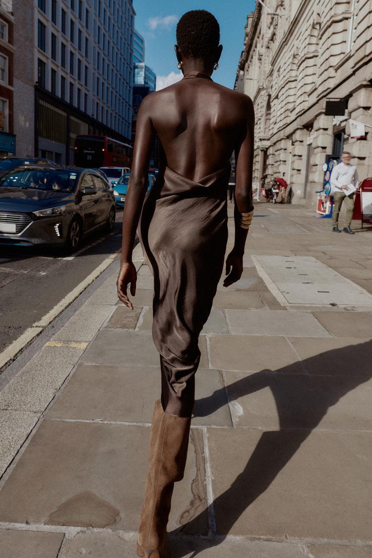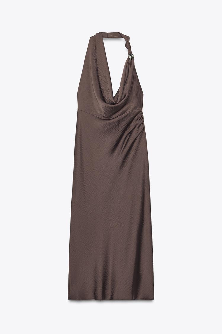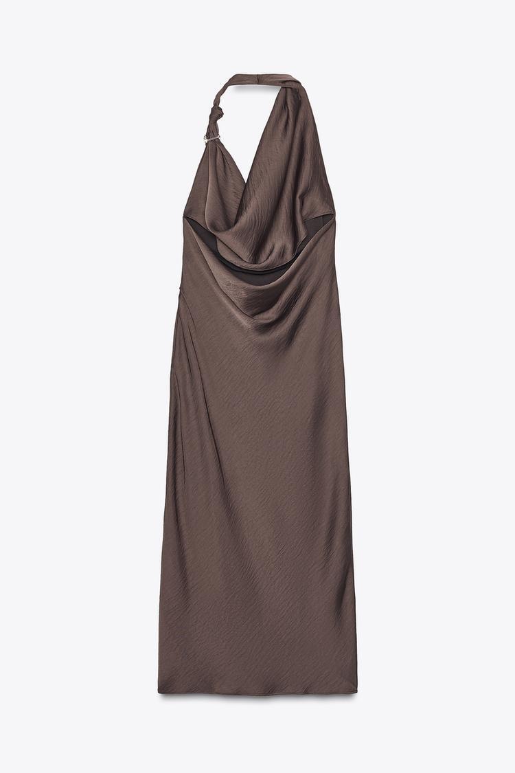 ZARA АСИММЕТРИЧНОЕ АТЛАСНОЕ ПЛАТЬЕ МИДИ, КОРИЧНЕВЫЙ