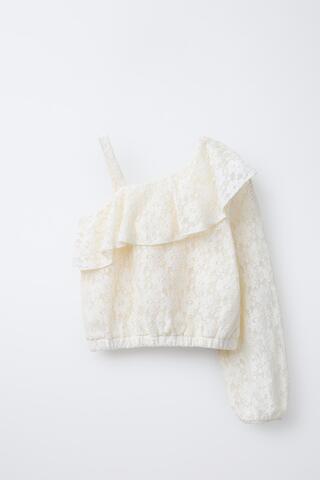Топ с асимметричным вырезом, бретелькой и длинным рукавом на резинке. Отделка оборкой и кружевным принтом.