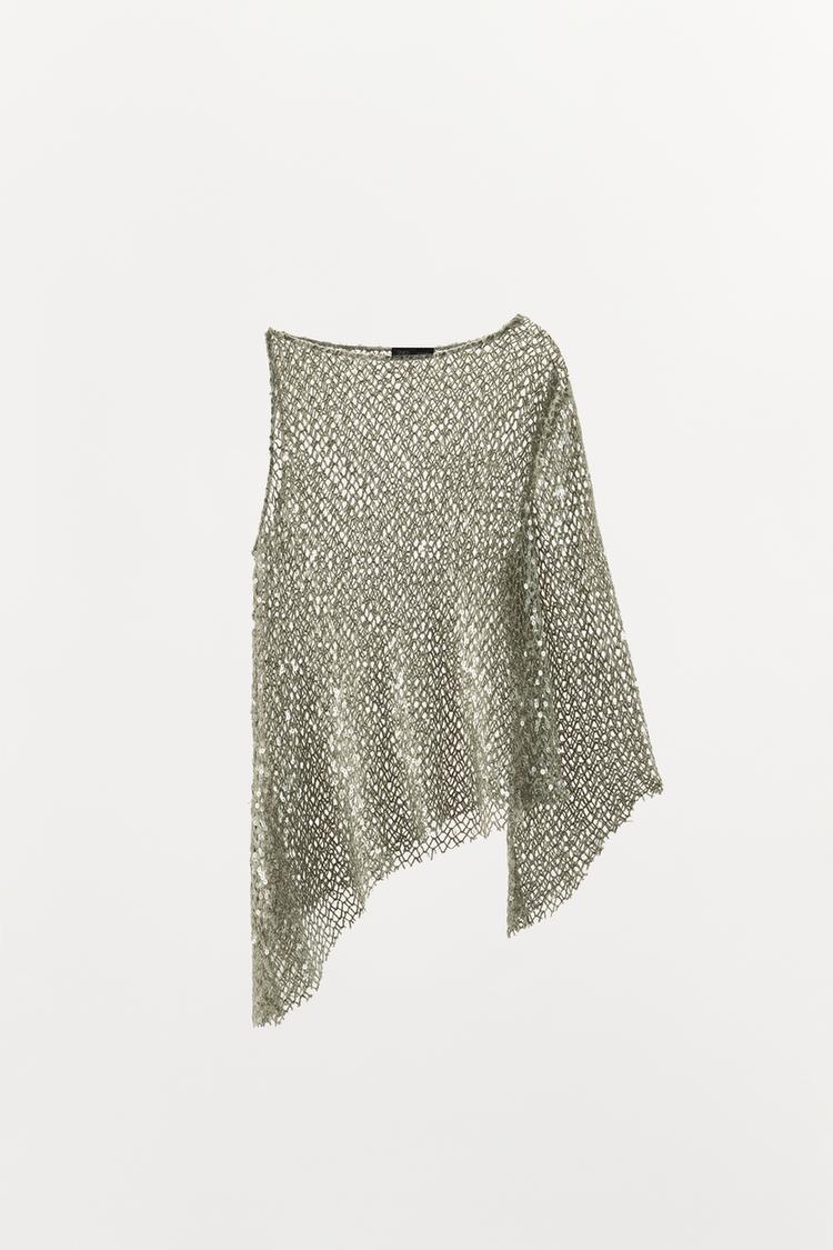 Полупрозрачный топ с вырезом-лодочкой. Один рукав без плеча, другой длинный, расклешенный. Декоративная отделка контрастными пайетками. Асимметричный низ.