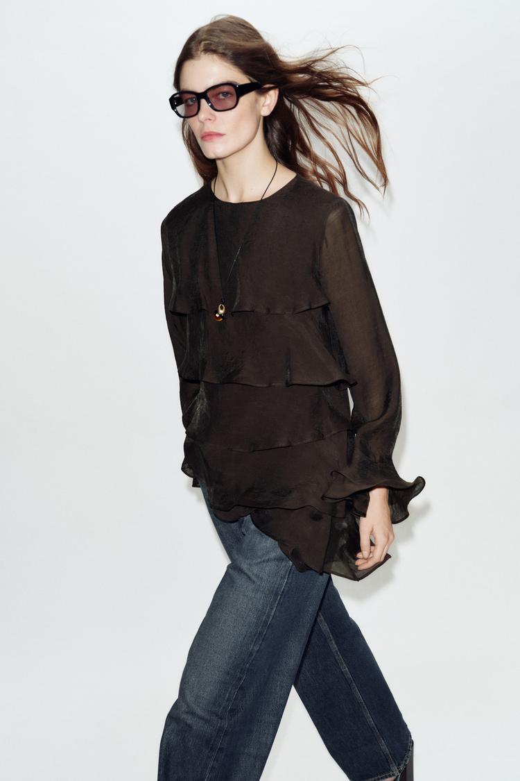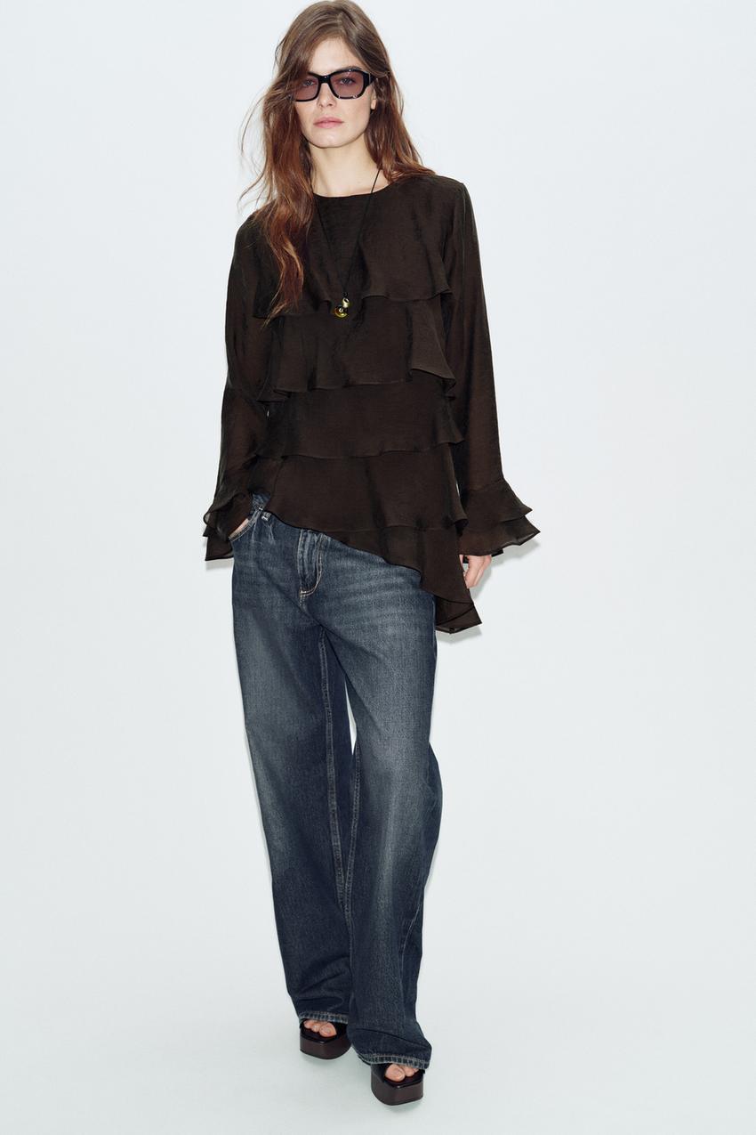 ZARA АСИММЕТРИЧНЫЙ ТОП С ВОЛАНАМИ, КОРИЧНЕВЫЙ