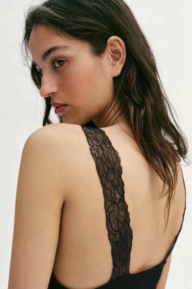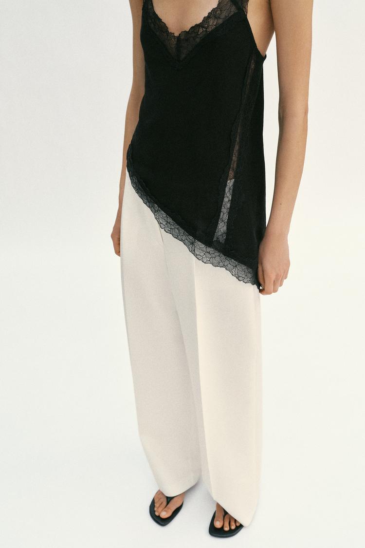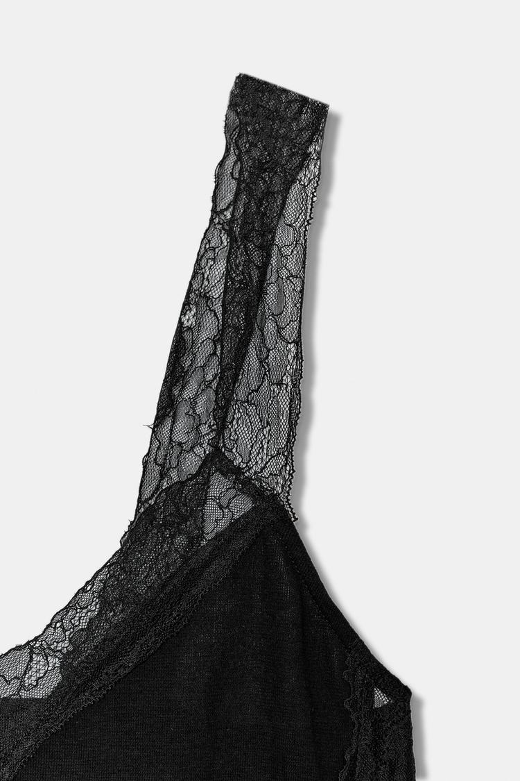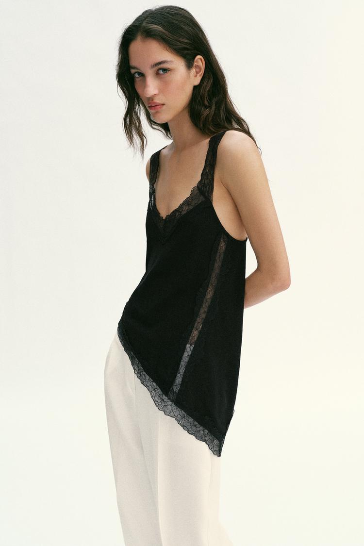 ZARA АСИММЕТРИЧНЫЙ ТОП В СТИЛЕ РУСТИК С КРУЖЕВОМ, ЧЕРНЫЙ