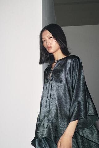 Рубашка с круглым вырезом и V-образным вырезом, регулируемым завязками. Рукава-накидки. Деталь из жатой атласной ткани. Асимметричный низ.