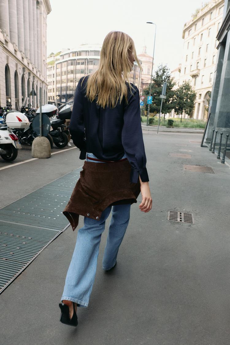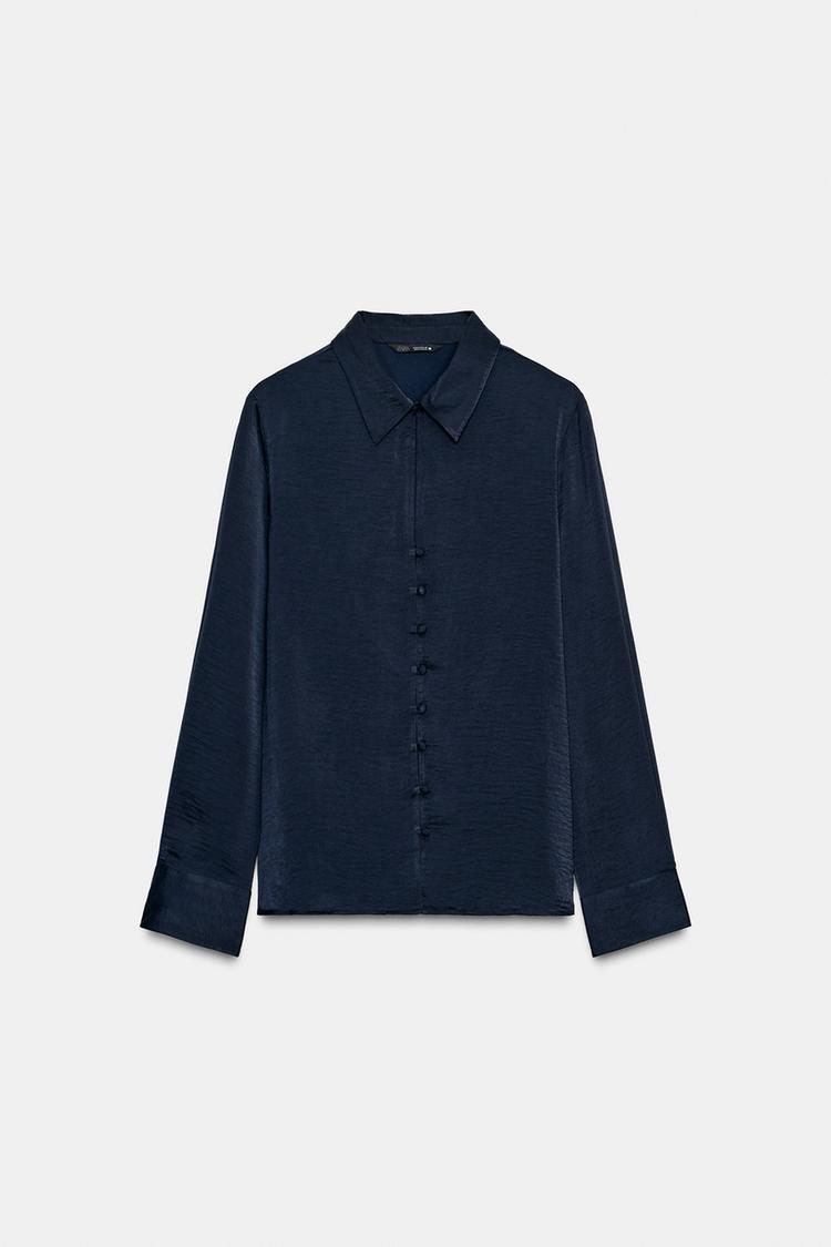 ZARA АТЛАСНАЯ РУБАШКА С РАЗРЕЗОМ, МОРСКОЙ СИНИЙ