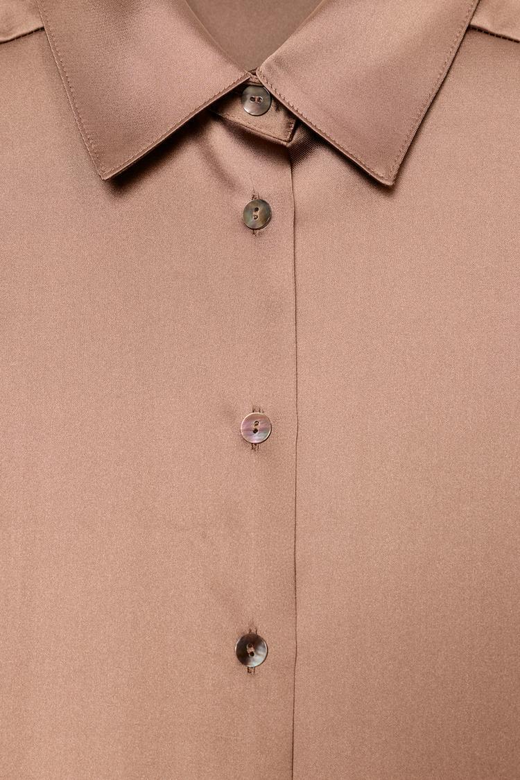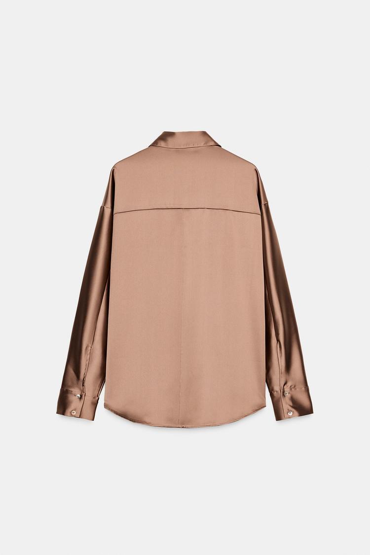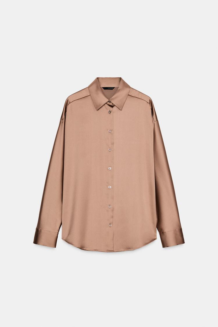 ZARA АТЛАСНАЯ РУБАШКА СО СПУЩЕННЫМ ПЛЕЧОМ, МЯГКИЙ КАШТАНОВЫЙ